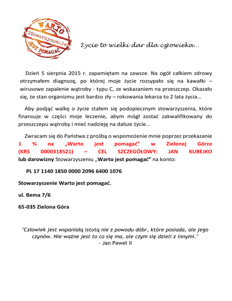 Życie to wielki dar dla człowieka… Dzień 5 sierpnia 2015 r. zapamiętam na zawsze. Na ogół całkiem zdrowy otrzymałem diagnozę, po której moje życie rozsypało się na kawałki – wirusowe zapalenie wątroby - typu C, ze wskazaniem na przeszczep. Okazało się, że stan organizmu jest bardzo zły – rokowania lekarza to 2 lata życia… Aby podjąć walkę o życie stałem się podopiecznym stowarzyszenia, które finansuje w części moje leczenie, abym mógł zostać zakwalifikowany do przeszczepu wątroby i mieć nadzieję na dalsze życie… Zwracam się do Państwa z prośbą o wspomożenie mnie poprzez przekazanie 1 % na „Warto jest pomagać” w Zielonej Górze (KRS 0000318521) – CEL SZCZEGÓŁOWY: JAN KUBEJKO lub darowizny Stowarzyszeniu „Warto jest pomagać” na konto: PL 17 1140 1850 0000 2096 6400 1076 Stowarzyszenie Warto jest pomagać. ul. Bema 7/6 65-035 Zielona Góra "Człowiek jest wspaniałą istotą nie z powodu dóbr, które posiada, ale jego czynów. Nie ważne jest to co się ma, ale czym się dzieli z innymi." - Jan Paweł II