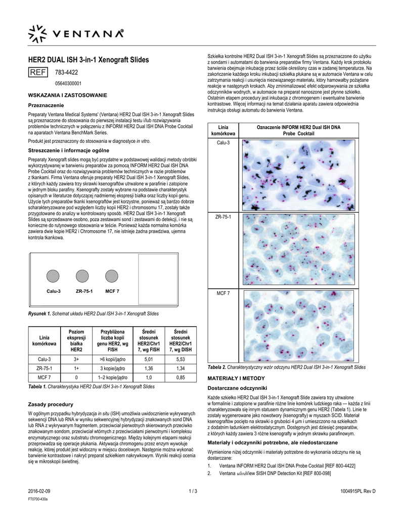 HER2 DUAL ISH 3-in-1 Xenograft Slides 783-4422 05640300001 WSKAZANIA I ZASTOSOWANIE Przeznaczenie Preparaty Ventana Medical Systems' (Ventana) HER2 Dual ISH 3-in-1 Xenograft Slides są przeznaczone do stosowania do pierwszej instalacji testu i/lub rozwiązywania problemów technicznych w połączeniu z INFORM HER2 Dual ISH DNA Probe Cocktail na aparatach Ventana BenchMark Series. Szkiełka kontrolne HER2 Dual ISH 3-in-1 Xenograft Slides są przeznaczone do użytku z sondami i automatami do barwienia preparatów firmy Ventana. Każdy krok protokołu barwienia obejmuje inkubację przez ściśle określony czas w zadanej temperaturze. Na zakończenie każdego kroku inkubacji szkiełka płukane są w automacie Ventana w celu zatrzymania reakcji i usunięcia niezwiązanego materiału, który hamowałby pożądane reakcje w następnych krokach. Aby zminimalizować efekt odparowywania ze szkiełka odczynników wodnych, w automacie na preparat nanoszone jest płynne szkiełko. Ostatnim etapem procedury jest inkubacja z chromogenem i ewentualne barwienie kontrastowe. Więcej informacji na temat działania aparatu zawiera odpowiednia instrukcja obsługi automatu do barwienia Ventana. Linia komórkowa Produkt jest przeznaczony do stosowania w diagnostyce in vitro. Oznaczenie INFORM HER2 Dual ISH DNA Probe Cocktail Calu-3 Streszczenie i informacje ogólne Preparaty Xenograft slides mogą być przydatne w podstawowej walidacji metody obróbki wykorzystywanej w barwieniu preparatów za pomocą INFORM HER2 Dual ISH DNA Probe Cocktail oraz do rozwiązywania problemów technicznych w razie problemów z tkankami. Firma Ventana oferuje preparaty HER2 Dual ISH 3-in-1 Xenograft Slides, z których każdy zawiera trzy skrawki ksenograftów utrwalone w parafinie i zatopione w jednym bloku parafiny. Ksenografty zostały wybrane na podstawie charakterystyk opisanych w literaturze dotyczącej nadmiernej ekspresji białka oraz liczby kopii genu. Użycie tych preparatów tkanki ksenograftów jest korzystne, ponieważ są bardzo dobrze scharakteryzowane pod względem liczby kopii HER2 i chromosomu 17, zostały także przygotowane do analizy w kontrolowany sposób. HER2 Dual ISH 3-in-1 Xenograft Slides są sprzedawane osobno, poza zestawami sond i zestawami do detekcji, i nie są konieczne do rutynowego stosowania w teście. Ponieważ każda normalna komórka zawiera dwie kopie HER2 i Chromosome 17, nie istnieje żadna prawdziwa, ujemna kontrola tkankowa. Calu-3 ZR-75-1 ZR-75-1 MCF 7 MCF 7 Rysunek 1. Schemat układu HER2 Dual ISH 3-in-1 Xenograft Slides Linia komórkowa Poziom ekspresji białka HER2 Przybliżona liczba kopii genu HER2, wg FISH Średni stosunek HER2/Chr1 7, wg FISH Średni stosunek HER2/Chr1 7, wg DISH Calu-3 3+ >6 kopii/jądro 5,01 5,53 ZR-75-1 1+ 3 kopie/jądro 1,36 1,34 Tabela 2. Charakterystyczny wzór odczynu HER2 Dual ISH 3-in-1 Xenograft Slides MCF 7 0 1–2 kopie/jądro 1,0 0,85 MATERIAŁY I METODY Tabela 1. Charakterystyka HER2 Dual ISH 3-in-1 Xenograft Slides Dostarczane odczynniki Zasady procedury W ogólnym przypadku hybrydyzacja in situ (ISH) umożliwia uwidocznienie wykrywanych sekwencji DNA lub RNA w wyniku sekwencyjnej hybrydyzacji znakowanych sond DNA lub RNA z wykrywanym fragmentem, przeciwciał pierwotnych skierowanych przeciwko znakowanym sondom, przeciwciał wtórnych z przeciwciałami pierwotnymi i kompleksu enzymatycznego oraz substratu chromogenicznego. Między kolejnymi etapami reakcji przeprowadza się operacje płukania. Aktywacja chromogenu przez enzym wywołuje reakcję, której produkt jest widoczny w miejscu docelowym. Następnie można wykonać barwienie kontrastowe i nakryć preparat szkiełkiem nakrywkowym. Wyniki reakcji ocenia się w mikroskopii świetlnej. 2016-02-09 FT0700-430a 1/3 Każde szkiełko HER2 Dual ISH 3-in-1 Xenograft Slide zawiera trzy utrwalone w formalinie i zatopione w parafinie różne linie komórek ludzkiego raka — każda z linii charakteryzowała się innym statusem dynamicznym genu HER2 (Tabela 1). Linie te zostały wygenerowane jako nowotwory (ksenografty) w myszach SCID. Materiał ksenograftów pocięto na skrawki o grubości 4 µm i umieszczono na szkiełkach z dodatnim ładunkiem elektrostatycznym. Dostępnych jest dziesięć preparatów, z których każdy zawiera 3 różne ksenografty w jednym skrawku parafinowym. Materiały i odczynniki potrzebne, ale niedostarczane Wymienione niżej odczynniki i materiały potrzebne do wykonania odczynu nie są dostarczane: 1. 2. Ventana INFORM HER2 Dual ISH DNA Probe Cocktail [REF 800-4422] Ventana ultraView SISH DNP Detection Kit [REF 800-098] 1004915PL Rev D 3. 4. 5. 6. 7. 8. 9. 10. 11. 12. 13. 14. 15. 16. 17. 18. 19. 20. 21. 22. 23. 24. 25. 26. 27. Ventana ultraView Red ISH DIG Detection Kit [REF 800-505] Ventana HybReady Solution [REF 780-4409] Ventana ultraView Silver Wash II [REF 780-003 lub odpowiednik] Ventana ISH Protease 2 [REF 780-4148]* Ventana ISH Protease 3 [REF 780-4149]* Ventana Hematoxylin II Counterstain [REF 790-2208]* Ventana Bluing Reagent [REF 760-2037]* Ventana Reaction Buffer (10X) [REF 950-300] Ventana SSC (10X) [REF 950-110] Ventana EZ Prep Reagent (10X) [REF 950-102] Ventana Cell Conditioning 2 (Pre-dilute) [REF 950-123] Ventana ULTRA CC2 (Pre-dilute) [REF 950-223] Ventana Liquid Coverslip (High Temperature) Odczynnik [REF 650-010] Ventana ULTRA LCS [REF 650-210] Automat do barwienia preparatów BenchMark Series Etykiety z kodami kreskowymi Ksylen (klasy histologicznej) Woda dejonizowana lub destylowana Środek do trwałego nakrywania preparatów (Permount Fisher, nr kat. SP15-500 lub równoważnik) Szkiełka nakrywkowe (wystarczające do nakrycia skrawków tkanek: takie jak VWR nr kat. 48393-60 lub równoważne) Aparat do nakrywania szkiełkami nakrywkowymi (taki jak Tissue-Tek SCA) Naczynia lub łaźnia do barwienia Minutnik (pomiar w odstępach 2–10 minut) Suszarka umożliwiająca utrzymanie temperatury 60°C Mikroskop świetlny * Zależnie od potrzeb w konkretnym zastos