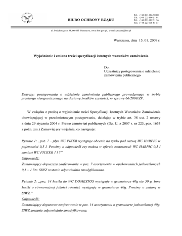 BIURO OCHRONY RZĄDU Tel. Tel. Tel. Fax (+48 22) 606 50 00 (+48 22) 606 51 01 (+48 22) 602 51 36 (+48 22) 606 51 07 ul. PodchorąŜych 38, 00-463 Warszawa, www.bor.gov.pl, e-mail: [email protected] Warszawa, dnia 15. 01. 2009 r. Wyjaśnienie i zmiana treści specyfikacji istotnych warunków zamówienia Do: Uczestnicy postępowania o udzielenie zamówienia publicznego Dotyczy: postępowania o udzielenie zamówienia publicznego prowadzonego w trybie przetargu nieograniczonego na dostawę środków czystości, nr sprawy 66/2008/ZP. W związku z prośbą o wyjaśnienie treści Specyfikacji Istotnych Warunków Zamówienia obowiązującej w przedmiotowym postępowaniu, działając w trybie art. 38 ust. 2 ustawy z dnia 29 stycznia 2004 r. Prawo zamówień publicznych (Dz. U. z 2007 r. nr 223, poz. 1655 z poźn. zm.) Zamawiający wyjaśnia, co następuje: Pytanie 1: „poz. 7 – płyn WC PIKER występuje obecnie na rynku pod nazwą WC HARPIC w pojemności 0,5 l. Prosimy o odpowiedź czy moŜna w ofercie zastosować WC HARPIC 0,5 l zamiast WC PICKER 1 l ?” Odpowiedź: Zamawiający dopuszcza zaoferowanie w poz. 7 asortymentu w opakowaniach jednostkowych 0,5 – 1 litr. SIWZ zostanie odpowiednio zmodyfikowana. Pytanie 2: „poz. 14 kostka do WC DOMESTOS występuje w gramaturze 40g nie 50 g. Inne kostki o równowaŜnej jakości równieŜ występują w gramaturze 40g. Prosimy o zmianę w SIWZ.” Odpowiedź: Zamawiający dopuszcza zaoferowanie w poz. 14 asortymentu o gramaturze jednostkowej 40g. SIWZ zostanie odpowiednio zmodyfikowana. Pytanie 3: „poz. 16 Ŝel Cillit do urządzeń sanitarnych występuje w gramaturze 420g lub w postaci płynu w pojemności 450 ml. Jedynie Cillit do WC występuje w pojemności 500 ml. Prosimy o określenie jaki powinien to być rodzaj Cillitu.” Odpowiedź: Zamawiający dopuszcza zaoferowanie w poz. 16 asortymentu o gramaturze jednostkowej 0,4-1 litr. SIWZ zostanie odpowiednio zmodyfikowana. Pytanie 4: „poz. 23. Zamawiający określił ręczniki ZZ – jako dwuwarstwowe celulozowe o szerokości 25 cm, a w następnej linijce – makulatura w opakowaniu …. Prosimy o sprecyzowanie czy ma to być ręcznik ZZ celulozowy czy makulaturowy.” Odpowiedź: Właściwym asortymentem w poz. 23 są „Ręczniki papierowe typu ZZ 2 warstwowe o szerokości 25 cm MAKULATURA w opakowaniu w granicach minimum 150 szt.”. SIWZ zostanie odpowiednio zmodyfikowana. Jednocześnie działając w trybie art. 38 ust. 4 ustawy z dnia 29 stycznia 2004 r. Prawo zamówień publicznych (Dz. U. z 2007 r. nr 223, poz. 1655 z poźn. zm.), Zamawiający dokonuje następujących zmian treści Specyfikacji Istotnych Warunków Zamówienia w przedmiotowym postępowaniu: 1. W załączniku nr 2 (druk formularza cenowego) w pozycji 7 sformułowanie ”w opakowaniach 1 litr” zamienia się na „w opakowaniach 0,5-1 litr”. 2. W załączniku nr 4 (Wzór umowy) w § 1 pkt. 1 w pozycji 7 sformułowanie ”w opakowaniach 1 litr” zamienia się na „w opakowaniach 0,5-1 litr”. 3. W pkt 3 SIWZ (opis przedmiotu zamówienia) w poz. 14 sformułowanie „o wadze 50g” zamienia się na „o wadze 40g”. 4. W załączniku nr 2 (druk formularza cenowego) w poz. 14 sformułowanie „o wadze 50g” zamienia się na „o wadze 40g”. 5. W załączniku nr 4 (Wzór umowy) w § 1 pkt. 1 w poz. 14 sformułowanie „o wadze 50g” zamienia się na „o wadze 40g”. 6. W pkt 3 SIWZ (opis przedmiotu zamówienia) w poz. 16 sformułowanie „o pojemności w granicach 0,5-1 litr” zamienia się na „o pojemności w granicach 0,4-1 litr”. 7. W załączniku nr 2 (druk formularza cenowego) w poz. 16 sformułowanie „o pojemności w granicach 0,5-1 litr” zamienia się na „o pojemności w granicach 0,4-1 litr”. 8. W załączniku nr 4 (Wzór umowy) w § 1 pkt. 1 w poz. 16 sformułowanie „o pojemności w granicach 0,5-1 litr” zamienia się na „o pojemności w granicach 0,4-1 litr”. 9. W załączniku nr 2 (druk formularza cenowego) w poz. 23 wykreśla się słowo „celuloza”. Nowe brzmienie pozycji: „Ręcznik papierowy typu ZZ 2 warstwowy o szerokości 25 cm makulatura w opakowaniu w granicach minimum 150 szt.” 10. W załączniku nr 4 (Wzór umowy) w § 1 pkt. 1 w poz. 23 wykreśla się słowo „celuloza”. Nowe brzmienie pozycji: „Ręcznik papierowy typu ZZ 2 warstwowy o szerokości 25 cm makulatura w opakowaniu w granicach minimum 150 szt.”