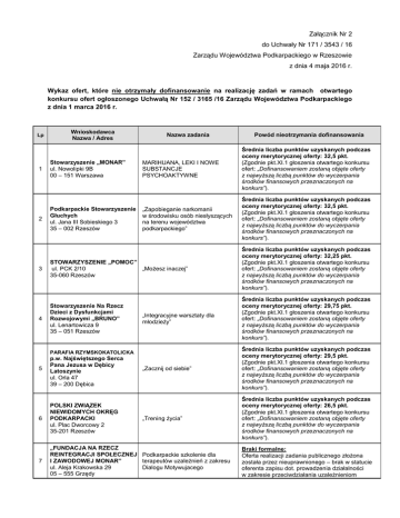 Załącznik Nr 2 do Uchwały Nr 171 / 3543 / 16 Zarządu Województwa Podkarpackiego w Rzeszowie z dnia 4 maja 2016 r. Wykaz ofert, które nie otrzymały dofinansowanie na realizację zadań w ramach otwartego konkursu ofert ogłoszonego Uchwałą Nr 152 / 3165 /16 Zarządu Województwa Podkarpackiego z dnia 1 marca 2016 r. Lp 1 2 Wnioskodawca Nazwa / Adres Stowarzyszenie „MONAR” ul. Nowolipki 9B 00 – 151 Warszawa Podkarpackie Stowarzyszenie Głuchych ul. Jana III Sobieskiego 3 35 – 002 Rzeszów Nazwa zadania Powód nieotrzymania dofinansowania MARIHUANA, LEKI I NOWE SUBSTANCJE PSYCHOAKTYWNE Średnia liczba punktów uzyskanych podczas oceny merytorycznej oferty: 32,5 pkt. (Zgodnie pkt.XI.1 głoszenia otwartego konkursu ofert: „Dofinansowaniem zostaną objęte oferty z najwyższą liczbą punktów do wyczerpania środków finansowych przeznaczonych na konkurs”). „Zapobieganie narkomanii w środowisku osób niesłyszących na terenu województwa podkarpackiego” Średnia liczba punktów uzyskanych podczas oceny merytorycznej oferty: 32,5 pkt. (Zgodnie pkt.XI.1 głoszenia otwartego konkursu ofert: „Dofinansowaniem zostaną objęte oferty z najwyższą liczbą punktów do wyczerpania środków finansowych przeznaczonych na konkurs”). 3 STOWARZYSZENIE „POMOC” ul. PCK 2/10 „Możesz inaczej” 35-060 Rzeszów Średnia liczba punktów uzyskanych podczas oceny merytorycznej oferty: 32,25 pkt. (Zgodnie pkt.XI.1 głoszenia otwartego konkursu ofert: „Dofinansowaniem zostaną objęte oferty z najwyższą liczbą punktów do wyczerpania środków finansowych przeznaczonych na konkurs”). 4 Stowarzyszenie Na Rzecz Dzieci z Dysfunkcjami Rozwojowymi „BRUNO” ul. Lenartowicza 9 35 – 051 Rzeszów „Integracyjne warsztaty dla młodzieży” Średnia liczba punktów uzyskanych podczas oceny merytorycznej oferty: 29,75 pkt. (Zgodnie pkt.XI.1 głoszenia otwartego konkursu ofert: „Dofinansowaniem zostaną objęte oferty z najwyższą liczbą punktów do wyczerpania środków finansowych przeznaczonych na konkurs”). „Zacznij od siebie” Średnia liczba punktów uzyskanych podczas oceny merytorycznej oferty: 29,5 pkt. (Zgodnie pkt.XI.1 głoszenia otwartego konkursu ofert: „Dofinansowaniem zostaną objęte oferty z najwyższą liczbą punktów do wyczerpania środków finansowych przeznaczonych na konkurs”). „Trening życia” Średnia liczba punktów uzyskanych podczas oceny merytorycznej oferty: 26,5 pkt. (Zgodnie pkt.XI.1 głoszenia otwartego konkursu ofert: „Dofinansowaniem zostaną objęte oferty z najwyższą liczbą punktów do wyczerpania środków finansowych przeznaczonych na konkurs”). PARAFIA RZYMSKOKATOLICKA 5 p.w. Najświętszego Serca Pana Jezusa w Dębicy Latoszynie ul. Orla 47 39 – 200 Dębica 6 POLSKI ZWIĄZEK NIEWIDOMYCH OKRĘG PODKARPACKI ul. Plac Dworcowy 2 35-201 Rzeszów 7 „FUNDACJA NA RZECZ REINTEGRACJI SPOŁECZNEJ Podkarpackie szkolenie dla I ZAWODOWEJ MONAR” terapeutów uzależnień z zakresu ul. Aleja Krakowska 29 Dialogu Motywujacego 05 – 555 Grzędy Braki formalne: Oferta realizacji zadania publicznego złożona została przez nieuprawnionego – brak w statucie oferenta zapisu dot. prowadzenia działalności w zakresie przeciwdziałania uzależnieniom i patologiom społecznym. (Zgodnie pkt. III.6 oraz X.1.3.d ogłoszenia o otwartym konkursie ofert) 8 STOWARZYSZENIE NA RZECZ KOBIET WSI KRASNE 36 – 007 Krasne 743 9 TOWARZYSTWO POMOCY IM. ŚW. BRATA ALBERTA KOŁO W SANOKU ul. Hetmańska 11 38-500 Sanok 10 Parafia Rzymskokatolicka pw. Matki Bożej Fatimskiej Rozbórz 293 37-200 Przeworsk 11 STOWARZYSZENIE „RAZEM W PRZYSZŁOŚĆ” Wola Żyrakowska 20 39-204 Żyraków 12 STOWARZYSZENIE TROSKI O DZIECI I MŁODZIEŻ IM. KS. BR. MARKIEWICZA P.N. „ORATORIUM TWÓJ DOM” ul. Wojska Polskiego 28 38-400 Krosno Braki formalne: Oferta realizacji zadania publicznego złożona została przez podmiot nieuprawniony – brak w statucie oferenta zapisu dot. prowadzenia działalności w zakresie przeciwdziałania uzależnieniom i patologiom społecznym. (Zgodnie z pkt. III.6 oraz X.1.3.d ogłoszenia o otwartym konkursie ofert) „Uzależnieni od sztuki” Od uzależnić – kampania informacyjna Braki formalne: Nieprawidłowo sporządzona kalkulacja kosztów (błędy rachunkowe) 1. – pozycja 4. Kosztorysu pn. „Ogółem” (Zgodnie z pkt. X.1.3.f ogłoszenia otwartego konkursu ofert). Braki formalne: Nieprawidłowo sporządzona kalkulacja kosztów (błędy rachunkowe) NIE dla DOPALACZY 2. – pkt. IV.2 oferty realizacji zadania publicznego – „Przewidywane źródła finansowania zadania publicznego” (Zgodnie z pkt. X.1.3.f ogłoszenia otwartego konkursu ofert). Braki formalne: Nieprawidłowo sporządzona kalkulacja kosztów (błędy rachunkowe) „Więcej wiem – więcej potrafię” „ŚCIEŻKAMI ZDROWIA” 3. – pozycja I.11 Kosztorysu pn. ”Zakup materiałów biurowych” (Zgodnie z pkt. X.1.3.f ogłoszenia otwartego konkursu ofert). Braki formalne: Oferta realizacji zadania publicznego złożona została przez nieuprawnionego – brak w statucie oferenta zapisu dot. prowadzenia działalności w zakresie przeciwdziałania uzależnieniom i patologiom społecznym. (Zgodnie z pkt. III.6 oraz X.1.3.d ogłoszenia o otwartym konkursie ofert).
