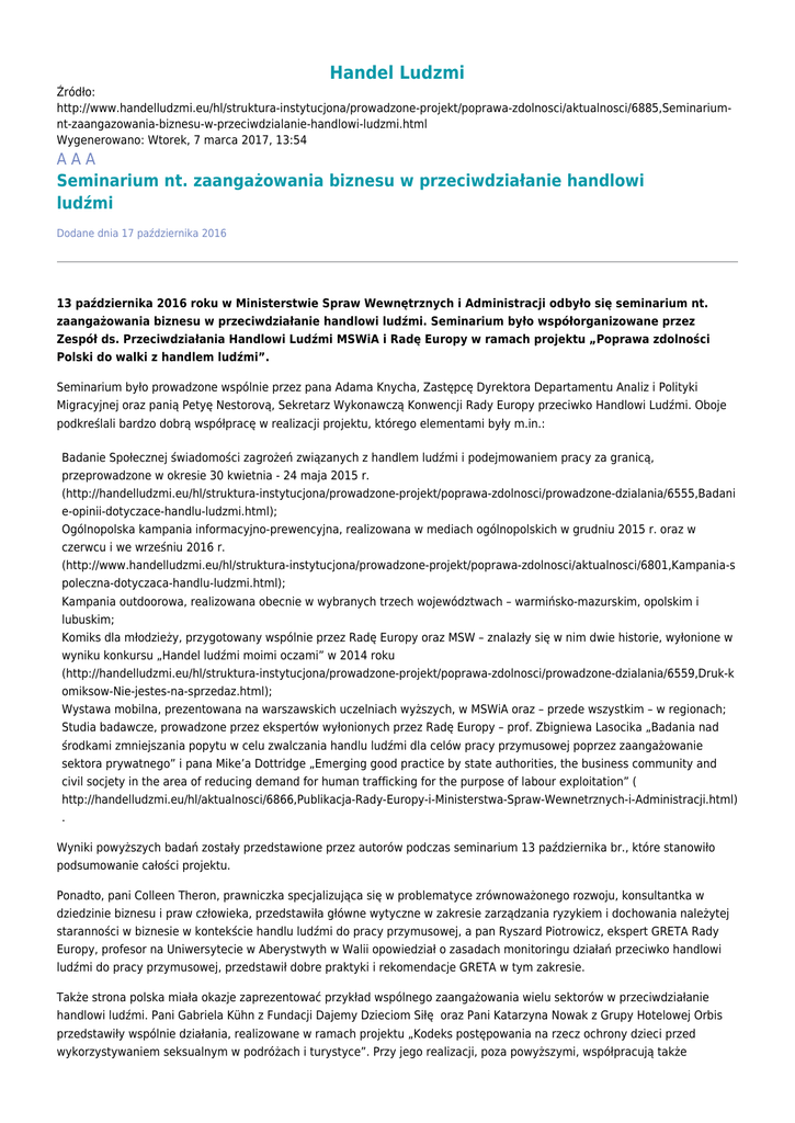 Handel Ludzmi Źródło: http://www.handelludzmi.eu/hl/struktura-instytucjona/prowadzone-projekt/poprawa-zdolnosci/aktualnosci/6885,Seminariumnt-zaangazowania-biznesu-w-przeciwdzialanie-handlowi-ludzmi.html Wygenerowano: Wtorek, 7 marca 2017, 13:54 AAA Seminarium nt. zaangażowania biznesu w przeciwdziałanie handlowi ludźmi Dodane dnia 17 października 2016 13 października 2016 roku w Ministerstwie Spraw Wewnętrznych i Administracji odbyło się seminarium nt. zaangażowania biznesu w przeciwdziałanie handlowi ludźmi. Seminarium było współorganizowane przez Zespół ds. Przeciwdziałania Handlowi Ludźmi MSWiA i Radę Europy w ramach projektu „Poprawa zdolności Polski do walki z handlem ludźmi”. Seminarium było prowadzone wspólnie przez pana Adama Knycha, Zastępcę Dyrektora Departamentu Analiz i Polityki Migracyjnej oraz panią Petyę Nestorovą, Sekretarz Wykonawczą Konwencji Rady Europy przeciwko Handlowi Ludźmi. Oboje podkreślali bardzo dobrą współpracę w realizacji projektu, którego elementami były m.in.: Badanie Społecznej świadomości zagrożeń związanych z handlem ludźmi i podejmowaniem pracy za granicą, przeprowadzone w okresie 30 kwietnia - 24 maja 2015 r. (http://handelludzmi.eu/hl/struktura-instytucjona/prowadzone-projekt/poprawa-zdolnosci/prowadzone-dzialania/6555,Badani e-opinii-dotyczace-handlu-ludzmi.html); Ogólnopolska kampania informacyjno-prewencyjna, realizowana w mediach ogólnopolskich w grudniu 2015 r. oraz w czerwcu i we wrześniu 2016 r. (http://www.handelludzmi.eu/hl/struktura-instytucjona/prowadzone-projekt/poprawa-zdolnosci/aktualnosci/6801,Kampania-s poleczna-dotyczaca-handlu-ludzmi.html); Kampania outdoorowa, realizowana obecnie w wybranych trzech województwach – warmińsko-mazurskim, opolskim i lubuskim; Komiks dla młodzieży, przygotowany wspólnie przez Radę Europy oraz MSW – znalazły się w nim dwie historie, wyłonione w wyniku konkursu „Handel ludźmi moimi oczami” w 2014 roku (http://handelludzmi.eu/hl/struktura-instytucjona/prowadzone-projekt/poprawa-zdolnosci/prowadzone-dzialania/6559,Druk-k omiksow-Nie-jestes-na-sprzedaz.html); Wystawa mobilna, prezentowana na warszawskich uczelniach wyższych, w MSWiA oraz – przede wszystkim – w regionach; Studia badawcze, prowadzone przez ekspertów wyłonionych przez Radę Europy – prof. Zbigniewa Lasocika „Badania nad środkami zmniejszania popytu w celu zwalczania handlu ludźmi dla celów pracy przymusowej poprzez zaangażowanie sektora prywatnego” i pana Mike’a Dottridge „Emerging good practice by state authorities, the business community and civil socjety in the area of reducing demand for human trafficking for the purpose of labour exploitation” ( http://handelludzmi.eu/hl/aktualnosci/6866,Publikacja-Rady-Europy-i-Ministerstwa-Spraw-Wewnetrznych-i-Administracji.html) . Wyniki powyższych badań zostały przedstawione przez autorów podczas seminarium 13 października br., które stanowiło podsumowanie całości projektu. Ponadto, pani Colleen Theron, prawniczka specjalizująca się w problematyce zrównoważonego rozwoju, konsultantka w dziedzinie biznesu i praw człowieka, przedstawiła główne wytyczne w zakresie zarządzania ryzykiem i dochowania należytej staranności w biznesie w kontekście handlu ludźmi do pracy przymusowej, a pan Ryszard Piotrowicz, ekspert GRETA Rady Europy, profesor na Uniwersytecie w Aberystwyth w Walii opowiedział o zasadach monitoringu działań przeciwko handlowi ludźmi do pracy przymusowej, przedstawił dobre praktyki i rekomendacje GRETA w tym zakresie. Także strona polska miała okazje zaprezentować przykład wspólnego zaangażowania wielu sektorów w przeciwdziałanie handlowi ludźmi. Pani Gabriela Kühn z Fundacji Dajemy Dzieciom Siłę oraz Pani Katarzyna Nowak z Grupy Hotelowej Orbis przedstawiły wspólnie działania, realizowane w ramach projektu „Kodeks postępowania na rzecz ochrony dzieci przed wykorzystywaniem seksualnym w podróżach i turystyce”. Przy jego realizacji, poza powyższymi, współpracują także Komenda Główna Policji oraz Ministerstwo Sportu i Turystyki, zatem jest on dobrym przykładem skutecznej współpracy wielosektorowej. Warto również podkreślić, poruszane przez gości kwestie, takie jak: trwająca właśnie procedura ratyfikacji Protokołu do Konwencji nr 29 Międzynarodowej Organizacji Pracy dotyczącej pracy przymusowej z 1930 r., przyjętego w Genewie w dniu 11 czerwca 2014 r., czy utworzenie Związku Zawodowego Pracowników Ukraińskich w Polsce, które również służą współpracy różnych aktorów w przeciwdziałaniu handlowi ludźmi. Mamy nadzieję, że było to pierwsze spotkanie, które stanie się katalizatorem kolejnych wspólnie podejmowanych inicjatyw i zwiekszeniem zaangażowania biznesu w projekty promujące prawa człowieka, w tym przeciwdziałanie handlowi ludźmi. logo Tagi: Projekt norweski, Rada Europy, praca przymusowa podziel się treścią: wersja pdf drukuj