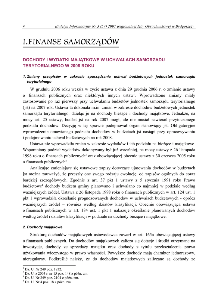 4 Biuletyn Informacyjny Nr 3 (57) 2007 Regionalnej Izby Obrachunkowej w Bydgoszczy I.FINANSE SAMORZĄDÓW DOCHODY I WYDATKI MAJĄTKOWE W UCHWAŁACH SAMORZĄDU TERYTORIALNEGO W 2008 ROKU 1. Zmiany przepisów w zakresie sporządzania uchwał budżetowych jednostek samorządu terytorialnego W grudniu 2006 roku weszła w życie ustawa z dnia 29 grudnia 2006 r. o zmianie ustawy o finansach publicznych oraz niektórych innych ustaw1. Wprowadzone zmiany miały zastosowanie po raz pierwszy przy uchwalaniu budżetów jednostek samorządu terytorialnego (jst) na 2007 rok. Ustawa ta dokonała m.in. zmian w zakresie dochodów budżetowych jednostek samorządu terytorialnego, dzieląc je na dochody bieżące i dochody majątkowe. Jednakże, na mocy art. 25 ustawy, budżet jst na rok 2007 mógł, ale nie musiał zawierać przytoczonego podziału dochodów. Decyzję w tej sprawie podejmował organ stanowiący jst. Obligatoryjne wprowadzenie omawianego podziału dochodów w budżetach jst nastąpi przy opracowywaniu i podejmowaniu uchwał budżetowych na rok 2008. Ustawa nie wprowadziła zmian w zakresie wydatków i ich podziału na bieżące i majątkowe. Wspomniany podział wydatków dokonywany był już wcześniej, na mocy ustawy z 26 listopada 1998 roku o finansach publicznych2 oraz obowiązującej obecnie ustawy z 30 czerwca 2005 roku o finansach publicznych3. Analizując zmieniające się ustawowe zapisy dotyczące ujmowania dochodów w budżetach jst można zauważyć, że przeszły one swego rodzaju ewolucję, od zapisów ogólnych do coraz bardziej szczegółowych. Zgodnie z art. 37 pkt 1 ustawy z 5 stycznia 1991 roku Prawo budżetowe4 dochody budżetu gminy planowano i uchwalano co najmniej w podziale według ważniejszych źródeł. Ustawa z 26 listopada 1998 roku o finansach publicznych w art. 124 ust. 1 pkt 1 wprowadziła określanie prognozowanych dochodów w uchwałach budżetowych - oprócz ważniejszych źródeł – również według działów klasyfikacji. Obecnie obowiązująca ustawa o finansach publicznych w art. 184 ust. 1 pkt 1 nakazuje określanie planowanych dochodów według źródeł i działów klasyfikacji w podziale na dochody bieżące i majątkowe. 2. Dochody majątkowe Strukturę dochodów majątkowych ustawodawca zawarł w art. 165a obowiązującej ustawy o finansach publicznych. Do dochodów majątkowych zalicza się dotacje i środki otrzymane na inwestycje, dochody ze sprzedaży majątku oraz dochody z tytułu przekształcenia prawa użytkowania wieczystego w prawo własności. Powyższe dochody mają charakter jednorazowy, nieregularny. Podkreślić należy, że do dochodów majątkowych zaliczane są dochody ze 1 Dz. U. Nr 249 poz. 1832. Dz. U. z 2003 r. nr 15 poz. 148 z późn. zm. 3 Dz. U. Nr 249 poz. 2104 z późn. zm. 4 Dz. U. Nr 4 poz. 18 z późn. zm. 2 Biuletyn Informacyjny Nr 3 (57) 2007 Regionalnej Izby Obrachunkowej w Bydgoszczy 5 sprzedaży majątku, ale nie z jego dzierżawy. Wątpliwości budzi ujmowanie do dochodów majątkowych § 074 - Wpływy z dywidend. Dywidenda jest dochodem z posiadanych akcji majątku. Wylicza się ją na podstawie rocznego zysku spółki, co przemawia za jej zaliczeniem do dochodów majątkowych. Ze względu na brzmienie art. 165a ust. 3 ustawy trudno jednak wskazać, do której grupy dochodów majątkowych należałoby ten paragraf włączyć.5 W związku z zastosowaniem nowego podziału dochodów na majątkowe i bieżące po raz pierwszy do opracowania projektów budżetów na 2008 rok poniżej podano propozycję wykazywania planowanych dochodów w uchwałach budżetowych. Ponadto, Regionalna Izba Obrachunkowa w Bydgoszczy wyraża pogląd, iż do dochodów majątkowych i ich poszczególnych grup należy zaliczyć wymienione niżej paragrafy klasyfikacji dochodów budżetowych. 1. Dochody ogółem dochody własne dotacje celowe subwencje środki z Unii Europejskiej - ……… zł, w tym: - ……… zł, - ……… zł, - ……… zł, - ……… zł. 2. Dokonuje się podziału dochodów ogółem na: dochody majątkowe - ……… zł, w tym: − dotacje i środki otrzymane na inwestycje - (paragrafy dochodowe stosować należy odpowiednio do rodzaju jednostki samorządu terytorialnego: 278, 620 - w części dotyczącej dotacji na zadania inwestycyjne, 626, 628-633, 641-643, 651-653, 661-665); − dochody ze sprzedaży majątku - §§ 077, 078, 081, 087; − dochody z tytułu przekształcenia prawa użytkowania wieczystego w prawo własności § 076, − wpływy z dywidend - § 074, dochody bieżące - ……… zł. Podkreślenia wymaga fakt, że podział dochodów na majątkowe i bieżące zapewnia również moduł planistyczny systemu Besti@. 3. Dochody bieżące Dochody bieżące budżetu jst to według art. 165a ustawy dochody budżetowe niebędące dochodami majątkowymi. Oblicza się je jako różnicę dochodów ogółem i dochodów majątkowych. Są to zatem dochody, które jst uzyskują regularnie, mają one charakter stały, powtarzalny i wiążą się z bieżącą działalnością jednostki. Największe źródła dochodów bieżących to: − wpływy z podatków i opłat lokalnych, − udziały we wpływach z podatku dochodowego od osób fizycznych i osób prawnych, − subwencja ogólna, 5 RIO w Bydgoszczy skierowała do Ministerstwa Finansów pismo w powyższej sprawie. 6 − − Biuletyn Informacyjny Nr 3 (57) 2007 Regionalnej Izby Obrachunkowej w Bydgoszczy dotacje z budżetu państwa i z budżetów innych jst na realizację zadań bieżących, środki na zadania bieżące pozyskiwane z innych źródeł, w tym z Unii Europejskiej. 4. Wydatki bieżące i majątkowe Zgodnie z art. 165a ustawy o finansach publicznych przy opracowywaniu uchwały budżetowej na 2008 rok również wydatki jednostek samorządu terytorialnego ujmuje się w podziale na bieżące i majątkowe. W myśl art. 166, 166a a i art. 184 ust. 1 pkt 2 ustawy o finansach publicznych w uchwale budżetowej plan wydatków powinien być przedstaw
