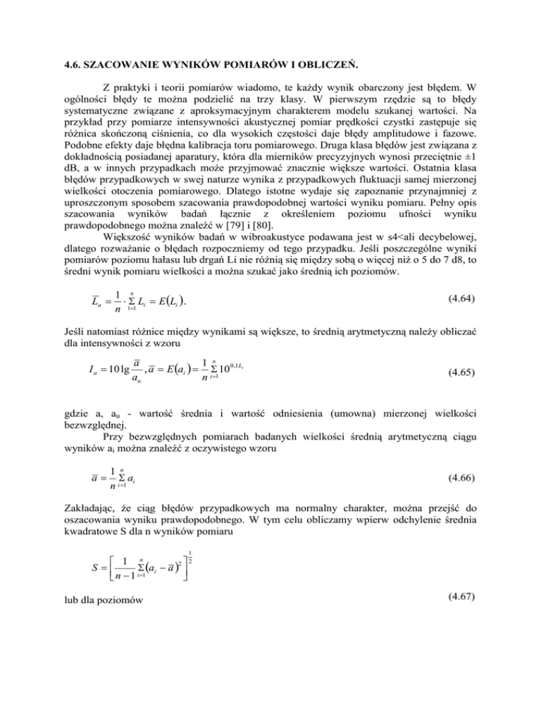 4.6. SZACOWANIE WYNIKÓW POMIARÓW I OBLICZEŃ. Z praktyki i teorii pomiarów wiadomo, te każdy wynik obarczony jest błędem. W ogólności błędy te można podzielić na trzy klasy. W pierwszym rzędzie są to błędy systematyczne związane z aproksymacyjnym charakterem modelu szukanej wartości. Na przykład przy pomiarze intensywności akustycznej pomiar prędkości czystki zastępuje się różnica skończoną ciśnienia, co dla wysokich częstości daje błędy amplitudowe i fazowe. Podobne efekty daje błędna kalibracja toru pomiarowego. Druga klasa błędów jest związana z dokładnością posiadanej aparatury, która dla mierników precyzyjnych wynosi przeciętnie ±1 dB, a w innych przypadkach może przyjmować znacznie większe wartości. Ostatnia klasa błędów przypadkowych w swej naturze wynika z przypadkowych fluktuacji samej mierzonej wielkości otoczenia pomiarowego. Dlatego istotne wydaje się zapoznanie przynajmniej z uproszczonym sposobem szacowania prawdopodobnej wartości wyniku pomiaru. Pełny opis szacowania wyników badań łącznie z określeniem poziomu ufności wyniku prawdopodobnego można znaleźć w [79] i [80]. Większość wyników badań w wibroakustyce podawana jest w s4<ali decybelowej, dlatego rozważanie o błędach rozpoczniemy od tego przypadku. Jeśli poszczególne wyniki pomiarów poziomu hałasu lub drgań Li nie różnią się między sobą o więcej niż o 5 do 7 d8, to średni wynik pomiaru wielkości a można szukać jako średnią ich poziomów. La = 1 n ⋅ Σ Li = E (Li ) . n 1=1 (4.64) Jeśli natomiast różnice między wynikami są większe, to średnią arytmetyczną należy obliczać dla intensywności z wzoru I a = 10 lg 1 n a , a = E (ai ) = Σ 10 0,1Li au n i =1 (4.65) gdzie a, au - wartość średnia i wartość odniesienia (umowna) mierzonej wielkości bezwzględnej. Przy bezwzględnych pomiarach badanych wielkości średnią arytmetyczną ciągu wyników ai można znaleźć z oczywistego wzoru a= 1 n Σ ai n i =1 (4.66) Zakładając, że ciąg błędów przypadkowych ma normalny charakter, można przejść do oszacowania wyniku prawdopodobnego. W tym celu obliczamy wpierw odchylenie średnia kwadratowe S dla n wyników pomiaru 1 1 n 22 S= Σ (ai − a ) n − 1 i=1 lub dla poziomów (4.67) ( ) 1 22 1 n 0,1Li S= Σ 10 −a n − 1 i =1 Jeśli przeprowadzimy kilka serii takich badań po n wyników, to wartość średnia ze średnich będzie dążyć do rzeczywistej wartości średniej µa z odchyleniem wartości średniej σ a równym E (a ) = µ a , σ a = 1 S n (4.68) Najbardziej prawdopodobny błąd pomiaru σap, czyli dający równe prawdopodobieństwo odchyleń od wartości oczekiwanej w stronę mniejszych i większych wartości P ( ai − a ≤ σ ap ) = 0,5 wynosi (4.69) σ ap = 0,6745S W takim razie szukany wynik może mieścić się w przedziale (a - σ a p ) < a < (a + σ ap ). (4.70) bądź w nieco węższym przedziale (a - σ a ) < a < (a + σ a ). Przybliżoną ocenę wyniku prawdopodobnego można przeprowadzić na podstawie prawa trzech sigm wynikającego z rozkładu normalnego. Prawdopodobieństwo, że poszukiwana wartość średnia leży poza tym przedziałem jest równe jednej czwartej procenta, czyli P( a − a < 3S) = 0,0026 ≅ 1/4%. Na zakończenie tego krótkiego wprowadzenia do rachunku błędów warto wskazać, że w myśl teorii rozkładu normalnego błędów zwiększanie liczby wyników zawęża przedział błędu (4.67), lecz zwiększenie liczby pomiarów powyżej 10 ÷ 20 mija się już z celem.