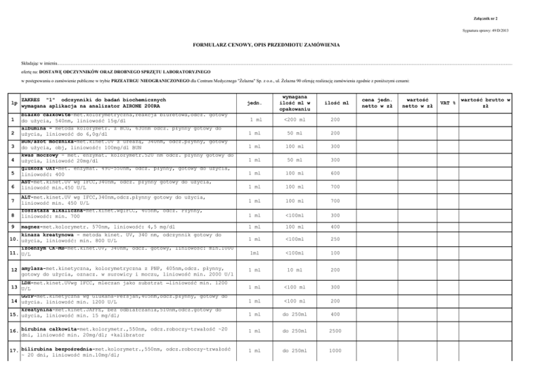Załącznik nr 2 Sygnatura sprawy: 49/D/2013 FORMULARZ CENOWY, OPIS PRZEDMIOTU ZAMÓWIENIA Składając w imieniu................................................................................................................................................................................................................................................................................................................................................................................................................................... ofertę na: DOSTAWĘ ODCZYNNIKÓW ORAZ DROBNEGO SPRZĘTU LABORATORYJNEGO w postępowaniu o zamówienie publiczne w trybie PRZEATRGU NIEOGRANICZONEGO dla Centrum Medycznego "Żelazna" Sp. z o.o., ul. Żelazna 90 oferuję realizację zamówienia zgodnie z poniższymi cenami: lp 1 2 3 4 5 6 ZAKRES "1" odczynniki do badań biochemicznych wymagana aplikacja na analizator AIRONE 200RA białko całkowite-met.kolorymetryczna,reakcja biuretowa,odcz. gotowy do użycia, 540nm, liniowość 15g/dl albumina - metoda kolorymetr. z BCG, 630nm odcz. płynny gotowy do użycia, liniowość do 6,0g/dl BUN/azot mocznika-met.kinet.UV z ureazą, 340nm, odcz.płynny, gotowy do użycia, obj, liniowość: 100mg/dl BUN kwas moczowy - met. enzymat. kolorymetr.520 nm odcz. płynny gotowy do użycia, liniowość 20mg/dl glukoza OXY-met. enzymat. 490-550nm, odcz. płynny, gotowy do użycia, liniowość: 400 AST-met.kinet.UV wg IFCC,340nm, odcz. płynny gotowy do użycia, liniowość min.450 U/L jedn. wymagana ilość ml w opakowaniu ilość ml 1 ml <200 ml 200 1 ml 50 ml 200 1 ml 100 ml 300 1 ml 50 ml 300 1 ml 100 ml 600 1 ml 100 ml 700 1 ml 100 ml 700 8 ALT-met.kinet.UV wg IFCC,340nm,odcz.płynny gotowy do użycia, liniowość min. 450 U/L fosfataza alkaliczna-met.kinet.wgIFCC, 405nm, odcz. Płynny, liniowość: min. 700 1 ml <100ml 300 9 magnez-met.kolorymetr. 570nm, liniowość: 4,5 mg/dl 1 ml 100 ml 400 1 ml <100ml 250 1ml <100ml 100 1 ml 10 ml 200 1 ml <100 ml 300 1 ml <100 ml 200 1 ml do 250ml 400 16. birubina całkowita-met.kolorymetr.,550nm, odcz.roboczy-trwałość ~20 dni, liniowość min. 20mg/dl; +kalibrator 1 ml do 250ml 2500 17. bilirubina bezpośrednia-met.kolorymetr.,550nm, odcz.roboczy-trwałość ~ 20 dni, liniowość min.10mg/dl; 1 ml do 250ml 1000 7 kinaza kreatynowa - metoda kinet. UV, 340 nm, odczynnik gotowy do 10. użycia, liniowość: min. 800 U/L izoenzym CK-MB-met.kinet.UV, 340nm, odcz. gotowy, liniowość: min.1000 11. U/L 12 amylaza-met.kinetyczna, kolorymetryczna z PNP, 405nm,odcz. płynny, gotowy do użycia, oznacz. w surowicy i moczu, liniowość min. 2000 U/l LDH-met.kinet.UVwg IFCC, mleczan jako substrat liniowość min. 1200 13 U/L GGTP-met.kinetyczna wg Glukana-Persjan,405nm,odcz.płynny, gotowy do 14 użycia. liniowość min. 1200 U/L kreatynina-met.kinet.JAFFE, bez odbiałczania,510nm,odcz.gotowy do 15. użycia, liniowość min. 15 mg/dl; cena jedn. netto w zł wartość netto w zł VAT % wartość brutto w zł Kalibrator do oznaczeń:białko, albumina,BUN,glukoza,magnez, 18. kreatynina,bilirubina całk.i bezp. surowica kontrolna do oznaczeń biochemicznych, ludzka/zwierzęca /alb.białko, mocznik, kreatynina. AST, ALT. FA. CK, glukoza, kw.moczowy, LDH,chol.chol-HDL, TG, amylaza, Fe, Na, K, Ca, Cl, GGTP/, 19. bilirubina całk i bezp./ mianowana poziom normalny poziom patologiczny sur.kardiologiczna - CK, CK-MB 1 ml max. 5 ml 2 fiolka fiolka fiolka 5 ml 5 ml 2 ml 10 4 1 RAZEM lp. 1 ZAKRES " 2 " odczynniki do badań koagulologicznych D-dimery - półilościowy test lateksowy do wykrywania D-dimerów fibryny, met.manualna, w zestawie kontrola +/-, bufor, pola testowe, patyczki do mieszania jedn. wymagana ilość zestawów w opakowaniu ilość jedn. zestaw zestaw (80 testów) 8 cena jedn. netto w zł RAZEM lp. ZAKRES " 3 " odczynniki do badań biochemicznych wymagana aplikacja na analizator AIRONE 200RA i EPOLL-20 1 CRP- oznaczenie ilościowe,met.immunoturbidymetryczna, w zestawie antiserum,bufor, standard;max.obj.sur.bad.10 ul, brak zjawiska prozonowego do stężenia 600 mg/l, trwałość odcz.rob.min.30 dni w temp.2-8*C 2 surowica kontrolna do oznaczeń CRP poziom N i P jedn. wymagana ilość ozn./ml ilość jedn. w opakowaniu op. 100 ozn. 25 op. fiolka 1 ml 6 cena jedn. netto w zł RAZEM lp. ZAKRES " 4 " odczynniki do badań koagulologicznych przeznaczone do aparatu OPTION APTT - gotowy do użycia, buforowana zawiesina kefaliny i zmikronizowanej krzemionki, trwałość min.1 rok 1a Chlorek wapnia 0,025mol 1 2 PT - odcz. liofilizowany zawierający króliczą tromboplastynę; trwałość min. 1 rok; ISI bliskie 1,0; zestaw z tabelą INR; przy zmianie serii dodane osocze referencyjne fibrynogen - odcz.rob.- min.72 godz. met.chronometr. zestaw z krzywą wzorcową na aparat 3a Kaolin 0,5 g/l 3 jedn. 1 ml 1 ml 1 ml 1 ml 1 ml wymagana ilość ml/szt. ilość jedn. w op./fiolce fiolka, nie więcej niż 10 ml fiolka, nie więcej niż 10 ml fiolka, nie więcej niż 10 ml 900 900 900 600 600 cena jedn. netto w zł 0,00 wartość netto w zł 0,00 VAT % 0,00 wartość netto w zł 0,00 VAT % 0,00 wartość netto w zł wartość brutto w zł wartość brutto w zł 0,00 VAT % wartość brutto w zł 4 osocze kontrolne (APTT,PT,Fb)-poziom normalny 1 ml fiolka, 1 ml 20 5 osocze kontrolne (APTT,PT,Fb)-poziom patologiczny 1 ml fiolka, 1 ml 20 6 naczynka z kulkami, do aparatu OPTION 2 op. op. 1000 szt. 11 7 bufor do fibrynogenu 1 ml fiolka, nie więcej niż 10 ml 1200 RAZEM lp. ZAKRES " 5 " nożyki do mikrotomu LEICA 1 niskooprofilowe-szer.8/dł.80mm; typu S-35 2 niskoprofilowe-szer.8/dł.80mm, do twardych materiałów; jedn. wymagana ilość szt. w opakowaniu ilość jedn. op. 50 szt. 3 op. 50 szt. 3 typu R-35 cena jedn. netto w zł RAZEM lp. ZAKRES " 6 " odczynniki chemiczne 1 2 3 4 alkohol etylowy 99,8% czda alkohol etylowy 96% czda aceton czda ksylen czda jedn. 1 1 1 1 litr litr litr litr wymagana ilość litrów w opakowaniu ilość jedn. 0,5 l 0,5 l 1 l 1 l 60 60 60 100 cena 