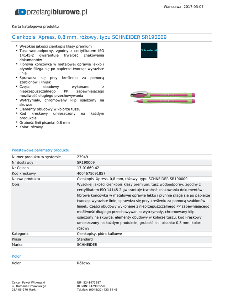 Warszawa, 2017-03-07 Karta katalogowa produktu Cienkopis Xpress, 0,8 mm, różowy, typu SCHNEIDER SR190009 Wysokiej jakości cienkopis klasy premium Tusz wodoodporny, zgodny z certyfikatem ISO 14145-2 gwarantuje trwałość znakowania dokumentów Fibrowa końcówka w metalowej oprawie lekko i płynnie ślizga się po papierze tworząc wyraziste linie Sprawdza się przy kreśleniu za pomocą szablonów i linijek Części obudowy wykonane z nieprzepuszczalnego PP zapewniającego możliwość długiego przechowywania Wytrzymały, chromowany klip osadzony na skuwce Elementy obudowy w kolorze tuszu Kod kreskowy umieszczony na każdym produkcie Grubość linii pisania: 0,8 mm Kolor: różowy Podstawowe parametry produktu Numer produktu w systemie 23949 Nr dostawcy SR190009 Nr Celcen 17-01669-42 Kod kreskowy 4004675091857 Nazwa produktu Cienkopis Xpress, 0,8 mm, różowy, typu SCHNEIDER SR190009 Opis Wysokiej jakości cienkopis klasy premium; tusz wodoodporny, zgodny z certyfikatem ISO 14145-2 gwarantuje trwałość znakowania dokumentów; fibrowa końcówka w metalowej oprawie lekko i płynnie ślizga się po papierze tworząc wyraziste linie; sprawdza się przy kreśleniu za pomocą szablonów i linijek; części obudowy wykonane z nieprzepuszczalnego PP zapewniającego możliwość długiego przechowywania; wytrzymały, chromowany klip osadzony na skuwce; elementy obudowy w kolorze tuszu; kod kreskowy umieszczony na każdym produkcie; grubość linii pisania: 0,8 mm; kolor: różowy Kategoria Cienkopisy, pióra kulkowe Klasa Standard Marka SCHNEIDER Kolor Kolor Różowy Celcen Paweł Witkowski ul. Romana Dmowskiego 25A 05-270 Marki NIP: 5241471287 REGON: 142996558 Tel./fax: (0048/22) 423 84 41 Warszawa, 2017-03-07 Cecha W ofercie od 2015-01 Produkt Cienkopis Typ Klasyczny Wymiary Grubość linii (mm) 0,8 Certyfikaty Nowy produkt w ofercie Standard Certyfikaty, normy, patenty ISO 14145-2 Hit Standard Wspólny słownik zamówień CPV 30192125-3 Pisaki Jesteśmy przekonani, że z pomocą przetargibiurowe.pl usprawnicie Państwo własne procesy biznesowe związane ze żmudnym poszukiwaniem odpowiadających Państwu produktów oraz opracowaniem specyfikacjii zapytań ofertowych. Serdecznie zapraszamy do wspópracy Zespół, PrzetargiBiurowe.pl Celcen Paweł Witkowski ul. Romana Dmowskiego 25A 05-270 Marki NIP: 5241471287 REGON: 142996558 Tel./fax: (0048/22) 423 84 41
