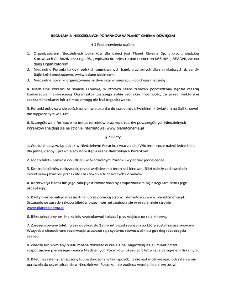 REGULAMIN NIEDZIELNYCH PORANKÓW W PLANET CINEMA OŚWIĘCIM § 1 Postanowienia ogólne 1. Organizatorem Niedzielnych poranków dla dzieci jest Planet Cinema Sp. z o.o. z siedzibą Katowicach Al. Rożdzieńskiego 93, , wpisana do rejestru pod numerem KRS NIP: , REGON:, zwana dalej Organizatorem. 2. Niedzielne Poranki to Cykl polskich animowanych bajek przyjaznych dla najmłodszych dzieci 2+ Bajki krótkometrażowe, wyświetlane odcinkami. 3. Niedzielne poranki organizowane są dwa razy w miesiącu – co drugą niedzielę. 4. Niedzielne Poranki to seanse Filmowe, w których seans filmowy poprzedzony będzie częścią konkursową i animacyjną Organizator zastrzega sobie jednakże możliwość, że przed niektórymi seansami konkursy lub animacje mogą nie być organizowane. 5. Poranki odbywają się ze ściszonym w stosunku do standardu dźwiękiem, i światłem na Sali kinowej nie wygaszonym w 100% 6. Szczegółowe informacje na temat terminów oraz repertuarów poszczególnych Niedzielnych Poranków znajdują się na stronie internetowej www.planetcinema.pl § 2 Bilety 1. Osoba chcąca wziąć udział w Niedzielnym Poranku (zwana dalej Widzem) może nabyć jeden bilet dla jednej osoby uprawniający do wstępu seans Niedzielnych Poranków. 2. Jeden bilet uprawnia do udziału w Niedzielnym Poranku wyłącznie jedną osobę. 3. Kontrola biletów odbywa się przed wejściem na teren sali kinowej. Bilet należy zachować do ewentualnej kontroli przez cały czas trwania Niedzielnych Poranków. 4. Rezerwacja biletu lub jego zakup jest równoznaczny z zapoznaniem się z Regulaminem i jego akceptacją. 5. Bilety można nabyć w kasie Kina lub za pomocą strony internetowej www.planetcinema.pl. Szczegółowe zasady zakupu biletów przez Internet znajdują się w regulaminie stronie www.planetcinema.pl 6. Bilet zakupiony on-line należy wydrukować i okazać przy wejściu na salę kinową. 7. Zarezerwowany bilet należy odebrać do 15 minut przed seansem na który został zarezerwowany. Wszystkie nieodebrane rezerwacje usuwane są z systemu równocześnie z godziną rozpoczęcia seansu. 8. Zwrotu lub wymiany biletu można dokonać w kasie Kina, najpóźniej na 15 minut przed rozpoczęciem pierwszego seansu Niedzielnych Poranków, okazując bilet wraz z paragonem fiskalnym. 9. Bilet nieczytelny, zniszczony lub uszkodzony w taki sposób, iż nie jest możliwe jego odczytanie nie uprawnia do uczestniczenia w Niedzielnym Poranku, nie podlega wymianie ani zwrotowi. 10. Na seanse Niedzielnych Poranków obowiązuje jedna cena biletu 10 zł. bez podziału na kategorie wiekowe. Na seanse Niedzielnych Poranków nie obowiązują inne zniżki. 11. Organizator może zmienić cenę biletu na poszczególne seanse uprzednio informując o tym na stronie www.planetcinema.pl 12. Szczegółowe informacje na temat obowiązujących cen biletów znajdują się w kasie Kina i na stronie internetowej www.planetcinema.pl § 3 Uczestnictwo w Niedzielnym Poranku 1. Wejście na teren sal kinowych możliwe jest jedynie po okazaniu pracownikowi Kina ważnego biletu uprawniającego do udziału w Niedzielnym Poranku. 2. Odpowiedzialność, w tym odpowiedzialność materialną, za osoby małoletnie, przebywające na terenie Kina lub/i uczestniczące w Niedzielnych Porankach odpowiedzialność ponoszą ich rodzice lub opiekunowie prawni. 3. Dzieci do lat 10 mogą uczestniczyć w seansach Niedzielnych Poranków wyłącznie pod opieką osób pełnoletnich. 4. Dzieci do lat 10 mogą opuszczać salę kinową wyłącznie w towarzystwie pełnoletniego opiekuna 5. Opiekun odpowiada za bezpieczeństwo dzieci opuszczających w trakcie trwania seansu miejsca zarezerwowane na podstawie wcześniej zakupionego biletu. 6. Miejsca na sali są numerowane i należy zajmować je zgodnie ze wskazaniami określonymi na bilecie. § 4 Postanowienia końcowe 1. Regulamin Niedzielnych Poranków dostępny jest na stronie internetowej www.planetcinema.pl oraz w kinie. 2. Organizator zastrzega sobie prawo zmiany Regulaminu wyłącznie z przyczyn istotnych, niezależnych od Organizatora, wynikających z uzasadnionych obiektywnie okoliczności, jednakże na zasadach nie pogorszających sytuacji prawnej i faktycznej klientów. 3. Regulamin Filmowych Poranków obowiązuje od dnia 01 maja 2016 roku. 4. Organizator zastrzega sobie możliwość zmiany repertuaru Niedzielnych Poranków, o czym poinformuje niezwłocznie na stronie internetowej www.planetcinema.pl . 5. Wszelkie skargi i reklamacje dotyczące organizacji Niedzielnych Poranków należy zgłaszać osobiście do kierownika Kina lub drogą pocztową na adres Organizatora. Reklamacje rozpatrywane są w terminie 21 dni od ich zgłoszenia. 6. W sprawach nieuregulowanych niniejszym Regulaminem mają zastosowanie odpowiednie przepisy prawa polskiego, w szczególności przepisy Kodeksu cywilnego.