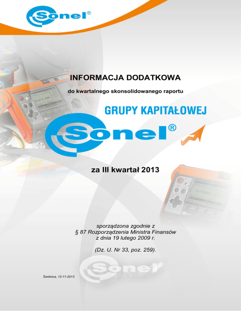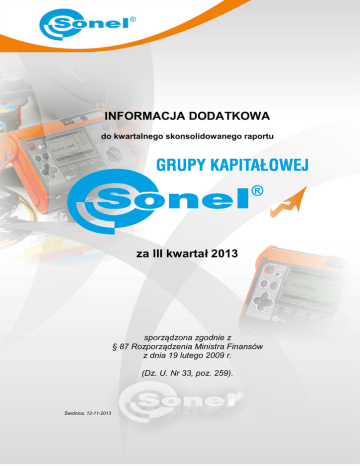 INFORMACJA DODATKOWA do kwartalnego skonsolidowanego raportu za III kwartał 2013 sporządzona zgodnie z § 87 Rozporządzenia Ministra Finansów z dnia 19 lutego 2009 r. (Dz. U. Nr 33, poz. 259). Świdnica, 12-11-2013 INFORMACJA DODATKOWA do kwartalnego skonsolidowanego raportu grupy kapitałowej SONEL za III kwartał 2013 INFORMACJA DODATKOWA do kwartalnego skonsolidowanego raportu grupy kapitałowej SONEL za III kwartał 2013 1. Podstawowe dane o Grupie Kapitałowej: Grupa kapitałowa powstała w dniu 25-02-2013, wskutek objęcia w nowoutworzonym podmiocie SONEL INSTRUMENTS INDIA PRIVATE LIMITED z siedzibą w Indiach, 90 % udziałów przez Spółkę SONEL SA. Czas trwania grupy kapitałowej jest nieoznaczony. Jednostką dominującą grupy kapitałowej jest firma SONEL SA. Nazwa Firmy: Siedziba: Wyodrębniony terytorialnie oddział: Organ Rejestrowy: Numer wpisu do KRS: Podstawowy przedmiot działalności to: Numer PKD: Numer EKD: Branża: Rynek regulowany: Segment: Indeksy: Numer identyfikacji podatkowej: Numer Regon: Czas trwania Spółki: SONEL Spółka Akcyjna 58-100 Świdnica ul. Wokulskiego 11, Zakład Konstrukcyjny, Wrocław, ul. Stargardzka 10 Krajowy Rejestr Sądowy 0000090121 z dnia 14-02-2002 działalność produkcyjna w branży elektronicznej i elektrotechnicznej. W szczególności w spółce odbywa się produkcja przyrządów pomiarowych oraz usługowy montaż elementów elektronicznych. 2651Z Produkcja instrumentów i przyrządów pomiarowych, kontrolnych i nawigacyjnych 3320A Przemysł elektromaszynowy Rynek Podstawowy Giełda Papierów Wartościowych w Warszawie 5 PLUS WIG 884-00-33-448 890236667 nieoznaczony. Jednostką zależną od dnia 25-02-2013 jest firma SONEL INSTRUMENTS INDIA PRIVATE LIMITED Siedziba: Chennai, Tamil Nadu, Indie Czas trwania Spółki: nieoznaczony. Podstawowy przedmiot działalności to: zakup, sprzedaż, import, eksport, produkcja, oferowanie i handel przyrządami pomiarowymi.. Udziałowcami Spółki są: SONEL S.A. – udział stanowiący 90% Obywatel Indii – Shyam Ravindran- udział stanowiący 10% Informacje dotyczące składu osobowego Zarządu oraz Rady Nadzorczej Emitenta- jednostki dominującej. Władze SONEL SA to: Walne Zgromadzenie, Rada Nadzorcza i Zarząd Spółki Do dnia 21-05-2013 rok w skład Zarządu Sonel SA wchodzili: Krzysztof Wieczorkowski jako Prezes Zarządu i Jan Walulik jako Wiceprezes Zarządu, Rada Nadzorcza SONEL S.A. na posiedzeniu w dniu 19 kwietnia 2013 r. podjęła uchwały w sprawie powołania Zarządu Spółki na nową wspólną trzyletnią kadencję, która rozpoczęła się w dniu 22 maja 2013, po odbyciu Zwyczajnego Walnego Zgromadzenia SONEL S.A. zatwierdzającego sprawozdanie finansowe spółki za 2012 rok. Od tego dnia skład Zarządu SONEL S.A. jest następujący: Krzysztof Wieczorkowski .- Prezes Zarządu, Jan Walulik - Wiceprezes Zarządu, Wojciech Kwiatkowski – Członek Zarządu W firmie jest ustanowiony prokurent w osobie Jolanty Drozdowskiej. Aktualny stan Rady Nadzorczej Sonel SA przedstawia się następująco: Andrzej Diakun Przewodniczący Rady Nadzorczej, Mirosław Nowakowski Członek Rady Nadzorczej, Maciej Posadzy Członek Rady Nadzorczej. Andrzej Kasperek Członek Rady Nadzorczej, Stanisław Zając Członek Rady Nadzorczej. W 2013 roku skład Rady Nadzorczej nie ulegał zmianie. 2. Zasady przyjęte przy sporządzaniu raportu Okresy, za które prezentowane jest skonsolidowane sprawozdanie finansowe i porównywalne dane finansowe. Skrócone śródroczne Sprawozdanie finansowe sporządzono za okres od 01-01-2013 do 30-09-2013. Dane porównywalne prezentowane są za okres od 01-01-2012 do 30-09-2012 w zakresie rachunku zysków i strat, wg stanu na dzień 30-09-2012 i 31-12-2012, w zakresie sytuacji bilansowej przedsiębiorstwa. Niniejsze skrócone śródroczne sprawozdanie finansowe grupy kapitałowej SONEL, zamieszczone w raporcie kwartalnym za III kwartał 2013 roku, zostało sporządzone w oparciu o Międzynarodowe Standardy Sprawozdawczości Finansowej i jest z nimi w całości zgodne. Sprawozdanie sporządzono przy założeniu pełnej kontynuacji działalności. Emitent sporządza sprawozdanie zgodnie z zasadą memoriałową z wyjątkiem informacji o przepływach pieniężnych. Sprawozdanie zostało zaprezentowane zgodnie z zasadą agregowania i istotności. W sprawozdaniu nie dokonuje się żadnych kompensat poza wymaganymi w MSSF lub MSR. Walutą funkcjonalną jednostki dominującej i waluta funkcjonalną niniejszego sprawozdania jest złoty polski. Strona 2 / 9 INFORMACJA DODATKOWA do kwartalnego skonsolidowanego raportu grupy kapitałowej SONEL za III kwartał 2013 Dane w euro zaprezentowano po przeliczeniu wg następujących kursów: Sposób ustalenia kursu do przeliczenia Cena 1 euro w złotych Elementy sprawozdania przeliczone wg kursu Kurs średni NBP na 30-09-2013 4,2163 aktywów i pasywów Kurs średni NBP na 31-12-2012 4,0882 aktywów i pasywów Kurs średni NBP na 30-09-2012 Średnia arytmetyczna kursów średnich na koniec każdego miesiąc okresu od stycznia do września 2013 Średnia arytmetyczna kursów średnich na koniec każdego miesiąc okresu od stycznia do września 2012 Średnia arytmetyczna kursów średnich na koniec każdego miesiąc okresu od stycznia do grudnia 2012 4,1138 aktywów i pasywów 4,2231 rachunku zysków i strat 4,1948 rachunku zysków i strat 4,1736 rachunku zysków i strat Spółki objęte skonsolidowanym sprawozdaniem finansowym to: Sonel SA, z siedzibą w Świdnicy, w Polsce jako podmiot dominujący oraz SONEL INSTRUMENTS INDIA PRIVATE LIMITED podmiot zależny z siedzibą w Chennai w Indiach. 3. Zmiany w polityce rachunkowości Począwszy od 2009 roku Spółka Sonel SA – podmiot dominujący, rozpoczęła prezentację sprawozdań finansowych zgodnie z Międzynarodowymi Standardami Sprawozdawczości Finansowej. Dniem przejścia był 01-01-2008. Istnieje szereg elementów, które są prezentowane odmiennie w sprawozdawczości finansowej sporządza