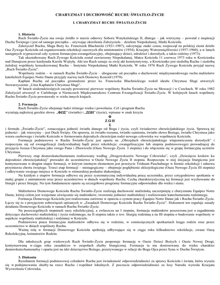 CHARYZMAT I DUCHOWOŚĆ RUCHU ŚWIATŁO-ŻYCIE I. CHARYZMAT RUCHU ŚWIATŁO-ŻYCIE 1. Historia Ruch Światło-Życie ma swoje źródło w nurcie odnowy Soboru Watykańskiego II, dlatego – jak wierzymy – powstał z inspiracji Ducha Świętego i jest od samego początku – używając określenia Założyciela – dziełem Niepokalanej, Matki Kościoła. Założyciel Ruchu, Sługa Boży ks. Franciszek Blachnicki (1921-1987), odczytując znaki czasu, rozpoczął na polskiej ziemi dzieło Oaz Żywego Kościoła od organizowania rekolekcji oazowych dla ministrantów (1954), Krucjaty Wstrzemięźliwości (1957-1960), a w latach następnych wypracował cały system formacyjno-ewangelizacyjny, obejmujący dzieci, młodzież i dorosłych, a także rodziny (1973). Tak ukształtowany Ruch Żywego Kościoła został zawierzony Niepokalanej, Matce Kościoła 11 czerwca 1973 roku w Krościenku nad Dunajcem przez kardynała Karola Wojtyłę. Akt ten Ruch uznaje za swój akt konstytutywny, a Krościenko jest siedzibą Ruchu i siedzibą żeńskiej wspólnoty konsekrowanej Ruchu – Instytutu Niepokalanej Matki Kościoła. W roku 1976 Ruch Żywego Kościoła przyjął nazwę „Ruch Światło-Życie”. Wspólnoty rodzin – w ramach Ruchu Światło-Życie – ubogacone od początku o duchowość międzynarodowego ruchu małżeństw katolickich Equipes Notre Dame przyjęły nazwę ruch Domowy Kościół (1978). Kapłani Ruchu od początku gromadzeni przez ks. Franciszka Blachnickiego wokół ideału Chrystusa Sługi utworzyli Stowarzyszenie „Unia Kapłanów Chrystusa Sługi”. W latach siedemdziesiątych zaczęły powstawać pierwsze wspólnoty Ruchu Światło-Życie na Słowacji i w Czechach. W roku 1982 Założyciel utworzył w Carlsbergu w Niemczech Międzynarodowe Centrum Ewangelizacji Światło-Życie. W kolejnych latach wspólnoty Ruchu Światło-Życie powstawały w wielu innych krajach. 2. Formacja Ruch Światło-Życie obejmuje ludzi różnego wieku i powołania. Cel i program Ruchu wyrażają najkrócej greckie słowa „” (światło) i „” (życie), wpisane w znak krzyża i formuła „Światło-Życie”, oznaczająca jedność światła danego od Boga i życia, czyli świadectwo chrześcijańskiego życia. Sprawcą tej jedności – jak wierzymy – jest Duch Święty. On sprawia, że światło rozumu, światło sumienia, światło słowa Bożego, światło Chrystusa jako wzoru osobowego i światło Kościoła w formowaniu dojrzałych chrześcijan rodzi nowego człowieka we wspólnocie Kościoła. Formacja podstawowa w Ruchu Światło-Życie jest oparta na „Obrzędach chrześcijańskiego wtajemniczenia dorosłych” i rozpoczyna się od ewangelizacji (indywidualnej bądź przez rekolekcje: ewangelizacyjne lub stopnia podstawowego) prowadzącej do przyjęcia Jezusa Chrystusa jako swego Pana i Zbawiciela (Oaza Nowego Życia I stopnia) i do włączenia się w grupę formacyjną uczniów Chrystusa. Pierwszy etap deuterokatechumenatu realizowany według „Drogowskazów Nowego Człowieka”, czyli „Dziesięciu kroków ku dojrzałości chrześcijańskiej” prowadzi do uczestnictwa w Oazie Nowego Życia II stopnia. Rozpoczęta w niej inicjacja liturgiczna jest kontynuowana w drugim etapie formacji, w którym istotnym elementem jest przeżycie Triduum Paschalnego w formie rekolekcji i odnowa przymierza chrztu świętego. Trzeci etap formacji – mistagogiczny – obejmuje pogłębienie eklezjologiczne (Oaza Nowego Życia III stopnia) i odkrywanie swojego miejsca w Kościele w różnorakiej posłudze diakonijnej. Na każdym z etapów formacja odbywa się przez systematyczną indywidualną pracę uczestnika, przez cotygodniowe spotkania w małej grupie z animatorem oraz przez uczestnictwo w dniach wspólnoty Ruchu. Cechą charakterystyczną tej formacji jest wychowanie do liturgii i przez liturgię. Na tym fundamencie oparte są szczegółowe programy formacyjne odpowiednie dla wieku i stanu. Małżeństwa Domowego Kościoła Ruchu Światło-Życie realizują duchowość małżeńską zaczerpniętą z charyzmatu Equipes Notre Dame, której celem jest wzajemne uświęcanie się małżonków, tworzenie jedności małżeńskiej i realizowanie katechumenatu rodzinnego. Formacja Domowego Kościoła jest realizowana zarówno w oparciu o system pracy Equipes Notre Dame jak i Ruchu Światło-Życie. Łączy się to z przyjęciem zobowiązań opisanych w „Zasadach Domowego Kościoła Ruchu Światło-Życie”. Dokument ten reguluje zasady działania Domowego Kościoła w ramach Ruchu Światło-Życie. Na poszczególnych stopniach oazy rekolekcyjnej, a zwłaszcza na I stopniu, formacja małżonków poszerzona jest o zagadnienia dotyczące duchowości małżeńskiej i życia rodzinnego, na II stopniu także o tzw. liturgię rodzinną a na III stopniu o budowanie wspólnoty w aspekcie wspólnoty małżeńskiej i rodzinnej w Kościele. Podstawowa praca formacyjna małżonków odbywa się w rodzinie, w comiesięcznych spotkaniach kręgu rodzin oraz przez uczestnictwo w dniach wspólnoty Ruchu. Ważną rolę w formacji Domowego Kościoła spełniają odbywające się w ciągu roku kilkudniowe rekolekcje, zwane Oazą Rekolekcyjną Animatorów Rodzin. Dla młodszych grup wiekowych Ruch Światło-Życie proponuje formację w Oazie Dzieci Bożych i Oazie Nowej Drogi, kontynuowaną w ciągu roku zasadniczo w zespołach służby liturgicznej. Formacja ta ma dostosowany do wieku charakter deuterokatechumenalny i oparta jest na idei dziecięctwa Bożego, przeżywanego w relacji do Boga Ojca przez Syna w Duchu Świętym. 3. Diakonia Rezultatem formacji podstawowej członków Ruchu jest świadomość odpowiedzialności za sprawy Kościoła i świata, która wyraża się w podejmowaniu służby na rzecz Ruchu i wspólnot lokalnych. Z poczucia odpowiedzialności za losy Narodu wyrosła Krucjata Wyzwolenia Człowieka. 2 Osoby podejmujące posługę w Ruchu określa się mianem Diakonii Ruchu Światło-Życie. Z