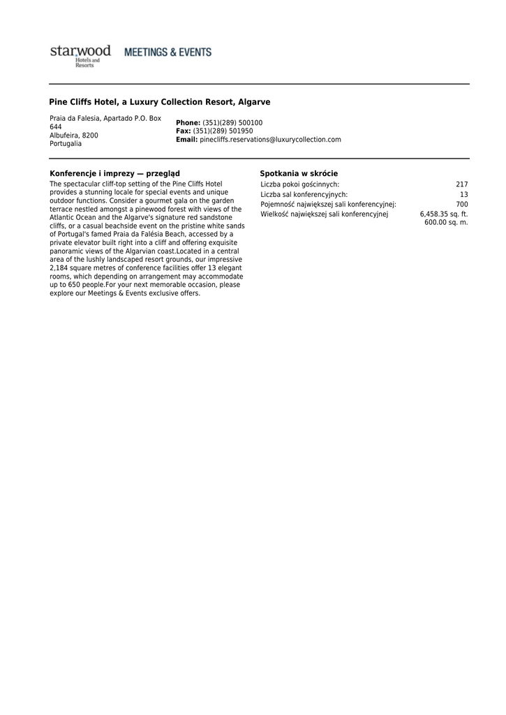 Pine Cliffs Hotel, a Luxury Collection Resort, Algarve Praia da Falesia, Apartado P.O. Box 644 Albufeira, 8200 Portugalia Phone: (351)(289) 500100 Fax: (351)(289) 501950 Email: [email protected] Konferencje i imprezy — przegląd Spotkania w skrócie The spectacular cliff-top setting of the Pine Cliffs Hotel provides a stunning locale for special events and unique outdoor functions. Consider a gourmet gala on the garden terrace nestled amongst a pinewood forest with views of the Atlantic Ocean and the Algarve's signature red sandstone cliffs, or a casual beachside event on the pristine white sands of Portugal's famed Praia da Falésia Beach, accessed by a private elevator built right into a cliff and offering exquisite panoramic views of the Algarvian coast.Located in a central area of the lushly landscaped resort grounds, our impressive 2,184 square metres of conference facilities offer 13 elegant rooms, which depending on arrangement may accommodate up to 650 people.For your next memorable occasion, please explore our Meetings & Events exclusive offers. Liczba pokoi gościnnych: Liczba sal konferencyjnych: Pojemność największej sali konferencyjnej: Wielkość największej sali konferencyjnej 217 13 700 6,458.35 sq. ft. 600.00 sq. m. Pine Cliffs Hotel, a Luxury Collection Resort, Algarve Praia da Falesia, Apartado P.O. Box 644 Albufeira, 8200 Portugalia Phone: (351)(289) 500100 Fax: (351)(289) 501950 Email: [email protected] Specyfikacja szczegółowa Nieruchomości Typ obiektu Resort Liczba sal konferencyjnych 13 Rok budowy 1991 Całkowita wielkość sal konferencyjnych 2,184.00 sq. m. 23,508.38 sq. ft. Liczba budynków 1 Wielkość największej sali konferencyjnej 600.00 sq. m. 6,458.35 sq. ft. Liczba pięter 3 Pojemność największej sali konferencyjnej 700 Golf Array Pojemność najmniejszej sali konferencyjnej 9.48 sq. m. 102.04 sq. ft. Pojemność najmniejszej sali konferencyjnej 100 Pokoje gościnne Data zameldowania 2:00 PM Internet w pokoju Data wymeldowania 12:00 PM Liczba pokoi gościnnych 217 Udogodnienia Centrum odnowy biologicznej / Pine Cliffs Goes Active Health and Centrum Fitness Fitness Centre Basen Yes Klubik'dziecięcy/Abonament Junior Club (Seasonal) dla'dzieci Porto Pirata Nazwa basenu Jacuzzi Indoor Heated Pool Outdoor Pools Children's Pool Lokalne & atrakcje Strefa czasowa W Pobliskie lotniska Faro Airport Kod lotniska FAO Odległość od lotniska 21.02 Kilometers 13.06 Miles Along Portugal's southernmost shores, the picture-postcard region known as the Algarve captivates travellers with its dramatic red sandstone cliffs marching toward an imperial blue Atlantic Ocean. Renowned for its gorgeous beaches, warm waters, and exceptional golfing, the Algarve's year-round sunshine makes it an ideal holiday retreat. With a rich history dating back thousands of years to the Phoenicians and Carthaginians, it was the arrival of the Arabic Moors in the eighth century that would have the most significant and lasting influence on the Algarve—the traces of which are seen today in the whitewashed architecture, narrow streets and flower gardens typical throughout the region. The Luxury Collection Concierge recommends the following as unique places to explore, all accessible by car or organised tour: Explore the medieval village of Silves—from the impressive walls of its Moorish castle to the Ponte Romana Bridge recalling the presence of the Romans. Obszar lokalny Journey to Monchique, the highest point in the Algarve, nestled between the mountains of Foia and Picota and offering spectacular panoramas of rolling hills and the ocean beyond. Famed for its thermal spas, an exploration of its steep cobble-stoned streets leads to ancient churches, monastaries, and the small doorways of local artisans. Discover Alte, an extremely pretty village in the midst of unspoilt and hilly countryside. Noted for its whitewashed architecture, narrow streets, gardens filled with flowers, and hanging baskets, Alte is typical of the Algarve region. Portuguese is the national language spoken throughout the Algarve, although most locals will also speak some English. The Euro is the accepted currency and most stores and restaurants take all major credit cards and European debit cards. There is a shopping complex just 15 kilometres from the hotel, accessible by car, which is open daily from 10am to 11pm. The Pine Cliffs Hotel operates on a 220 volt electrical system. For additional details or to make specialised arrangements, please contact The Luxury Collection Concierge at (351)(289) 500 100. Opłaty & podatki Waluta lokalna Euro Kod waluty EUR Lista opłat i podatków : $0.00 : $0.00 : $0.00 : $0.00 : $0.00 Metody płatności • AMEX / OPTIMA • MASTER CARD • VISA • DINERS/SUNDIN/AMOCO • JAPAN CREDIT BUREAU Pine Cliffs Hotel, a Luxury Collection Resort, Algarve Praia da Falesia, Apartado P.O. Box 644 Albufeira, 8200 Portugalia Phone: (351)(289) 500100 Fax: (351)(289) 501950 Email: [email protected] Capacity Charts Room Name Key Dim. (l x w) Area Height Banq. Thtr. Foyer - - 64.00 sq. m. 688.89 sq. ft. - - - Foyer - - 5.02 sq. m. 54.03 sq. ft. - - - Foyer - - 5.95 sq. m. 64.05 sq. ft. - - - Patio - - 102.00 sq. m. 1,097.92 sq. ft. - - - Patio - - 9.48 sq. m. 102.04 sq. ft. - - - Salão Pinhal - 20.00 m. x 30.00 m.65.62 ft. x 98.43 ft. 600.00 sq. m. 6,458.35 sq. ft. 2.50 m. 8.20 ft. 550 700 So Gabriel A - - 16.35 sq. m. 175.99 sq. ft. - 120 112 So Gabriel A - 16.00 m. x 11.00 m.52.49 ft. x 36.09 ft. 176.00 sq. m. 1,894.45 sq. ft. - 120 112 So Gabriel A/ B - 24.00 m. x 11.00 m.78.74 ft. x 36.09 ft. 264.00 sq. m. 2,841.67 sq. ft. - 180 224 So Gabriel B - - 12.26 sq. m. 131.97 sq. ft. - 90 88 So Gabriel B - 12.00 m. x 11.00 m.39.37 ft. x 36.09 ft. 132.00 sq. m. 1,420.84 sq. ft. - 90 88 So Miguel A - 8.00 m. x 6.00 m.26.25 ft. x 19.69 ft. 48.00 sq. m. 516.67 sq. ft. - 30 40 So Miguel A/ B/ C - 20.00 m. x 8.00 m.65.62 ft. x 26.25 ft. 160.00 sq. m. 1,722.23 sq. ft. - 100 120 So Miguel B - 8.00