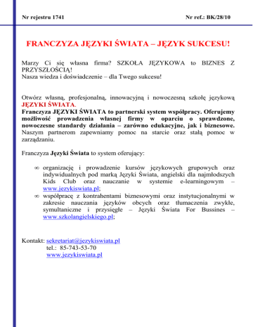 Nr rejestru 1741 Nr ref.: BK/28/10 FRANCZYZA JĘZYKI ŚWIATA – JĘZYK SUKCESU! Marzy Ci się własna firma? SZKOŁA JĘZYKOWA to BIZNES Z PRZYSZŁOŚCIĄ! Nasza wiedza i doświadczenie – dla Twego sukcesu! Otwórz własną, profesjonalną, innowacyjną i nowoczesną szkołę językową JĘZYKI ŚWIATA. Franczyza JĘZYKI ŚWIATA to partnerski system współpracy. Oferujemy moŜliwość prowadzenia własnej firmy w oparciu o sprawdzone, nowoczesne standardy działania – zarówno edukacyjne, jak i biznesowe. Naszym partnerom zapewniamy pomoc na starcie oraz stałą pomoc w zarządzaniu. Franczyza Języki Świata to system oferujący: • organizację i prowadzenie kursów językowych grupowych oraz indywidualnych pod marką Języki Świata, angielski dla najmłodszych Kids Club oraz nauczanie w systemie e-learningowym – www.jezykiswiata.pl; • współpracę z kontrahentami biznesowymi oraz instytucjonalnymi w zakresie nauczania języków obcych oraz tłumaczenia zwykłe, symultaniczne i przysięgłe – Języki Świata For Bussines – www.szkolangielskiego.pl; Kontakt: [email protected] tel.: 85-743-53-70 www.jezykiswiata.pl