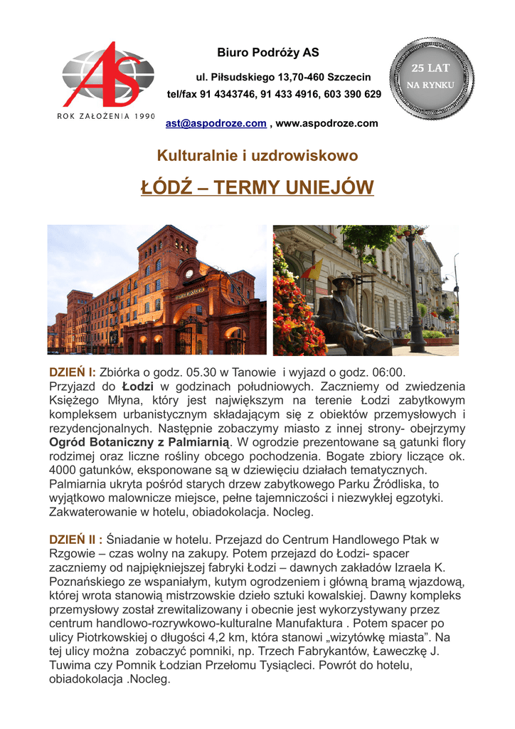 Biuro Podróży AS ul. Piłsudskiego 13,70-460 Szczecin tel/fax 91 4343746, 91 433 4916, 603 390 629 [email protected] , www.aspodroze.com Kulturalnie i uzdrowiskowo ŁÓDŹ – TERMY UNIEJÓW DZIEŃ I: Zbiórka o godz. 05.30 w Tanowie i wyjazd o godz. 06:00. Przyjazd do Łodzi w godzinach południowych. Zaczniemy od zwiedzenia Księżego Młyna, który jest największym na terenie Łodzi zabytkowym kompleksem urbanistycznym składającym się z obiektów przemysłowych i rezydencjonalnych. Następnie zobaczymy miasto z innej strony- obejrzymy Ogród Botaniczny z Palmiarnią. W ogrodzie prezentowane są gatunki flory rodzimej oraz liczne rośliny obcego pochodzenia. Bogate zbiory liczące ok. 4000 gatunków, eksponowane są w dziewięciu działach tematycznych. Palmiarnia ukryta pośród starych drzew zabytkowego Parku Źródliska, to wyjątkowo malownicze miejsce, pełne tajemniczości i niezwykłej egzotyki. Zakwaterowanie w hotelu, obiadokolacja. Nocleg. DZIEŃ II : Śniadanie w hotelu. Przejazd do Centrum Handlowego Ptak w Rzgowie – czas wolny na zakupy. Potem przejazd do Łodzi- spacer zaczniemy od najpiękniejszej fabryki Łodzi – dawnych zakładów Izraela K. Poznańskiego ze wspaniałym, kutym ogrodzeniem i główną bramą wjazdową, której wrota stanowią mistrzowskie dzieło sztuki kowalskiej. Dawny kompleks przemysłowy został zrewitalizowany i obecnie jest wykorzystywany przez centrum handlowo-rozrywkowo-kulturalne Manufaktura . Potem spacer po ulicy Piotrkowskiej o długości 4,2 km, która stanowi „wizytówkę miasta”. Na tej ulicy można zobaczyć pomniki, np. Trzech Fabrykantów, Ławeczkę J. Tuwima czy Pomnik Łodzian Przełomu Tysiącleci. Powrót do hotelu, obiadokolacja .Nocleg. DZIEŃ III: Po śniadaniu wykwaterowanie z hotelu, wyjazd do Uniejowa do kompleksu termalno-basenowego Termy Uniejów. Obiekt oferuje gorące kąpiele w leczniczych solankach termalnych. Znajdują się tu baseny kryte i otwarte oraz zespół odnowy biologicznej ze strefą saun, aromaterapią, tepidarium, gabinetem masażu czy komorą śnieżną. Największą atrakcją tego miejsca są tzw. Łaźnie Kasztelańskie czyli prawdziwie średniowieczne SPA, oferujące kąpiele w dębowych 6-osobowych baliach z solankową wodą termalną lub z dodatkiem różanych olejków i płatków kwiatów, a nawet w piwie czy czekoladzie. Wyjazd w drogę powrotną . Na trasie krótki postój w Licheniu. Spacer do Sanktuarium. Obiad. Wyjazd do Tanowa. Zakończenie wycieczki w godzinach wieczornych. TERMIN: 16-18.09.2016r. CENA: 490 zł / os ( Kalkulacja dla grupy min. 46 osób) Świadczenia zawarte w cenie: transport komfortowym autokarem 2 noclegi w hotelach klasy turystycznej wyżywienie: 2 śniadania, 2 obiadokolacje, 1 obiad w drodze powrotnej ( drugie danie gorące) ubezpieczenie: NNW opiekę pilota – przewodnika UWAGA! Bilety wstępu do zwiedzanych obiektów uczestnicy opłacają indywidualnie ok. 90 PLN Dopłata do pokoju 1 os. – 160 PLN Kolejność zwiedzania może ulec zmianie Szczecin 11.03.2016 r.