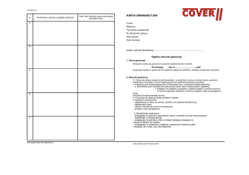 cd Tab. nr 1 Lp. Konserwacje, naprawy, przeglądy techniczne 3 Data, Imię i Nazwisko osoby wykonującej (pieczątka firmy) KARTA GWARANCYJNA Z dnia: Nabywca: Typ bramy (urządzenia): Nr dokumentu zakupu: Data zakupu: Data montażu: 4 podpis i pieczęć Sprzedawcy: ................................................................................. Ogólne warunki gwarancji 1. Okres gwarancji Niniejszym udziela się gwarancji na sprawne działanie wyrobu w okresie 24 miesięcy 5 lub na ..................................cykli przyjmując zasadę że, gwarancja na urządzenie wygasa po spełnieniu jednego z powyższych warunków. 2. Warunki gwarancji 6 7 karta gwarancyjna bram garazowych 2.1 Gwarancja dotyczy wyłącznie szkód powstałych w przedmiocie umowy w okresie trwania gwarancji. Podstawą do wnoszenia roszczeń gwarancyjnych jest spełnienie poniższych warunków: a. Posiadania przez Reklamującego Karty Gwarancyjnej wraz z wypełnioną Książką Raportową, b. Stwierdzeniu przez Gwaranta lub autoryzowany serwis wad w reklamowanym urządzeniu, c. Posiadanie na urządzeniu oryginalnej i czytelnej naklejki z numerem seryjnym, d. Pisemne zgłoszenie reklamacji z imiennym podpisem osoby przyjmującej ze strony Gwaranta lub autoryzowanego serwisu, 2.2 Gwarancja nie obejmuje szkód powstałych wskutek: a. Uszkodzeń mechanicznych - oddziaływania sił natury np. wichury, powódź i inne zjawiska atmosferyczne, - oddziaływania ognia, - uderzeń, ścierania lub innych sił zewnętrznych - przepięć w sieci energetycznej b. Niewłaściwego użytkowania - polegającego na dokonaniu samowolnych napraw, przeróbek lub zmian konstrukcyjnych, - niezgodnego z instrukcją obsługi, - polegającego na dokonaniu zmian w instalacji zasilającej polegającej na zamianie kolejności faz zasilania, - polegającego na użytkowaniu urządzenia w agresywnym środowisku gdzie występują; sole, kwasy, ługi, duża wilgotność, karta gwarancyjna bram garazowych c. Naturalnego zużycia - zgodnie z właściwościami albo przeznaczeniem elementów urządzenia, a w szczególności; zamki, samozamykacze, sprężyny wyważające, - uszczelki, odbijacze gumowe. 2.3 Warunkiem utrzymania uprawnień gwarancyjnych przez Użytkownika jest: a. Dokonywanie w okresie trwania gwarancji okresowych przeglądów techniczno-konserwacyjnych. Pierwszy przegląd należy wykonać w okresie do 12 miesięcy od dnia zakończenia montażu. b. Przeglądy będą wykonywane przez Gwaranta lub autoryzowany serwis na kosz Nabywcy. 2.4 Wszystkie przeglądy, prace konserwacyjne lub naprawcze odnotowywane będą w Książce Raportowej, która jest integralną częścią niniejszej gwarancji. 2.5 Reklamujący ma obowiązek zapewnić Gwarantowi lub autoryzowanemu serwisowi swobodny dostęp do reklamowanego urządzenia w trakcie realizacji świadczeń gwarancyjnych. KSIĄŻKA RAPORTOWA Producent Numer identyfikacyjny: Obiekt: Jednostka instalująca: Data zakończenia instalacji: Model napędu (tam gdzie to właściwe): Zastosowane urządzenia zabezpieczające: 3. Świadczenia gwarancyjne 3.1 W okresie gwarancji tylko Gwarant lub autoryzowany serwis usuwa wszystkie wady konstrukcyjno-materiałowe i zobowiązuje się dojechać na miejsce awarii w ciągu 14 dni roboczych, a następnie dokonać naprawy w terminie nie dłuższym niż 30 dni licząc od daty otrzymania zgłoszenia reklamacji. 3.2 Reklamującemu przysługuje prawo do wymiany wadliwego urządzenia lub do obniżenia ceny zakupu tylko w przypadku gdy Gwarant lub autoryzowany serwis stwierdzi na piśmie, iż usunięcie wady jest niemożliwe. 3.3 W przypadku nieuzasadnionego zgłoszenia gwarancyjnego, wszelkie koszty poniesione przez Gwaranta lub autoryzowanego serwisanta ponosi Nabywca. 3.4 W przypadku odsprzedaży urządzenia, kolejni nabywcy korzystają z niniejszej gwarancji do czasu jej wygaśnięcia. Wynik końcowego sprawdzenia i próby działania: Użytkownik urządzenia ma obowiązek, zgodnie z obowiązującymi normami, okazać Książkę Raportową przy każdorazowej wizycie serwisu Beditom. Bramy serwisowane przez Beditom spełniają obowiązujące normy PN-EN 13241-1, PN-EN 12635. Tab. nr 1 Lp. Konserwacje, naprawy, przeglądy techniczne 1 Wymagany pierwszy przegląd gwarancyjny, najpóźniej do 12 miesięcy od zamontowania. 2 karta gwarancyjna bram garazowych karta gwarancyjna bram garazowych Data, Imię i Nazwisko osoby wykonującej (pieczątka firmy)
