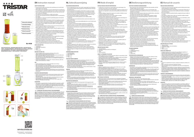 EN Instruction manual PT Manual de utilizador PL Instrukcja obsługi IT Manuale utente SV Bruksanvisning CS Návod na použití SK Návod na použitie BL-4438 PARTS DESCRIPTION / ONDERDELENBESCHRIJVING / DESCRIPTION DES PIÈCES / TEILEBESCHREIBUNG / DESCRIPCIÓN DE LAS PIEZAS / DESCRIÇÃO DOS COMPONENTES / OPIS CZĘŚCI / DESCRIZIONE DELLE PARTI / BESKRIVNING AV DELAR / POPIS SOUČÁSTÍ / POPIS SÚČASTÍ 1 2 1 4 2 5 ES Manual de usuario VEILIGHEIDSVOORSCHRIFTEN INSTRUCTIONS DE SÉCURITÉ IMPORTANTES WICHTIGE SICHERHEITSVORKEHRUNGEN PRECAUCIONES IMPORTANTES • Als de veiligheidsinstructies niet worden opgevolgd, kan de fabrikant niet verantwoordelijk worden gesteld voor schade die daar eventueel het gevolg van is. • Als de stroomkabel beschadigd is, dient deze te worden vervangen door de fabrikant, de onderhoudsmonteur van de fabrikant of door personen met een soortgelijke kwalificatie, om gevaar te voorkomen. • Verplaats het apparaat nooit door aan het snoer te trekken en zorg ervoor dat het snoer nergens in verstrikt kan raken. • Het apparaat moet worden geplaatst op een stabiele, vlakke ondergrond. • Laat het apparaat nooit onbeheerd achter wanneer de stekker in het stopcontact steekt. • Dit apparaat is alleen voor huishoudelijk gebruik en voor het doel waar het voor bestemd is. • Om kinderen te beschermen tegen de gevaren van elektrische apparatuur mag u ze nooit zonder toezicht bij het apparaat laten. Selecteer daarom een plek voor uw apparaat op dusdanige wijze dat kinderen er niet bij kunnen. Zorg ervoor dat het snoer niet naar beneden hangt. • Dompel het snoer, de stekker en/of het apparaat nooit in water of een andere vloeistof, dit om u te beschermen tegen een elektrische schok. • Dit apparaat mag niet worden gebruikt door kinderen. Houd het apparaat en het netsnoer altijd buiten bereik van kinderen. • Dit apparaat kan worden gebruikt door personen met vermindere geestelijke, zintuiglijke of mentale vermogens of gebrek aan ervaring of kennis, tenzij onder toezicht of na instructies m.b.t. het veilige gebruik van het apparaat, en mits zij de risico's die samengaan met het gebruik van het apparaat begrijpen. • Kinderen mogen niet spelen met het apparaat. • Schakel het apparaat uit en koppel het los van de netstroom, alvorens de opzetstukken te verwisselen of de bewegende onderdelen te benaderen. • Koppel het apparaat te allen tijde los als er geen toezicht is en alvorens het apparaat te monteren, te demonteren of te reinigen. • Buiten het bereik van kinderen houden indien er geen toezicht is. • OPMERKING: De hakmessen zijn zeer scherp. Vermijd fysiek contact tijdens het legen en reinigen van het apparaat. U kunt ernstig letsel oplopen. • Le fabricant ne sera pas tenu responsable de tous dommages si les consignes de sécurité ne sont pas respectées. • Si le cordon d’alimentation est endommagé, il doit être remplacé par le fabricant, son réparateur ou des personnes qualifiées afin d’éviter tout risque. • Ne jamais déplacer l’appareil en tirant sur le cordon et veillez à ce que ce dernier ne devienne pas entortillé. • L’appareil doit être posé sur une surface stable et nivelée. • Ne jamais utiliser l’appareil sans supervision. • Cet appareil est uniquement destiné à des utilisations domestiques et seulement dans le but pour lequel il est fabriqué. • Pour protéger les enfants des dangers des appareils électriques, veillez à ne jamais laisser les appareils sans surveillance. Par conséquent, il faudra choisir un lieu de rangement pour l’appareil inaccessible aux enfants. Veillez à ce que le cordon ne pende pas. • Ne pas immerger le cordon, la prise ou l’appareil dans de l’eau ou autre liquide afin de vous éviter un choc électrique. • Cet appareil ne doit pas être utilisé par des enfants. Gardez l'appareil et son cordon hors de portée des enfants. • Les appareils ne doivent pas être utilisés par des personnes dont les capacités physiques, sensorielles ou mentales sont réduites ou manquant d'expérience et de connaissance sauf si elles sont surveillées ou si elles ont reçu des instructions pour utiliser cet appareil en toute sécurité en étant conscientes des dangers liés. • Cet appareil n'est pas un jouet. • Eteignez l’appareil et débranchez-le du secteur avant de changer les accessoires, ou d’approcher de parties amovibles durant le fonctionnement • Débranchez toujours l’appareil du secteur si vous quittez la pièce et avant de le monter, le démonter ou le nettoyer. • Ne pas laisser les enfants jouer avec l’appareil. • REMARQUE : Les lames du hâchoir sont très tranchantes, évitez le contact physique lors du vidage et du nettoyage de l’appareil, vous pouvez vous blesser gravement. • Beim Ignorieren der Sicherheitshinweise kann der Hersteller nicht für Schäden haftbar gemacht werden. • Wenn das Stromkabel beschädigt ist, muss es von Hersteller, dem Kundendienst oder ähnlich qualifizierten Personen ersetzt werden, um Schäden zu vermeiden. • Bewegen Sie das Gerät niemals, indem Sie am Kabel ziehen, und achten Sie darauf, dass das Kabel nicht verwickelt wird. • Das Gerät muss auf einer ebenen, stabilen Fläche platziert werden. • Das Gerät darf nicht unbeaufsichtigt bleiben, während es am Netz angeschlossen ist. • Dieses Gerät darf nur für Haushaltszwecke, und für die Anwendung, für die es hergestellt wurde, verwendet werden. • Um Kinder vor den Gefahren eines Elektrogeräts zu schützen, müssen Sie darauf achten, dass das Gerät niemals unbeaufsichtigt ist. Aus diesem Grund müssen Sie für das Gerät einen Aufbewahrungsort auswählen, den Kinder nicht erreichen können. Achten Sie darauf, dass das Kabel nicht herunter hängt. • Um sich vor einem Stromschlag zu schützen, tauchen Sie das Kabel, den Stecker oder das Gerät niemals in Wasser oder eine andere Flüssigkeit. • Dieses Gerät darf von Kindern nicht verwendet werden. Halte