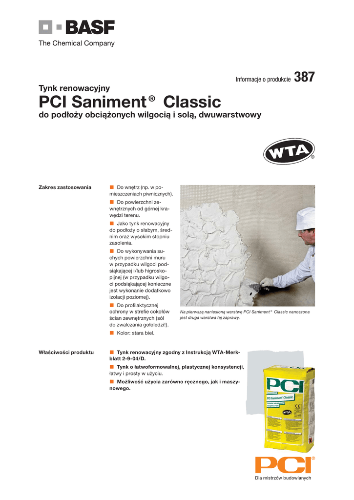 Informacje o produkcie Tynk renowacyjny 387 PCI Saniment® Classic do podłoży obciążonych wilgocią i solą, dwuwarstwowy WTA Zakres zastosowania Do wnętrz (np. w pomieszczeniach piwnicznych). Do powierzchni zewnętrznych od górnej krawędzi terenu. Jako tynk renowacyjny do podłoży o słabym, średnim oraz wysokim stopniu zasolenia. Do wykonywania suchych powierzchni muru w przypadku wilgoci podsiąkającej i/lub higroskopijnej (w przypadku wilgoci podsiąkającej konieczne jest wykonanie dodatkowo izolacji poziomej). Do profilaktycznej ochrony w strefie cokołów ścian zewnętrznych (sól do zwalczania gołoledzi!). Na pierwszą naniesioną warstwę PCI Saniment® Classic nanoszona jest druga warstwa tej zaprawy. Kolor: stara biel. Właściwości produktu Tynk renowacyjny zgodny z Instrukcją WTA-Merkblatt 2-9-04/D. Tynk o łatwoformowalnej, plastycznej konsystencji, łatwy i prosty w użyciu. Możliwość użycia zarówno ręcznego, jak i maszynowego. ® Dane odnośnie użycia / dane techniczne Dane materiałowo-technologiczne Baza materiałowa Mieszanka wapienno-cementowa z kruszywami mineralnymi i wysokiej jakości dodatkami uszlachetniającymi. Nie zawiera azbestu ani też innych włókien mineralnych. Brak szkodliwego dla zdrowia pylicogennego miałkiego pyłu krzemowego podczas użycia. Składniki produkt jednoskładnikowy Konsystencja proszkowa Frakcja uziarnienia 0 - 1,5 mm Oznaczenie zgodnie z: Rozporządzeniem o transporcie materia- produkt nie stanowi towaru niebezpiecznego łów niebezpiecznych (GGVSEB) Rozporządzeniem o substancjach niebezpiecznych (GefStoffV) drażniący, zawiera cement i wapno Bliższe informacje: patrz akapit „Wskazówki odnośnie bezpieczeństwa”. Trwałość składowania min. 6 miesięcy; przechowywać w miejscu suchym, unikać długotrwałego składowania w temperaturze powyżej +30 ºC Forma dostawy 25 kg worek z papieru z wkładką PE, nr art./ EAN 6487/0 Dane o technice stosowania Zużycie ok. 1,2 kg/m2 i mm grubości warstwy Ilość wody zarobowej - 1 kg proszku - 25 kg worek ok. 250 - 260 ml ok. 6,25 - 6,5 l Czas użycia* ok. 45 minut Temperatura użycia +5 ºC do +30 ºC Czas mieszania ok. 2 do 3 minut Czas dojrzewania ok. 5 minut Czas utwardzania* ok. 1 dzień / mm grubości tynku Grubość tynku - każda warstwa min. 10 mm maks. 20 mm * Przy temperaturze + 23 ºC i 50 % względnej wilgotności powietrza. Wyższe temperatury skracają, a niższe temperatury wydłużają podane czasy. PCI Saniment® Classic Agregat tynkarski G 4/CP 25 N 2 V + betoniarka o pracy ciągłej Przyłącze zasilania 400 V min. 25 A 400 V min. 25 A Kabel przyłączeniowy 32 A 5 × 4 mm2 32 A 5 × 4 mm2 Przyłącze wody 3/4"; min. 2,5 bar przy 3/4"; min. 2,5 bar przy pracującej maszynie pracującej maszynie Przewód ciśnieniowy do tłoczenia zapra- maks. 20 m wy LW 24 śr. maks. 20 m Przewód ciśnieniowy do tłoczenia zapra- maks. 2× 13,3 m LW35 maks. 2× 13,3 m LW35 wy LW 35 śr. + 1× 10 m LW24 + 1× 10 m LW24 Przygotowanie podłoża Przyłącze pompy D 6 - 3 ze sworzniem D 6 - 3 wf Spirala mieszadła standard - Wał mieszający - standard Mieszadło dodatkowe Rotoquirl - Opaska mocująca standard - Przepływomierz standard standard Narzędzie do tynkowania precyzyjnego standard standard Dysza do tynkowania precyzyjnego ø 14 ø 14 Dysza natrysku wodnego - - Górne/dolne przyłącze wody górne - Zapotrzebowanie na wodę ok. 250 l - Sprężarka K2/380 V - 600 l/h/380 V Handy K 2 Handy K 2 Moduł sterowniczy - duży Sonda poziomu napełnienia - wymagana Pistolet do kleju - - Ciśnienie zaprawy koniecznie wymagane koniecznie wymagane Uwagi Sprawdzić skrzydła mieszadła, wstępnie przeszlamować przewody Podłoże murowane z cegły, cegły wapienno-piaskowej, betonu komórkowego, kamienia łamanego lub cegły betonowej musi być wolne od niezwiązanych z podłożem lub utrudniających przyczepność elementów oraz być mocne i nośne. Starą powłokę tynkową należy usunąć na wysokość co najmniej 80 cm powyżej granicy zawilgocenia lub występowania wykwitów. Jeśli widoczna grani- ca wcześniejszej renowacji powłoki tynkowej przebiega wyżej, należy usunąć starą powłokę aż do tej linii. Odbity zawierający sól tynk należy niezwłocznie usunąć. Zmurszałą zaprawę do spoinowania należy wydrapać na głębokość co najmniej 2 cm. Następnie oczyścić dokładnie mur, np. za pomocą szczotki drucianej stalowej, i usunąć powstały pył. Co najmniej na 12 godzin przed naniesieniem PCI Saniment® Classic narzucić sieciowo PCI Saniment® HA jako obrzutkę (stopień pokrycia ok. 50%). Przy bardzo nierównomiernym podłożu tynkowym lub też przy bardzo szerokich i głębokich spoinach zaleca się naniesienie warstwy wyrównawczej z PCI Saniment® Classic. Sposób użycia PCI Saniment® Classic nanoszony jest dwuwarstwowo na narzuconą wcześniej obrzutkę na grubość 10 do 20 mm na warstwę. Pierwszą warstwę nanieść fachowo pacą. Zaleca się, by przed przystąpieniem do nanoszenia drugiej warstwy zachować przerwę ok. 1 dnia/mm grubości warstwy. Drugą warstwę tynku można nanosić najwcześniej wtedy, gdy powierzchnia warstwy pierwszej jest sucha. Przy sprzyjających warunkach schnięcia może to nastąpić po kilku dniach. W przypadku dużego obciążenia azotanami lub chlorkami oraz wysokiego stopnia zawilgocenia muru (> 40%) konieczne jest nanoszenie tynku metodą dwuwarstwową przy łącznej grubości warstw 25 do 40 mm (w zależności od obciążenia solą), przy czym każda z warstw tynku renowacyjnego musi mieć co najmniej 10 mm grubości. 1 Przygotowanie tynku: Mieszadło mechaniczne: przygotować wodę w naczyniu zarobowym, powoli dodać suchą zaprawę, mieszać przez ok. 2 do 3 minut. Ilość wody zarobowej : ok. 6,25 do 6,5 l wody wodociągowej / worek 25 kg. Maszyny z pompami mieszającymi: brak wymogów szczególnych w porównaniu do standardowej techniki zastosowań. Poza czystą wody do suchej mieszanki nie