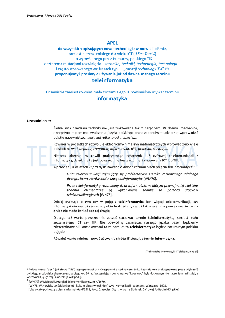Warszawa, Marzec 2016 roku APEL do wszystkich opisujących nowe technologie w mowie i piśmie, zamiast niezrozumiałego dla wielu ICT ( I See Tea ) lub wymyślonego przez tłumaczy, polskiego TIK z czterema mutacjami rozwinięcia – technika, techniki, technologia, technologii … i często stosowanego we frazach typu – „rozwój technologii TIK” proponujemy i prosimy o używanie już od dawna znanego terminu teleinformatyka Oczywiście zamiast również mało zrozumiałego IT powinniśmy używać terminu informatyka. Uzasadnienie: Żadna inna dziedzina techniki nie jest traktowana takim żargonem. W chemii, mechanice, energetyce – pomimo zwalczania języka polskiego przez zaborców – udało się wprowadzić polskie nazewnictwo: tlen1, nakrętka, prąd, napięcie,… Również w początkach rozwoju elektronicznych maszyn matematycznych wprowadzono wiele polskich nazw: komputer, translator, informatyka, plik, procesor, serwer,…. Niestety obecnie, w chwili praktycznego połączenia już cyfrowej telekomunikacji z informatyką, dziedzina ta jest powszechnie bez zrozumienia nazywana ICT lub TIK. A przecież już w latach 78/79 dyskutowano o dwóch rozumieniach pojęcia teleinformatyka2: Dział telekomunikacji zajmujący się problematyką szeroko rozumianego zdalnego dostępu komputerów nosi nazwę teleinformatyka [WM79]. Przez teleinformatykę rozumiemy dział informatyki, w którym przynajmniej niektóre zadania elementarne są wykonywane zdalnie za pomocą środków telekomunikacyjnych [WN78]. Dzisiaj dyskusja o tym czy w pojęciu teleinformatyka jest więcej telekomunikacji, czy informatyki nie ma już sensu, gdy obie te dziedziny są już tak wzajemnie powiązane, że żadna z nich nie może istnieć bez tej drugiej. Dlatego też warto powszechnie zacząć stosować termin teleinformatyka, zamiast mało zrozumiałego ICT czy TIK. Nie pozwólmy zaśmiecać naszego języka. Jeżeli będziemy zdeterminowani i konsekwentni to za parę lat to teleinformatyka będzie naturalnym polskim pojęciem. Również warto minimalizować używanie skrótu IT stosując termin informatyka. [Polska Izba Informatyki i Telekomunikacji] 1 Polską nazwą "tlen" (od słowa "tlić") zaproponował Jan Oczapowski przed rokiem 1851 i została ona zaakceptowana przez większość polskiego środowiska chemicznego w ciągu ok. 10 lat. Wcześniejsza polska nazwa "kwasoród" była dosłownym tłumaczeniem łacińskiej, a wprowadził ją Jędrzej Śniadecki [z Wikipedii]. 2 [WM79] W.Majewski, Przegląd Telekomunikacyjny, nr 4/1979, [WN78] W.Nowicki, „O ścisłość pojęć i kulturę słowa w technice” Wyd. Komunikacji i Łączności, Warszawa, 1978. [oba cytaty pochodzą z pisma Informatyka 4/1981, Wyd. Czasopism Sigma – skan z Biblioteki Cyfrowej Politechniki Śląskiej]