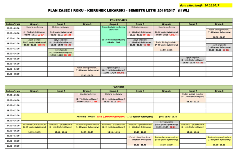 data aktualizacji: 20.01.2017 PLAN ZAJĘĆ I ROKU – KIERUNEK LEKARSKI – SEMESTR LETNI 2016/2017 (II WL) PONIEDZIAŁEK Godzina/grupa Grupa 1 Grupa 2 08.00 – 09.00 Historia medycyny Historia medycyny (1 - 7 tydzień dydaktyczny) 09.00 – 10.00 10.00 – 11.00 11.00 – 12.00 Grupa 3 Grupa 4 Grupa 5 Grupa 6 Propedeutyka medycyny uzależnień Historia medycyny Historia medycyny (1 - 7 tydzień dydaktyczny) (8 - 14 tydzień dydaktyczny) (8 - 14 tydzień dydaktyczny) 08.00 - 10.15 CD 204 08.00 - 10.15 CBI 123 08.00 - 10.15 CBI 123 08.00 - 10.15 CBI 124 Język łaciński Język angielski (6 - 10 tydzień dydaktyczny) Język angielski (1 - 15 tydzień dydaktyczny) (1 - 15 tydzień dydaktyczny) 08.00 - 12.00 (1 - 15 tydzień dydaktyczny) Podst. biologii moleku. 10.30 - 12.00 CBI 106 10.30 - 12.00 CD 126 10.30 - 12.00 CD 205 (7 - 13 tydzień dydaktyczny) Grupa 7 Grupa 8 Podst. biologii moleku. (7 - 13 tydzień dydaktyczny) 08.30 - 10.45 Język angielski (1 - 15 tydzień dydaktyczny) 12.00 – 13.00 Język łaciński 11.00 - 13.15 11.30 - 13.00 CD 203 (1 - 15 tydzień dydaktyczny) 13.00 – 14.00 12.30 - 14.00 CBI 106 Język angielski 14.00 – 15.00 (1 - 15 tydzień dydaktyczny) 14.00 - 15.30 CD 126 15.00 – 16.00 16.00 – 17.00 Podst. biologii moleku. Język angielski (7 - 13 tydzień dydaktyczny) (1 - 15 tydzień dydaktyczny) 16.00 - 17.30 CD 203 17.00 – 18.00 15.45 - 18.00 WTOREK Godzina/grupa Grupa 1 Grupa 2 08.00 – 09.00 Grupa 3 Grupa 4 Historia medycyny Historia medycyny (1 - 7 tydzień dydaktyczny) (8 - 14 tydzień dydaktyczny) 08.00 - 10.15 CD 221 08.00 - 10.15 CD 221 Grupa 5 Grupa 6 Grupa 7 Grupa 8 Podst. biologii moleku. (7 - 13 tydzień dydaktyczny) 09.00 – 10.00 08.00 - 10.15 10.00 – 11.00 11.00 – 12.00 12.00 – 13.00 Anatomia - wykład aula B (Centrum Dydaktyczne) (1 - 15 tydzień dydaktyczny) 13.00 – 14.00 14.00 – 15.00 15.00 – 16.00 16.00 – 17.00 17.00 – 18.00 18.00 – 19.00 godz. 12.00 - 13.30 Język angielski Anatomia - prosektorium Anatomia - prosektorium Anatomia - prosektorium Anatomia - prosektorium Anatomia - prosektorium (1 - 15 tydzień dydaktyczny) Anatomia - prosektorium (1 - 15 tydzień dydaktyczny) (1 - 15 tydzień dydaktyczny) (1 - 15 tydzień dydaktyczny) (1 - 15 tydzień dydaktyczny) (1 - 15 tydzień dydaktyczny) 13.35 - 15.05 CD 211 (1 - 15 tydzień dydaktyczny) 14.15 - 16.15 14.15 - 16.15 14.15 - 16.15 14.15 - 16.15 14.15 - 16.15 14.15 - 16.15 Podst. biologii moleku. Anatomia - prosektorium Anatomia - prosektorium (7 - 13 tydzień dydaktyczny) (1 - 15 tydzień dydaktyczny) (1 - 15 tydzień dydaktyczny) 16.30 - 18.45 16.30 - 18.30 16.30 - 18.30 ŚRODA Godzina/grupa Grupa 1 08.00 – 09.00 09.00 – 10.00 10.00 – 11.00 11.00 – 12.00 Język angielski Grupa 2 Grupa 3 Podst. biologii moleku. Propedeutyka medycyny uzależnień Grupa 4 Grupa 7 Grupa 8 Historia medycyny Historia medycyny Język łaciński (1 - 15 tydzień dydaktyczny) (1 - 7 tydzień dydaktyczny) (8 - 14 tydzień dydaktyczny) 08.00 - 10.15 08.30 - 10.00 CD 203 08.00 - 10.15 CBI 119 08.00 - 10.15 CBI 119 Grupa 7 Grupa 8 (6 - 10 tydzień dydaktyczny) Podst. biologii moleku. 09.45 - 11.15 8.00 - 12.00 (7 - 13 tydzień dydaktyczny) Propedeutyka medycyny uzależnień 10.30 - 12.45 Język angielski Język łaciński (1 - 15 tydzień dydaktyczny) (1 - 15 tydzień dydaktyczny) 13.30 - 15.00 CBI 126 12.30 - 14.00 CD 140 wyjąt. 29 marca- CBI 206 13.00 – 14.00 14.00 – 15.00 Grupa 6 (7 - 13 tydzień dydaktyczny) 1 - 6 tydzień dyd. CD 140 7 - 15 tydzień dyd. CBI 118 12.00 – 13.00 Grupa 5 (6 - 10 tydzień dydaktyczny) 12.00 - 16.00 15.00 – 16.00 CZWARTEK Godzina/grupa Grupa 1 Grupa 2 Grupa 3 Grupa 4 Grupa 5 Grupa 6 08.00 – 09.00 BHP - wykład - sala im. prof. Grucy, ul. Lindleya 4 TERMINY: 16 i 23 lutego godz. 08.00 - 10.00 09.00 – 10.00 10.00 – 11.00 11.00 – 12.00 12.00 – 13.00 Podst. biologii moleku. Język łaciński Propedeutyka medycyny uzależnień (1 - 15 tydzień dydaktyczny) (6 - 10 tydzień dydaktyczny) 10.30 - 12.00 CD 127 8.00 - 12.00 (7 - 13 tydzień dydaktyczny) 13.00 – 14.00 11.30 - 13.45 14.00 – 15.00 Anatomia - prosektorium Anatomia - prosektorium Anatomia - prosektorium Anatomia - prosektorium Anatomia - prosektorium Anatomia - prosektorium (1 - 15 tydzień dydaktyczny) (1 - 15 tydzień dydaktyczny) (1 - 15 tydzień dydaktyczny) (1 - 15 tydzień dydaktyczny) (1 - 15 tydzień dydaktyczny) (1 - 15 tydzień dydaktyczny) 14.15 - 16.15 14.15 - 16.15 14.15 - 16.15 14.15 - 16.15 14.15 - 16.15 14.15 - 16.15 15.00 – 16.00 16.00 – 17.00 17.00 – 18.00 18.00 – 19.00 Anatomia - prosektorium Anatomia - prosektorium (1 - 15 tydzień dydaktyczny) (1 - 15 tydzień dydaktyczny) 16.30 - 18.30 16.30 - 18.30 PIĄTEK Grupa 1 Godzina/grupa Grupa 2 Grupa 3 Grupa 4 Grupa 5 Grupa 6 Grupa 7 08.00 – 09.00 Histologia z embriologią - wykład aula im. prof. Paszkiewicza, ul. Chałubińskiego 5 TERMINY: 17, 24 lutego; 31 marca; 07 kwietnia; 12 maja; godz. 08.45 - 09.30 09.00 – 10.00 10.00 – 11.00 Histologia z embriologią - sem. + ćw. (1 - 15 tydzień dydaktyczny) Anatomicum, sala mikroskopowa, ul. Chałubińskiego 5 11.00 – 13.00 godz. 10.30 - 13.00 13.00 – 14.00 Historia medycyny - wykład sala im. prof. Grucy, ul. Lindleya 4 (1 - 7 tydzień dydaktyczny) 14.00 – 15.00 Tygodnie dydaktyczne: 12345678- 13.II. - 17.II.2017 20.II. - 24.II.2017 27.II. - 03.III.2017 06.III. - 10.III.2017 13.III. - 17.III.2017 20.III. - 24.III.2017 27.III. - 31.III.2017 03.IV. - 07.IV.2017 910 11 12 13 14 15 - 10.IV. - 14.IV.2017 24.IV. - 28.IV.2017 08.V. - 12.V.2017 15.V. - 19.V.2017 22.V. - 26.V.2017 29.V. - 02.VI.2017 05.VI. - 09.VI.2017 godz. 13.15 - 15.30 Grupa 8 SEMINARIA I ĆWICZENIA Anatomia Histologia z embriologia Historia medycyny Jednostka prowadząca zajęcia: Miejsce zajęć: Jednostki prowadzące zajęcia: Miejsce zajęć: Jednostka prowadząca zajęcia: Miejsce zajęć: Propedeutyka medycyny uzależnień Jednostki prowadzące zajęcia: Zakład Anatomii Prawid