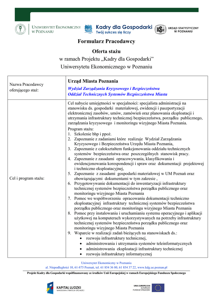 Formularz Pracodawcy Oferta stażu w ramach Projektu „Kadry dla Gospodarki” Uniwersytetu Ekonomicznego w Poznaniu Nazwa Pracodawcy oferującego staż: Cel i program stażu: Urząd Miasta Poznania Wydział Zarządzania Kryzysowego i Bezpieczeństwa Oddział Technicznych Systemów Bezpieczeństwa Miasta Cel nabycie umiejętności w specjalności: specjalista administracji na stanowisku ds. gospodarki materiałowej, ewidencji i paszportyzacji elektronicznej zasobów, umów, zamówień oraz planowania eksploatacji i utrzymania infrastruktury technicznej bezpieczeństwa, porządku publicznego, zarządzania kryzysowego i monitoringu wizyjnego Miasta Poznania. Program stażu: 1. Szkolenie bhp i ppoż. 2. Zapoznanie z zadaniami które realizuje Wydział Zarządzania Kryzysowego i Bezpieczeństwa Urzędu Miasta Poznania, 3. Zapoznanie z całokształtem funkcjonowania oddziału technicznych systemów bezpieczeństwa oraz poszczególnych stanowisk pracy. 4. Zapoznanie z zasadami opracowywania, klasyfikowania i ewidencjonowania korespondencji i spraw oraz dokumentacji projektowej i techniczno eksploatacyjnej, 5. Zapoznanie z zasadami gospodarki materiałowej w UM Poznań oraz obowiązującymi dokumentami w tym zakresie , 6. Przygotowywanie dokumentacji do inwentaryzacji infrastruktury technicznej systemów bezpieczeństwa porządku publicznego oraz monitoringu wizyjnego Miasta Poznania 7. Pomoc we współtworzeniu opracowaniu dokumentacji techniczno eksploatacyjnej infrastruktury technicznej systemów bezpieczeństwa porządku publicznego oraz monitoringu wizyjnego Miasta Poznania 8. Pomoc przy instalowaniu i uruchamianiu systemu operacyjnego i aplikacji użytkowej na komputerach wykorzystywanych na potrzeby infrastruktury technicznej systemów bezpieczeństwa porządku publicznego oraz monitoringu wizyjnego Miasta Poznania 9. Wsparcie w realizacji zadań bieżących na stanowiskach ds.: rozwoju infrastruktury technicznej, administrowania i utrzymania systemów teleinformatycznych administrowania eksploatacji infrastruktury technicznej rozwoju infrastruktury informatycznej Uniwersytet Ekonomiczny w Poznaniu al. Niepodległości 10, 61-875 Poznań, tel. 61 854 36 80, 61 854 37 22, www.kdg.ue.poznan.pl Projekt Kadry dla Gospodarki współfinansowany ze środków Unii Europejskiej w ramach Europejskiego Funduszu Społecznego Wymagania: Student Wydziału Informatyki i Gospodarki Elektronicznej UEP Obszary merytoryczne, z którymi stażysta ma szansę się zapoznać: gospodarka materiałowa, ewidencja i paszportyzacja zasobów, umowy, zamówienia, planowanie eksploatacji i utrzymania oraz administrowanie zasobami infrastruktury technicznej bezpieczeństwa, porządku publicznego, zarządzania kryzysowego i monitoringu wizyjnego Miasta Poznania Liczba stażystów, którą Pracodawca może przyjąć: 2 (dwie osoby) Miejsce odbywania stażu (w tym miasto): UM Poznań, WZKiB ul. Libelta 16/20 oraz w terenie w obszarze lokalizacji infrastruktury Preferowane terminy staży: Lipiec – listopad 2014 r. Uniwersytet Ekonomiczny w Poznaniu al. Niepodległości 10, 61-875 Poznań, tel. 61 854 36 80, 61 854 37 22, www.kdg.ue.poznan.pl Projekt Kadry dla Gospodarki współfinansowany ze środków Unii Europejskiej w ramach Europejskiego Funduszu Społecznego