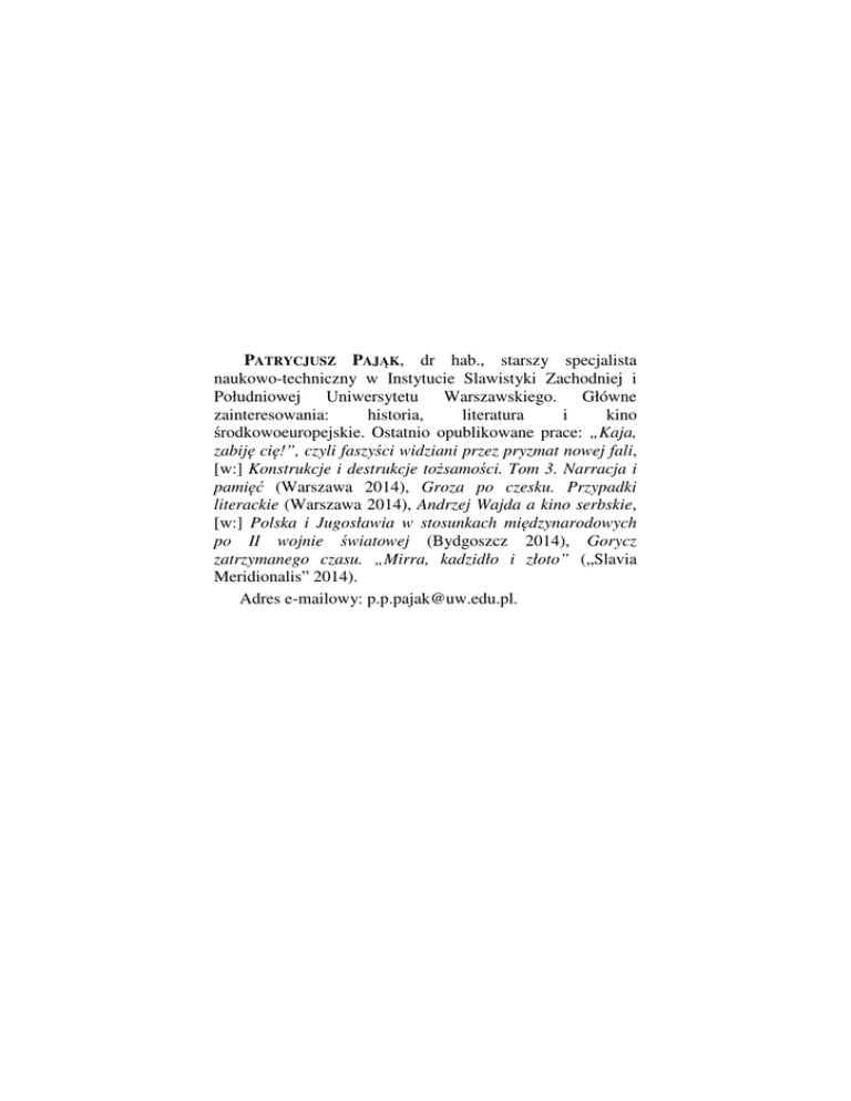 PATRYCJUSZ PAJĄK, dr hab., starszy specjalista naukowo-techniczny w Instytucie Slawistyki Zachodniej i Południowej Uniwersytetu Warszawskiego. Główne zainteresowania: historia, literatura i kino środkowoeuropejskie. Ostatnio opublikowane prace: „Kaja, zabiję cię!”, czyli faszyści widziani przez pryzmat nowej fali, [w:] Konstrukcje i destrukcje tożsamości. Tom 3. Narracja i pamięć (Warszawa 2014), Groza po czesku. Przypadki literackie (Warszawa 2014), Andrzej Wajda a kino serbskie, [w:] Polska i Jugosławia w stosunkach międzynarodowych po II wojnie światowej (Bydgoszcz 2014), Gorycz zatrzymanego czasu. „Mirra, kadzidło i złoto” („Slavia Meridionalis” 2014). Adres e-mailowy: [email protected].