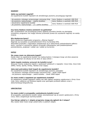 NAGRODY Jakie są wartości nagród? Za wypełnienie butelki kapslami do określonego poziomu przysługują nagrody: do poziomu niższego oznaczonego czerwoną linią do poziomu najwyższego – (pełna butelka) dwukrotne napełnienie butelki do poziomu najwyższego – (2 x pełna butelka) bony Sodexo o wartości 200 PLN bony Sodexo o wartości 400 PLN bony Sodexo o wartości 600 PLN Czy bony Sodexo można zamienić na gotówkę? Nie. Uczestnikom nie przysługuje prawo żądania wymiany bonów na pieniądze. Uczestnicy programu nie mogą również przenieść prawa do uzyskania nagrody na osoby trzecie. Kto dostarcza bony? Bony dostarcza Organizator programu „Zbieraj Kapsle”. Nagrody są wysyłane za pośrednictwem firmy kurierskiej DHL. Wszystkie przesyłki z nagrodami zaopatrzone są w dokumenty potwierdzenia odbioru bonu. Laureat w momencie odbioru przesyłki zobowiązany jest podstemplować potwierdzenie, podpisać i oddać się i oddać je kurierowi. KAPSLE Ile czasu mam na zbieranie kapsli? Każdy lokal na zapełnienie butelki ma maksymalnie 2 miesiące licząc od dnia zawarcia umowy, jednak nie dłużej niż do dnia 31 lipca 2016 r. Jakie kapsle możemy wrzucać do butelki/urny? Wrzucać można wyłącznie kapsle z opakowań szklanych z napojów: Coca Cola, Coca Cola ZERO, Fanta, Sprite, Kinley, Nestea oraz Cappy. Jaka jest potrzebna ilość kapsli do zapełnienia butelki? Do wypełnienie butelki kapslami do określonego poziomu potrzeba: - do poziomu niższego oznaczonego czerwoną linią – około 2500 kapsli - do poziomu najwyższego – pełna butelka – około 3000 kapsli Co mam zrobić z kapslami po zapełnieniu butelki? Po zapełnieniu butelki kapslami należy ten fakt zgłosić swojemu opiekunowi z firmy Coca Cola, który odbierze od Państwa kapsle oraz sporządzi protokół odbioru wraz z dokumentacją fotograficzną. URNY/BUTELKI Co mam zrobić w przypadku uszkodzenia butelki/urny? W przypadku uszkodzenia butelki należy skontaktować się ze swoim opiekunem z firmy Coca, który zorganizuje wyminę butelki. Czy biorąc udział w 1 etapie programu mogę się zgłosić do 2 etapu? Nie, każdy lokal może wziąć udział tylko w jednym etapie. Ile butelek/urn mogę zapełnić podczas udziału w programie. Dany lokal może maksymalnie dwukrotnie zapełnić butelkę. Po ponownym zapełnieniu butelki udział w programie zostaje automatycznie zakończony. Czy butelkę/urnę mogę postawić na zapleczu? Nie, butelka powinna być ustawiona w miejscu widocznym dla klientów. Co mam zrobić z dostarczonym plakatem A3 z regulaminem? Plakat należy zawiesić na zapleczu w miejscu widocznym dla personelu. Komu zgłosić zapełnioną kapslami butelkę? Po zapełnieniu butelki kapslami należy ten fakt zgłosić swojemu opiekunowi z firmy Coca Cola, który odbierze od Państwa kapsle oraz sporządzi protokół odbioru wraz z dokumentacją fotograficzną. Czy po zakończeniu udziału w akcji można zatrzymać kapsle i butelkę? Nie, zarówno kapsle jak i butelkę odbierze od Państwa opiekun z firmy Coca Cola.