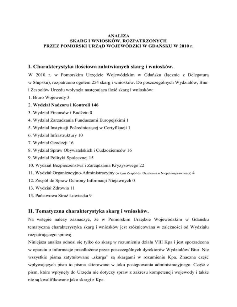 ANALIZA SKARG I WNIOSKÓW, ROZPATRZONYCH PRZEZ POMORSKI URZĄD WOJEWÓDZKI W GDAŃSKU W 2010 r. I. Charakterystyka ilościowa załatwianych skarg i wniosków. W 2010 r. w Pomorskim Urzędzie Wojewódzkim w Gdańsku (łącznie z Delegaturą w Słupsku), rozpatrzono ogółem 254 skarg i wniosków. Do poszczególnych Wydziałów, Biur i Zespołów Urzędu wpłynęła następująca ilość skarg i wniosków: 1. Biuro Wojewody 3 2. Wydział Nadzoru i Kontroli 146 3. Wydział Finansów i BudŜetu 0 4. Wydział Zarządzania Funduszami Europejskimi 1 5. Wydział Instytucji Pośredniczącej w Certyfikacji 1 6. Wydział Infrastruktury 10 7. Wydział Geodezji 16 8. Wydział Spraw Obywatelskich i Cudzoziemców 16 9. Wydział Polityki Społecznej 15 10. Wydział Bezpieczeństwa i Zarządzania Kryzysowego 22 11. Wydział Organizacyjno-Administracyjny (w tym Zespół ds. Orzekania o Niepełnosprawności) 4 12. Zespół do Spraw Ochrony Informacji Niejawnych 0 13. Wydział Zdrowia 11 13. Państwowa StraŜ Łowiecka 9 II. Tematyczna charakterystyka skarg i wniosków. Na wstępie naleŜy zaznaczyć, Ŝe w Pomorskim Urzędzie Wojewódzkim w Gdańsku tematyczna charakterystyka skarg i wniosków jest zróŜnicowana w zaleŜności od Wydziału rozpatrującego sprawę. Niniejsza analiza odnosi się tylko do skarg w rozumieniu działu VIII Kpa i jest sporządzona w oparciu o informacje przedłoŜone przez poszczególnych dyrektorów Wydziałów/ Biur. Nie wszystkie pisma zatytułowane „skarga” są skargami w rozumieniu Kpa. Znaczna część wpływających pism to pisma skierowane w toku postępowania administracyjnego. Część z pism, które wpłynęły do Urzędu nie dotyczy spraw z zakresu kompetencji wojewody i takŜe nie są kwalifikowane jako skargi z Kpa. W przypadku skarg i wniosków, wpływających do Biura Wojewody, większość spraw dotyczyła decyzji organów administracji rządowej lub samorządowej, niezgodnych z oczekiwaniami skarŜących lub przewlekłości postępowania w ich wydawaniu. W wielu przypadkach zakres poruszanych problemów nie dotyczył kompetencji Wojewody. Większość skarg i spraw, z którymi zapoznali się Wojewoda i Wicewojewoda dotyczyła zakresu działalności działań samorządów, Wydziału Infrastruktury, Wydziału Geodezji, Wydziału Polityki Społecznej, Wydziału Spraw Obywatelskich i Cudzoziemców, Policji, Pomorskiego Wojewódzkiego Konserwatora Zabytków, Pomorskiego Wojewódzkiego Inspektora Nadzoru Budowlanego oraz spłaty zobowiązań względem Skarbu Państwa. Wydział Nadzoru i Kontroli - był adresatem skarg i wniosków dotyczących przede wszystkim działalności, bądź bezczynności organów jednostek samorządu terytorialnego, a takŜe samorządowych jednostek organizacyjnych, przewodniczących rad gmin/miast oraz działań urzędów gmin/miast. Wpływały równieŜ skargi dotyczące działań prowadzonych przez organy administracji zespolonej: Pomorskiego Wojewódzkiego Inspektora Nadzoru Budowlanego, Pomorskiego Wojewódzkiego Lekarza Wojewódzkiego Weterynarii. Konserwatora Zdarzały się Zabytków, Pomorskiego równieŜ skargi na osoby i przedsiębiorstwa prywatne. Tematyka spraw wpływających do Wydziału, obejmowała następujące zagadnienia: gospodarowanie gminnym zasobem mieszkaniowym, gospodarkę mieniem komunalnym, złego stanu dróg, ogólnego stosowania przez organy nadzoru budowlanego przepisów ustawy Prawo budowlane oraz innych spraw nie naleŜących do kompetencji Wydziału. Jednocześnie szczególną grupą skarg i wniosków były sprawy związane z szeroko pojętą ochroną środowiska. Do przykładowych spraw naleŜy zaliczyć zagadnienia obejmujące melioracje wodne, kanalizacji, środowisko odpadów w Wiślince czy ŁęŜycach. Ponadto przekazano kilka spraw do organów samorządu terytorialnego i Pomorskiego Wojewódzkiego Inspektora Ochrony Środowiska w zakresie hałasu. NaleŜy równieŜ zaznaczyć Ŝe Wydział Nadzoru i Kontroli oprócz opisywanych skarg i wniosków w 2010 r. rozpatrzył teŜ wiele pism od obywateli, nie będących skargami ani wnioskami w rozumieniu DZIALU VIII Kpa. Ze względu na brak w Urzędzie komórki zajmującej się rozpatrywaniem pism w sprawach nie naleŜących do kompetencji Wojewody – załatwianie ich naleŜy do obowiązków pracowników Wydziału Nadzoru i Kontroli. Przedmiotem skarg wpływających do Wydziału Infrastruktury były skargi na działalność lub bezczynność urzędników jednostek samorządu terytorialnego, skargi na wydane decyzje przez jednostki samorządu terytorialnego, a takŜe skargi związane z prowadzoną organizacją ruchu drogowego, która zdaniem skarŜących pogarsza bezpieczeństwo ruchu drogowego. Tematem składanych skarg były równieŜ sprawy dotyczące opracowywanych i uchwalonych miejscowych planów oraz odmowy wydania pozwolenia na budowę. Wydział Geodezji - rozpatrywał skargi i wnioski dotyczące spraw z zakresu: nieruchomości, działalności organów administracji publicznej związanych z wykonywaniem zadań z dziedziny geodezji i kartografii. Zdarzały się równieŜ skargi na bezczynność organów administracji publicznej Skargi wnoszone do Wydziału Spraw Obywatelskich i Cudzoziemców dotyczyły prowadzenia postępowań w zakresie paszportów, cudzoziemców i ewidencji ludności. Wnoszono równieŜ skargi na brak informacji o zasadach przyjmowania wniosków paszportowych i braku zachowania pisemnej formy wezwań do stron postępowania. Głównymi przyczynami wnoszenia skarg do Wydziału Polityki Społecznej było niezadowolenie skarŜących ze sposobu załatwiania spraw przez ośrodki pomocy społecznej w zakresie udzielania pomocy finansowej dla osób starszych, rodzin, osób bezrobotnych i osób niepełnosprawnych. Zarzuty bezrobotnych na działalność powiatowych urzędów pracy. W przypadku skarg wnoszonych na organizatorów turnusów rehabilitacyjnych i Domów pomocy społecznej było niezadowolenie z usług świadczonych przez ośrodki re
