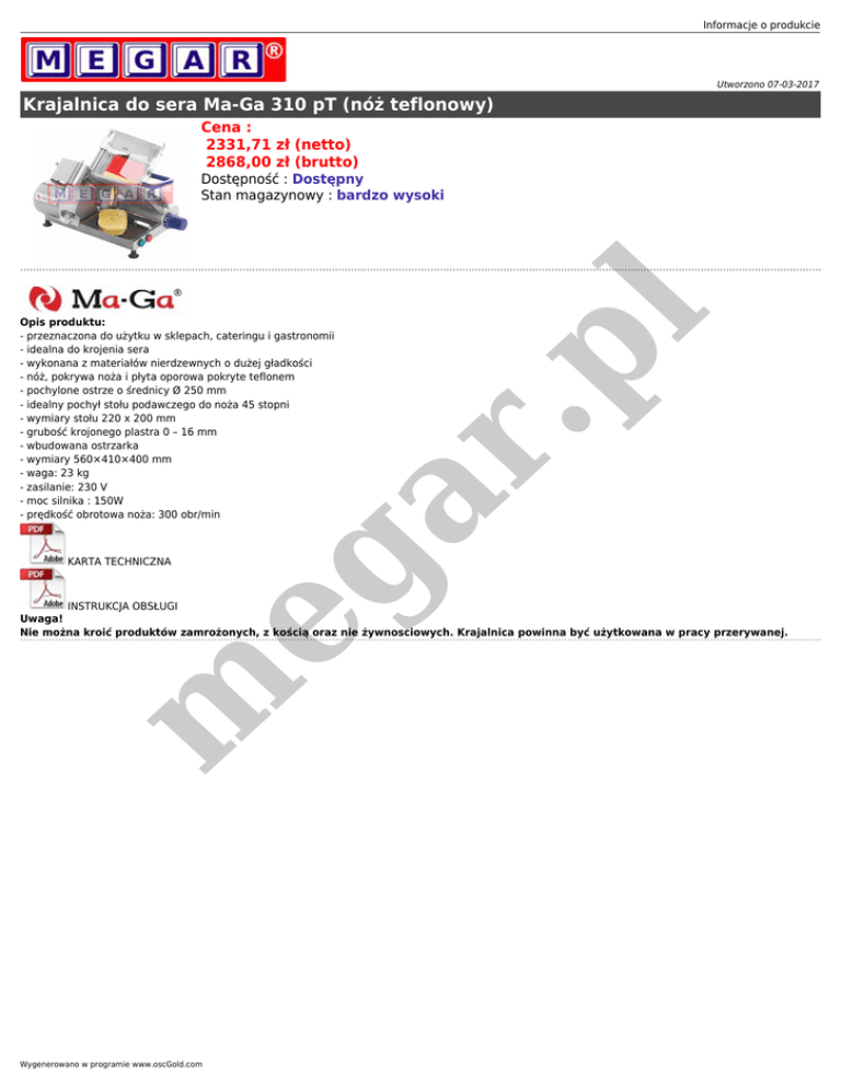 Informacje o produkcie Utworzono 07-03-2017 Krajalnica do sera Ma-Ga 310 pT (nóż teflonowy) Cena : 2331,71 zł (netto) 2868,00 zł (brutto) eg ar Opis produktu: - przeznaczona do użytku w sklepach, cateringu i gastronomii - idealna do krojenia sera - wykonana z materiałów nierdzewnych o dużej gładkości - nóż, pokrywa noża i płyta oporowa pokryte teflonem - pochylone ostrze o średnicy Ø 250 mm - idealny pochył stołu podawczego do noża 45 stopni - wymiary stołu 220 x 200 mm - grubość krojonego plastra 0 – 16 mm - wbudowana ostrzarka - wymiary 560×410×400 mm - waga: 23 kg - zasilanie: 230 V - moc silnika : 150W - prędkość obrotowa noża: 300 obr/min .p l Dostępność : Dostępny Stan magazynowy : bardzo wysoki KARTA TECHNICZNA m INSTRUKCJA OBSŁUGI Uwaga! Nie można kroić produktów zamrożonych, z kością oraz nie żywnosciowych. Krajalnica powinna być użytkowana w pracy przerywanej. Wygenerowano w programie www.oscGold.com