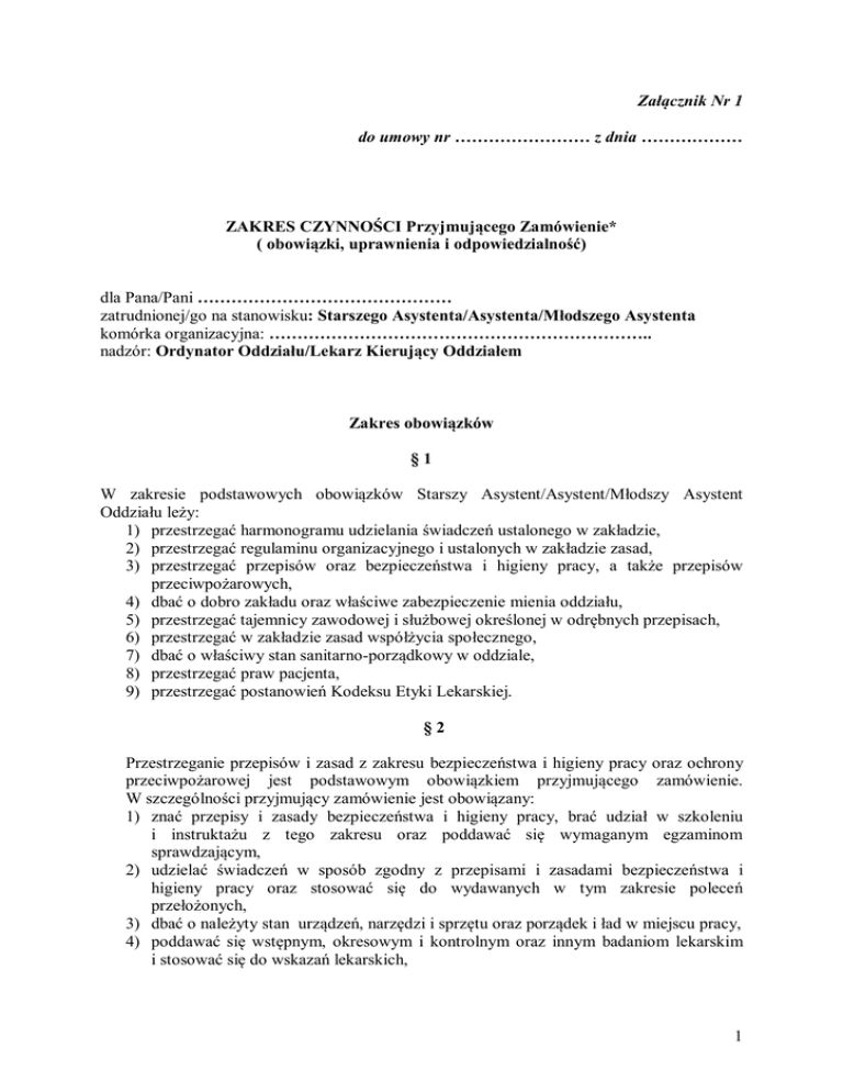 Załącznik Nr 1 do umowy nr …………………… z dnia ……………… ZAKRES CZYNNOŚCI Przyjmującego Zamówienie* ( obowiązki, uprawnienia i odpowiedzialność) dla Pana/Pani ……………………………………… zatrudnionej/go na stanowisku: Starszego Asystenta/Asystenta/Młodszego Asystenta komórka organizacyjna: ………………………………………………………….. nadzór: Ordynator Oddziału/Lekarz Kierujący Oddziałem Zakres obowiązków §1 W zakresie podstawowych obowiązków Starszy Asystent/Asystent/Młodszy Asystent Oddziału leży: 1) przestrzegać harmonogramu udzielania świadczeń ustalonego w zakładzie, 2) przestrzegać regulaminu organizacyjnego i ustalonych w zakładzie zasad, 3) przestrzegać przepisów oraz bezpieczeństwa i higieny pracy, a także przepisów przeciwpożarowych, 4) dbać o dobro zakładu oraz właściwe zabezpieczenie mienia oddziału, 5) przestrzegać tajemnicy zawodowej i służbowej określonej w odrębnych przepisach, 6) przestrzegać w zakładzie zasad współżycia społecznego, 7) dbać o właściwy stan sanitarno-porządkowy w oddziale, 8) przestrzegać praw pacjenta, 9) przestrzegać postanowień Kodeksu Etyki Lekarskiej. §2 Przestrzeganie przepisów i zasad z zakresu bezpieczeństwa i higieny pracy oraz ochrony przeciwpożarowej jest podstawowym obowiązkiem przyjmującego zamówienie. W szczególności przyjmujący zamówienie jest obowiązany: 1) znać przepisy i zasady bezpieczeństwa i higieny pracy, brać udział w szkoleniu i instruktażu z tego zakresu oraz poddawać się wymaganym egzaminom sprawdzającym, 2) udzielać świadczeń w sposób zgodny z przepisami i zasadami bezpieczeństwa i higieny pracy oraz stosować się do wydawanych w tym zakresie poleceń przełożonych, 3) dbać o należyty stan urządzeń, narzędzi i sprzętu oraz porządek i ład w miejscu pracy, 4) poddawać się wstępnym, okresowym i kontrolnym oraz innym badaniom lekarskim i stosować się do wskazań lekarskich, 1 5) niezwłocznie zawiadomić o zauważonym w zakładzie pracy wypadku albo zagrożeniu życia lub zdrowia ludzkiego oraz ostrzec innych pracowników, a także inne osoby znajdujące się w rejonie zagrożenia, o grożącym im niebezpieczeństwie, 6) współdziałać z udzielającym zamówienie w wypełnianiu obowiązków dotyczących bezpieczeństwa i higieny pracy, 7) przestrzegać zakładowej instrukcji bezpieczeństwa pożarowego. §3 Starszy Asystent/Asystent/Młodszy Asystent zobowiązany jest do udzielania świadczeń zdrowotnych zgodnie z: 1. obowiązującymi w tym zakresie przepisami prawa, 2. wskazaniami aktualnej wiedzy medycznej, 3. dostępnymi środkami i metodami zapobiegania, rozpoznawania i leczenia chorób, 4. zasadami etyki lekarskiej, 5. poszanowaniem praw pacjenta, 6. powszechnie obowiązującymi, a także dotyczącymi Zakładu, uregulowaniami w zakresie reglamentacji środków medycznych ograniczającymi zasady refundacji lekarstw. W zakresie obowiązków (czynności) szczegółowych Starszy Asystent/Asystent/Młodszy Asystent jest obowiązany: 1. sprawowanie opieki nad chorymi przydzielonymi przez Ordynatora/Lekarza Kierującego Oddziałem, 2. kwalifikowanie pacjentów do przyjęcia na oddział po przeprowadzeniu niezbędnej diagnostyki w tym zakresie, 3. diagnozowanie wstępne oraz opisanie tych czynności w historii choroby, 4. leczenie pacjentów zgodnie z postępem wiedzy medycznej i technicznej w zakresie możliwości oddziału, 5. uczestniczenie w obchodach/wizytach chorych w obecności Ordynatora/Lekarza Kierującego Oddziałem, referowanie stanu zdrowia chorych, omawianie wyników diagnostycznych oraz notowanie podczas obchodu zaleceń Ordynatora/Lekarza Kierującego Oddziałem, 6. wizytowanie powierzonych jego opiece pacjentów, sprawowanie nad nimi należytej opieki, prowadzenie ich diagnostyki, odnotowywanie otrzymanych wyników, staranne prowadzenie historii choroby zgodnie z treścią Rozporządzenia Ministra Zdrowia z dnia 9 listopada 2015 roku w sprawie rodzajów, zakresu i wzorów dokumentacji medycznej oraz sposobu jej przetwarzania oraz, 7. respektowanie praw pacjenta, 8. zawiadamianie ordynatora o nagłej śmierci chorego, 9. podejmowanie niecierpiących zwłoki procedur medycznych zgodnie z zasadami sztuki lekarskiej i możliwości Zakładu, 10. porozumiewanie się z Ordynatorem/Lekarzem Kierującym Oddziałem w nagłych przypadkach zagrażających życiu chorego, niezależnie od podjętych środków zaradczych, 11. wykonywanie procedur medycznych zleconych przez Ordynatora/Lekarza Kierującego Oddziałem, 12. wykonywanie poleceń Ordynatora/Lekarza Kierującego Oddziałem w przypadku ujawnienia na oddziale choroby zakaźnej, 2 13. wydawanie personelowi pielęgniarskiemu i położniczemu poleceń dotyczących realizacji procedur diagnostycznych, terapeutycznych i rehabilitacyjnych, 14. udzielanie kwalifikowanej pomocy w nagłych wypadkach i zachorowaniach, 15. udzielania konsultacji we wskazanych oddziałach szpitala, 16. udzielanie ambulatoryjnych świadczeń zdrowotnych w Przychodni i Izbie Przyjęć z zakresu opieki specjalistycznej w określonych przez Ordynatora/Lekarza Kierującego Oddziałem dniach i godzinach w tym wystawianie zaświadczeń lekarskich o czasowej niezdolności do pracy i innych zaświadczeń niezbędnych pacjentowi, 17. zawiadamianie Ordynatora/Lekarza Kierującego Oddziałem o wszelkich ważniejszych wydarzeniach w oddziale oraz wykroczeniach popełnionych zarówno przez personel jak i chorych, a także o podejmowanych ustaleniach, 18. przestrzeganie przepisów bezpieczeństwa i higieny pracy oraz przeciwpożarowych, 19. w przypadku wytypowania, czynne uczestnictwo w pracach wszelkich komisji powoływanych zarządzeniem Dyrektora Zakładu, w tym w szczególności analizujących skuteczność leczenia i przyczyny zgonów, sprawujących nadzór nad jakością działalności dydaktycznej w zakresie kształcenia podyplomowego lekarzy a także 