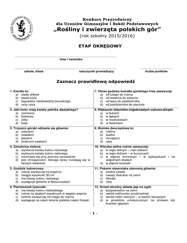 Konkurs Przyrodniczy dla Uczniów Gimnazjów i Szkół Podstawowych „Rośliny i zwierzęta polskich gór” (rok szkolny 2015/2016) ETAP OKRĘGOWY ..................................................................................................................... imię i nazwisko ..................................................................................................................... szkoła, klasa nauczyciel prowadzący ...................................... liczba punktów Zaznacz prawidłową odpowiedź 1. Kierdle to: a) stada wilków b) stada kozic c) legowiska niedźwiedzia brunatnego d) uszy rysia 7. Okres godowy kumaka górskiego trwa zazwyczaj: a) od lutego do marca b) od kwietnia do sierpnia c) od lipca do października d) od października do stycznia 2. Jaki kolor mają kwiaty pełnika alpejskiego? a) czerwony b) fioletowy c) żółty d) biały 8. Większość dzięciołów trójpalczastych wykuwa dziuple: a) w bukach b) w dębach c) w modrzewiach d) w świerkach 3. Trzyszcz górski odżywia się głównie: a) owocami b) owadami c) płazami d) drobnymi ssakami 9. Boimka dwurzędowa to: a) roślina b) ważka c) chrząszcz d) ryba 4. Zanokcica zielona: a) wytwarza kwiaty koloru różowego b) wytwarza kwiaty koloru zielonego c) rozmnaża się przy pomocy zarodników d) jest chrząszczem, którego larwy rozwijają się w liściach świerków 10. Wierzba zielna rośnie zazwyczaj: a) w reglu dolnym – nad rzekami b) w reglu dolnym – w buczynach c) w piętrze turniowym – w wyleżyskach i na wilgotnych skałach d) w piętrze kosówki 5. Goździk lodowcowy: a) rośnie zazwyczaj na pogórzu b) osiąga wysokość 30 cm c) ma kwiaty koloru różowego d) występuje głównie w Bieszczadach 11. Pokarm siwerniaka stanowią głównie: a) wodne owady b) owady zbierane na ziemi c) ślimaki d) ryby 6. Pierwiosnek łyszczak: a) ma kwiaty koloru niebieskiego b) rośnie na skałach zasobnych w węglan wapnia c) kwitnie zazwyczaj od lutego do marca d) występuje na całym terenie polskiej części Karpat 12. Drozd obrożny składa jaja na ogół: a) bezpośrednio na ziemi b) wśród roślinności przybrzeżnej c) wśród roślin zielnych – w lasach liściastych d) w gnieździe umieszczonym na drzewie lub krzewie iglastym -1- Konkurs Przyrodniczy dla Uczniów Gimnazjów i Szkół Podstawowych „Rośliny i zwierzęta polskich gór” (rok szkolny 2015/2016) ETAP OKRĘGOWY 13. Ile igieł występuje u kosodrzewiny na krótkopędach? a) 2 b) 3 c) 5 d) 7 19. Szyszki świerka pospolitego mają długość: a) 2-4 cm b) 5-8 cm c) 10-15 cm d) 16-20 cm 14. Głowacz pręgopłetwy osiąga maksymalnie: a) do ok. 5 cm długości b) do ok. 15 cm. długości c) do ok. 50 cm długości d) do ok. 1 m długości 20. Waż Eskulapa występuje w Polsce: a) w Tatrach b) w Górach Stołowych c) w Pieninach d) w Bieszczadach 15. Kwiaty naparstnicy purpurowej tworzą: a) baldachy b) grona jednostronne c) grona dwustronne d) koszyczki 21. Śnieżyczka przebiśnieg rośnie zazwyczaj: a) nad potokami górskimi b) w lasach liściastych c) w lasach iglastych d) na skałach – w piętrze turni 16. Szykoń metaliczny to: a) muchówka b) chrząszcz c) ważka d) motyl 22. Larwy miedziopiersi górskiej żyją: a) w glebie b) w wodzie c) pod korą drzew d) w liściach drzew 17. Dojrzałe owoce liczydła górskiego mają kolor: a) biały b) czarny c) zielony d) czerwony 23. Szarotka alpejska kwitnie na ogół: a) od lutego do kwietnia b) od maja do czerwca c) od lipca do sierpnia d) od września do października 18. Które z wymienionych zdań jest prawdziwe? a) świstaki zazwyczaj nie odżywiają się w czasie snu zimowego b) świstaki zapadają w sen zimowy zwykle pod koniec listopada c) świstaki należą do rodziny chomikowatych d) świstaki rodzą swoje młode zimą 24. Ryś jest symbolem: a) Wielkopolskiego Parku Narodowego b) Karkonoskiego Parku Narodowego c) Bieszczadzkiego Parku Narodowego d) Świętokrzyskiego Parku Narodowego -2-
