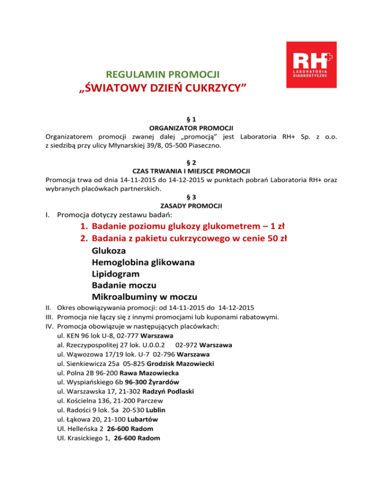 REGULAMIN PROMOCJI „ŚWIATOWY DZIEŃ CUKRZYCY” §1 ORGANIZATOR PROMOCJI Organizatorem promocji zwanej dalej „promocją” jest Laboratoria RH+ Sp. z o.o. z siedzibą przy ulicy Młynarskiej 39/8, 05-500 Piaseczno. §2 CZAS TRWANIA I MIEJSCE PROMOCJI Promocja trwa od dnia 14-11-2015 do 14-12-2015 w punktach pobrań Laboratoria RH+ oraz wybranych placówkach partnerskich. §3 ZASADY PROMOCJI I. Promocja dotyczy zestawu badań: 1. Badanie poziomu glukozy glukometrem – 1 zł 2. Badania z pakietu cukrzycowego w cenie 50 zł Glukoza Hemoglobina glikowana Lipidogram Badanie moczu Mikroalbuminy w moczu II. Okres obowiązywania promocji: od 14-11-2015 do 14-12-2015 III. Promocja nie łączy się z innymi promocjami lub kuponami rabatowymi. IV. Promocja obowiązuje w następujących placówkach: ul. KEN 96 lok U-8, 02-777 Warszawa al. Rzeczypospolitej 27 lok. U.0.0.2 02-972 Warszawa ul. Wąwozowa 17/19 lok. U-7 02-796 Warszawa ul. Sienkiewicza 25a 05-825 Grodzisk Mazowiecki ul. Polna 2B 96-200 Rawa Mazowiecka ul. Wyspiańskiego 6b 96-300 Żyrardów ul. Warszawska 17, 21-302 Radzyń Podlaski ul. Kościelna 136, 21-200 Parczew ul. Radości 9 lok. 5a 20-530 Lublin ul. Łąkowa 20, 21-100 Lubartów Ul. Helleńska 2 26-600 Radom Ul. Krasickiego 1, 26-600 Radom §4 UCZESTNICTWO W PROMOCJI Warunkiem wzięcia udziału w promocji jest wykonanie badań objętych promocją w określonym w regulaminie czasie obowiązywania. §5 POSTANOWIENIA KOŃCOWE 1. Udział Uczestnika w promocji oznacza jego akceptację zasad promocji zawartych w niniejszym Regulaminie. 2. Regulamin promocji dostępny jest we wskazanych punktach pobrań Laboratoria RH+ Sp. z o.o. oraz na stronie internetowej Organizatora www.rhpluslab.pl. 3. Organizator zastrzega sobie prawo dokonywania zmian w niniejszym Regulaminie. 4. Wszelkie reklamacje powinny być kierowane do Organizatora w ciągu 7 dni od wystąpienia powodu reklamacji na adres mailowy [email protected].