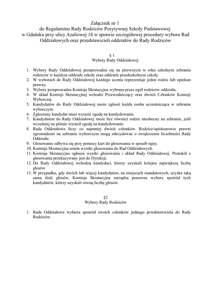 Załącznik nr 1 do Regulaminu Rady Rodziców Pozytywnej Szkoły Podstawowej w Gdańsku przy ulicy Azaliowej 18 w sprawie szczegółowej procedury wyboru Rad Oddziałowych oraz przedstawicieli oddziałów do Rady Rodziców §1 Wybory Rady Oddziałowej 1. Wybory Rady Oddziałowej przeprowadza się na pierwszym w roku szkolnym zebraniu rodziców w każdym oddziale szkoły oraz oddziale przedszkolnym szkoły. 2. W wyborach do Rady Oddziałowej każdego ucznia reprezentuje jeden rodzic lub opiekun prawny. 3. Wybory przeprowadza Komisja Skrutacyjna wybrana przez ogół rodziców oddziału. 4. W skład Komisji Skrutacyjnej wchodzi Przewodniczący oraz dwóch Członków Komisji Wyborczej. 5. Kandydatów do Rady Oddziałowej może zgłosić każda osoba uczestnicząca w zebraniu wyborczym. 6. Zgłoszony kandydat musi wyrazić zgodę na kandydowanie. 7. Kandydatem do Rady Oddziałowej może być również rodzic nieobecny na zebraniu, jeśli wcześniej na piśmie wyraził zgodę na kandydowanie. 8. Rada Oddziałowa liczy co najmniej dwóch członków. Rodzice/opiekunowie prawni zgromadzeni na zebraniu wyborczym mogą zdecydować o zwiększeniu liczebności Rady Oddziału. 9. Głosowanie odbywa się przy pomocy kart do głosowania w sposób tajny. 10. Komisja Skrutacyjna ustala wyniki głosowania do Rad Oddziałowych. 11. Komisja Skrutacyjna ogłasza wyniki głosowania i skład Rady Oddziałowej. Protokół z głosowania przekazywany jest do Dyrekcji. 12. Do Rady Oddziałowej wchodzą kandydaci, którzy uzyskali kolejno największą liczbę głosów. 13. W przypadku, gdy dwóch lub więcej kandydatów, na miejscach mandatowych, uzyska taką samą ilość głosów, Komisja Skrutacyjna zarządza ponowne wybory spośród tych kandydatów, którzy uzyskali równą liczbę głosów. §2 Wybory Rady Rodziców 1. Rada Oddziałowa wybiera spośród swoich członków jednego przedstawiciela do Rady Rodziców.