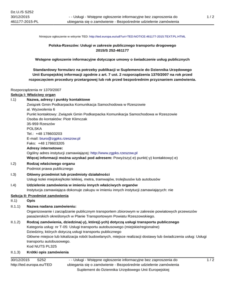 Dz.U./S S252 30/12/2015 461177-2015-PL - - Usługi - Wstępne ogłoszenie informacyjne bez zaproszenia do ubiegania się o zamówienie - Bezpośrednie udzielenie zamówienia 1/2 Niniejsze ogłoszenie w witrynie TED: http://ted.europa.eu/udl?uri=TED:NOTICE:461177-2015:TEXT:PL:HTML Polska-Rzeszów: Usługi w zakresie publicznego transportu drogowego 2015/S 252-461177 Wstępne ogłoszenie informacyjne dotyczące umowy o świadczenie usług publicznych Standardowy formularz na potrzeby publikacji w Suplemencie do Dziennika Urzędowego Unii Europejskiej informacji zgodnie z art. 7 ust. 2 rozporządzenia 1370/2007 na rok przed rozpoczęciem procedury przetargowej lub rok przed bezpośrednim przyznaniem zamówienia. Rozporządzenia nr 1370/2007 Sekcja I: Właściwy organ I.1) Nazwa, adresy i punkty kontaktowe Związek Gmin Podkarpacka Komunikacja Samochodowa w Rzeszowie al. Wyzwolenia 6 Punkt kontaktowy: Związek Gmin Podkarpacka Komunikacja Samochodowa w Rzeszowie Osoba do kontaktów: Piotr Klimczak 35-959 Rzeszów POLSKA Tel.: +48 178603203 E-mail: [email protected] Faks: +48 178603205 Adresy internetowe: Ogólny adres instytucji zamawiającej: http://www.zgpks.rzeszow.pl Więcej informacji można uzyskać pod adresem: Powyższy(-e) punkt(-y) kontaktowy(-e) I.2) Rodzaj właściwego organu Podmiot prawa publicznego I.3) Główny przedmiot lub przedmioty działalności Usługi kolei miejskiej/kolei lekkiej, metra, tramwajów, trolejbusów lub autobusów I.4) Udzielenie zamówienia w imieniu innych właściwych organów Instytucja zamawiająca dokonuje zakupu w imieniu innych instytucji zamawiających: nie Sekcja II: Przedmiot zamówienia II.1) Opis II.1.1) Nazwa nadana zamówieniu: Organizowanie i zarządzanie publicznym transportem zbiorowym w zakresie powiatowych przewozów pasażerskich określonych w Planie Transportowym Powiatu Rzeszowskiego. II.1.2) Rodzaj zamówienia, dziedzina(-y), której(-ych) dotyczą usługi transportu publicznego Kategoria usług: nr T-05: Usługi transportu autobusowego (miejskie/regionalne) Dziedziny, których dotyczą usługi transportu publicznego Główne miejsce lub lokalizacja robót budowlanych, miejsce realizacji dostawy lub świadczenia usług: Usługi transportu autobusowego. Kod NUTS PL325 II.1.3) Krótki opis zamówienia 30/12/2015 S252 http://ted.europa.eu/TED - - Usługi - Wstępne ogłoszenie informacyjne bez zaproszenia do ubiegania się o zamówienie - Bezpośrednie udzielenie zamówienia Suplement do Dziennika Urzędowego Unii Europejskiej 1/2 Dz.U./S S252 30/12/2015 461177-2015-PL - - Usługi - Wstępne ogłoszenie informacyjne bez zaproszenia do ubiegania się o zamówienie - Bezpośrednie udzielenie zamówienia 2/2 Bezpośrednie zawarcie umowy na 10 lat na podstawie Art. 22, ust. 1, pkt 2 ustawy z 16.12.2010 o publicznym transporcie zbiorowym (Dz.U. z 2015.1440 ze zm.) z podmiotem wewnętrznym tj. z Przedsiębiorstwem Komunikacji Samochodowej w Rzeszowie Spółka Akcyjna, w rozumieniu rozporządzenia (WE) Nr 1370/2007 Parlamentu Europejskiego i Rady z 23.10.2007 dotyczącego usług publicznych w zakresie kolejowego i drogowego transportu pasażerskiego oraz uchylającego rozporządzenia Rady (EWG) nr 1191/69 i (EWG) nr 1107/70, powołanym do świadczenia usług w zakresie publicznego transportu zbiorowego. Transport drogowy – przewozy autobusowe w publicznym transporcie zbiorowym na sieci komunikacyjnej określonego w Planie Transportowym Powiatu Rzeszowskiego, dla których Powiat Rzeszowski jest organizatorem publicznego transportu zbiorowego. II.1.4) Wspólny Słownik Zamówień (CPV) 60112000 II.1.5) Informacje na temat podwykonawstwa Przewidywane jest zlecenie podwykonawstwa: nie II.2) Ilość i/lub wartość usług: II.3) Planowana data rozpoczęcia i czas trwania zamówienia lub termin realizacji Rozpoczęcie: 1.1.2017 Okres w miesiącach: 120 (od udzielenia zamówienia) II.4) Krótki opis rodzaju i zakresu robót budowlanych Sekcja IV: Procedura IV.1) Rodzaj procedury podmiotowi wewnętrznemu (art. 5 ust. 2 rozporządzenia 1370/2007) IV.2) Kryteria udzielenia zamówienia IV.2.1) Kryteria udzielenia zamówienia IV.2.2) Informacje na temat aukcji elektronicznej IV.3) Informacje administracyjne IV.3.1) Numer referencyjny: IV.3.2) Warunki uzyskania specyfikacji i dokumentów dodatkowych IV.3.3) Termin składania ofert lub wniosków o dopuszczenie do udziału w postępowaniu IV.3.4) Języki, w których można sporządzać oferty lub wnioski o dopuszczenie do udziału w postępowaniu IV.3.5) Minimalny okres, w którym oferent będzie związany ofertą IV.3.6) Warunki otwarcia ofert Sekcja VI: Informacje uzupełniające VI.1) Informacje dodatkowe: VI.2) Procedury odwoławcze VI.2.1) Organ odpowiedzialny za procedury odwoławcze VI.2.2) Składanie odwołań VI.2.3) Źródło, gdzie można uzyskać informacje na temat składania odwołań VI.3) Ogłoszenie o udzieleniu zamówienia: VI.4) Data wysłania niniejszego ogłoszenia: 28.12.2015 30/12/2015 S252 http://ted.europa.eu/TED - - Usługi - Wstępne ogłoszenie informacyjne bez zaproszenia do ubiegania się o zamówienie - Bezpośrednie udzielenie zamówienia Suplement do Dziennika Urzędowego Unii Europejskiej 2/2