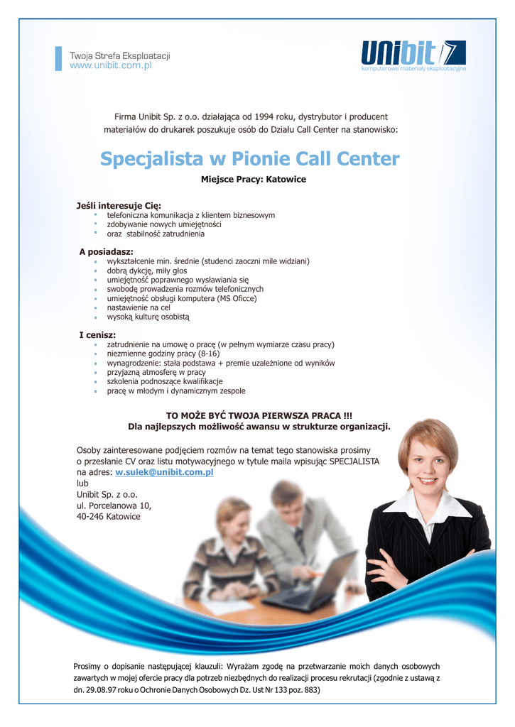 komputerowe materia³y eksploatacyjne Firma Unibit Sp. z o.o. dzia³aj¹ca od 1994 roku, dystrybutor i producent materia³ów do drukarek poszukuje osób do Dzia³u Call Center na stanowisko: Specjalista w Pionie Call Center Miejsce Pracy: Katowice Jeœli interesuje Ciê: telefoniczna komunikacja z klientem biznesowym zdobywanie nowych umiejêtnoœci oraz stabilnoœæ zatrudnienia A posiadasz: wykszta³cenie min. œrednie (studenci zaoczni mile widziani) dobr¹ dykcjê, mi³y g³os umiejêtnoœæ poprawnego wys³awiania siê swobodê prowadzenia rozmów telefonicznych umiejêtnoœæ obs³ugi komputera (MS Oficce) nastawienie na cel wysok¹ kulturê osobist¹ I cenisz: zatrudnienie na umowê o pracê (w pe³nym wymiarze czasu pracy) niezmienne godziny pracy (8-16) wynagrodzenie: sta³a podstawa + premie uzale¿nione od wyników przyjazn¹ atmosferê w pracy szkolenia podnosz¹ce kwalifikacje pracê w m³odym i dynamicznym zespole TO MO¯E BYÆ TWOJA PIERWSZA PRACA !!! Dla najlepszych mo¿liwoœæ awansu w strukturze organizacji. Osoby zainteresowane podjêciem rozmów na temat tego stanowiska prosimy o przes³anie CV oraz listu motywacyjnego w tytule maila wpisuj¹c SPECJALISTA na adres: [email protected] lub Unibit Sp. z o.o. ul. Porcelanowa 10, 40-246 Katowice Prosimy o dopisanie nastêpuj¹cej klauzuli: Wyra¿am zgodê na przetwarzanie moich danych osobowych zawartych w mojej ofercie pracy dla potrzeb niezbêdnych do realizacji procesu rekrutacji (zgodnie z ustaw¹ z dn. 29.08.97 roku o Ochronie Danych Osobowych Dz. Ust Nr 133 poz. 883)