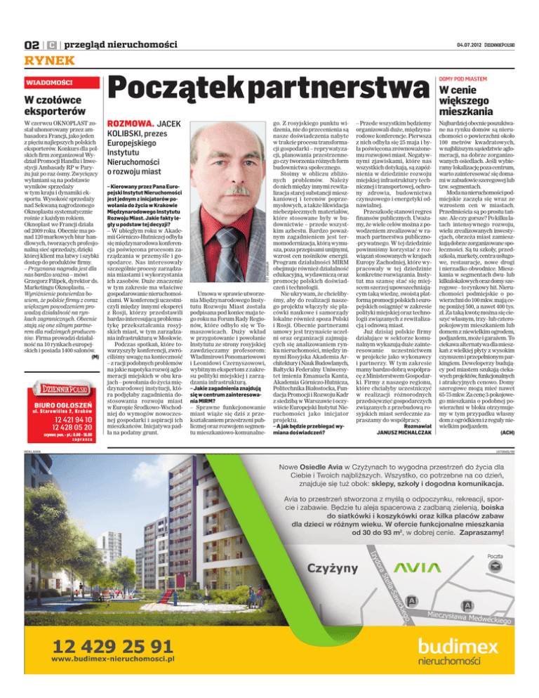 02 C przegląd nieruchomości 04.07.2012 RYNEK W czołówce eksporterów W czerwcu OKNOPLAST został uhonorowany przez ambasadora Francji, jako jeden z pięciu najlepszych polskich eksporterów. Konkurs dla polskich firm zorganizował Wydział Promocji Handlu i Inwestycji Ambasady RP w Paryżu już po raz ósmy. Zwycięzcy wyłaniani są na podstawie wyników sprzedaży w tym kraju i dynamiki eksportu. Wysokość sprzedaży nad Sekwaną nagrodzonego Oknoplastu systematycznie rośnie z każdym rokiem. Oknoplast we Francji działa od 2009 roku. Obecnie ma ponad 120 markowych biur handlowych, tworzących profesjonalną sieć sprzedaży, dzięki której klient ma łatwy i szybki dostęp do produktów firmy. – Przyznana nagroda jest dla nas bardzo ważna – mówi Grzegorz Filipek, dyrektor ds. Marketingu Oknoplastu. – Wyróżnienie potwierdza bowiem, że polskie firmy z coraz większym powodzeniem prowadzą działalność na rynkach zagranicznych. Obecnie stają się one silnym partnerem dla rodzimych producentów. Firma prowadzi działalność na 10 rynkach europejskich i posiada 1400 salonów. (M) BIURO OGŁOSZEŃ ul. Starowiślna 2, Kraków 12 421 94 10 12 428 05 20 czynne: pon. - pt.: 8.00 - 18.00 zaprasza REKLAMA Początekpartnerstwa ROZMOWA. JACEK KOLIBSKI, prezes Europejskiego Instytutu Nieruchomości o rozwoju miast – Kierowany przez Pana Europejski Instytut Nieruchomości jest jednym z inicjatorów powołania do życia w Krakowie Międzynarodowego Instytutu Rozwoju Miast. Jakie fakty legły u podstaw tej decyzji? – W ubiegłym roku w Akademii Górniczo-Hutniczej odbyła się międzynarodowa konferencja poświęcona procesom zarządzania w przemyśle i gospodarce. Nas interesowały szczególnie procesy zarządzania miastami i wykorzystania ich zasobów. Duże znaczenie w tym zakresie ma właściwe gospodarowanie nieruchomościami. W konferencji uczestniczyli między innymi eksperci z Rosji, którzy przedstawili bardzo interesującą problematykę przekształcania rosyjskich miast, w tym zarządzania infrastrukturą w Moskwie. Podczas spotkań, które towarzyszyły konferencji, zwróciliśmy uwagę na konieczność – z racji podobnych problemów na jakie napotyka rozwój aglomeracji miejskich w obu krajach – powołania do życia międzynarodowej instytucji, która podjęłaby zagadnienia dostosowania rozwoju miast w Europie Środkowo-Wschodniej do wymogów nowoczesnej gospodarki i aspiracji ich mieszkańców. Inicjatywa padła na podatny grunt. FOT. ARCHIWUM WIADOMOŚCI Umowa w sprawie utworzenia Międzynarodowego Instytutu Rozwoju Miast została podpisana pod koniec maja tego roku na Forum Rady Regionów, które odbyło się w Tomaszowicach. Duży wkład w przygotowanie i powołanie Instytutu ze strony rosyjskiej zawdzięczamy profesorom: Władimirowi Ponomariowowi i Leonidowi Czernyszowowi, wybitnym ekspertom z zakresu polityki miejskiej i zarządzania infrastrukturą. – Jakie zagadnienia znajdują się w centrum zainteresowania MIRM? – Sprawne funkcjonowanie miast wiąże się dziś z przekształcaniem przestrzeni publicznej oraz rozwojem segmentu mieszkaniowo-komunalne- go. Z rosyjskiego punktu widzenia, nie do przecenienia są nasze doświadczenia nabyte w trakcie procesu transformacji gospodarki – reprywatyzacji, planowania przestrzennego czy tworzenia różnych form budownictwa społecznego. Stoimy w obliczu zbliżonych problemów. Należy do nich między innymi rewitalizacja starej substancji mieszkaniowej i terenów poprzemysłowych, a także likwidacja niebezpiecznych materiałów, które stosowane były w budownictwie – przede wszystkim azbestu. Bardzo poważnym zagadnieniem jest termomodernizacja, którą wymusza, poza przepisami unijnymi, wzrost cen nośników energii. Program działalności MIRM obejmuje również działalność edukacyjną, wydawniczą oraz promocję polskich doświadczeń i technologii. Nie ukrywam, że chcielibyśmy, aby do realizacji naszego projektu włączyły się placówki naukowe i samorządy lokalne również spoza Polski i Rosji. Obecnie partnerami umowy jest trzynaście uczelni oraz organizacji zajmujących się analizowaniem rynku nieruchomości, między innymi Rosyjska Akademia Architektury i Nauk Budowlanych, Bałtycki Federalny Uniwersytet imienia Emanuela Kanta, Akademia Górniczo-Hutnicza, Politechnika Białostocka, Fundacja Promocji i Rozwoju Kadr z siedzibą w Warszawie i oczywiście Europejski Instytut Nieruchomości jako inicjator projektu. – A jak będzie przebiegać wymiana doświadczeń? – Przede wszystkim będziemy organizowali duże, międzynarodowe konferencje. Pierwsza z nich odbyła się 25 maja i była poświęcona zrównoważonemu rozwojowi miast. Negatywnymi zjawiskami, które nas wszystkich dotykają, są zapóźnienia w dziedzinie rozwoju miejskiej infrastruktury technicznej i transportowej, ochrony zdrowia, budownictwa czynszowego i energetyki odnawialnej. Przeszkodę stanowi regres finansów publicznych. Uważamy, że wiele celów można z powodzeniem zrealizować w ramach partnerstwa publiczno-prywatnego. W tej dziedzinie powinniśmy korzystać z rozwiązań stosowanych w krajach Europy Zachodniej, które wypracowały w tej dziedzinie konkretne rozwiązania. Instytut ma szansę stać się miejscem szerzej upowszechniającym taką wiedzę, swoistą platformą promocji polskich i europejskich osiągnięć w zakresie polityki miejskiej oraz technologii związanych z rewitalizacją i odnową miast. Już dzisiaj polskie firmy działające w sektorze komunalnym wykazują duże zainteresowanie uczestnictwem w projekcie jako wykonawcy i partnerzy. W tym zakresie mamy bardzo dobrą współpracę z Ministerstwem Gospodarki. Firmy z naszego regionu, które chciałyby uczestniczyć w realizacji różnorodnych przedsięwzięć gospodarczych związanych z przebudową rosyjskich miast serdecznie zapraszamy do współpracy. Rozmawiał JANUSZ MICHALCZAK DOMY POD MIASTEM W cenie większego mieszkania Najbardzie