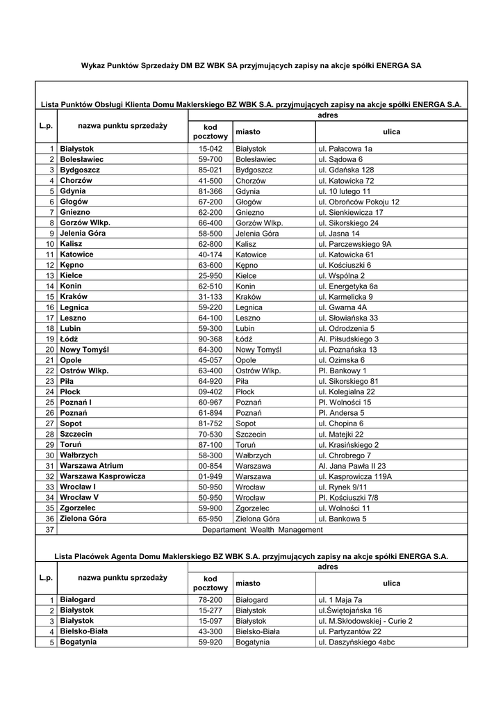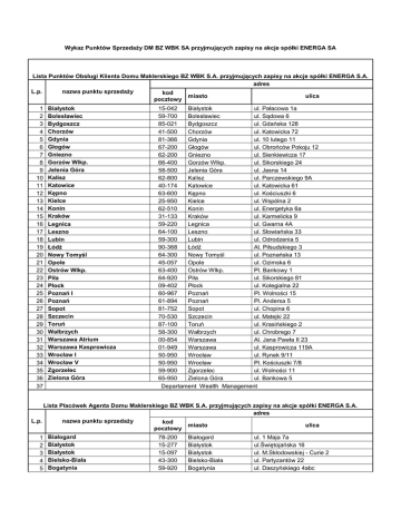Wykaz Punktów Sprzedaży DM BZ WBK SA przyjmujących zapisy na akcje spółki ENERGA SA Lista Punktów Obsługi Klienta Domu Maklerskiego BZ WBK S.A. przyjmujących zapisy na akcje spółki ENERGA S.A. adres L.p. nazwa punktu sprzedaży kod miasto ulica pocztowy 1 2 3 4 5 6 7 8 9 10 11 12 13 14 15 16 17 18 19 20 21 22 23 24 25 26 27 28 29 30 31 32 33 34 35 36 37 Białystok Bolesławiec Bydgoszcz Chorzów Gdynia Głogów Gniezno Gorzów Wlkp. Jelenia Góra Kalisz Katowice Kępno Kielce Konin Kraków Legnica Leszno Lubin Łódź Nowy Tomyśl Opole Ostrów Wlkp. Piła Płock Poznań I Poznań Sopot Szczecin Toruń Wałbrzych Warszawa Atrium Warszawa Kasprowicza Wrocław I Wrocław V Zgorzelec Zielona Góra 15-042 Białystok ul. Pałacowa 1a 59-700 Bolesławiec ul. Sądowa 6 85-021 Bydgoszcz ul. Gdańska 128 41-500 Chorzów ul. Katowicka 72 81-366 Gdynia ul. 10 lutego 11 67-200 Głogów ul. Obrońców Pokoju 12 62-200 Gniezno ul. Sienkiewicza 17 66-400 Gorzów Wlkp. ul. Sikorskiego 24 58-500 Jelenia Góra ul. Jasna 14 62-800 Kalisz ul. Parczewskiego 9A 40-174 Katowice ul. Katowicka 61 63-600 Kępno ul. Kościuszki 6 25-950 Kielce ul. Wspólna 2 62-510 Konin ul. Energetyka 6a 31-133 Kraków ul. Karmelicka 9 59-220 Legnica ul. Gwarna 4A 64-100 Leszno ul. Słowiańska 33 59-300 Lubin ul. Odrodzenia 5 90-368 Łódź Al. Piłsudskiego 3 64-300 Nowy Tomyśl ul. Poznańska 13 45-057 Opole ul. Ozimska 6 63-400 Ostrów Wlkp. Pl. Bankowy 1 64-920 Piła ul. Sikorskiego 81 09-402 Płock ul. Kolegialna 22 60-967 Poznań Pl. Wolności 15 61-894 Poznań Pl. Andersa 5 81-752 Sopot ul. Chopina 6 70-530 Szczecin ul. Matejki 22 87-100 Toruń ul. Krasińskiego 2 58-300 Wałbrzych ul. Chrobrego 7 00-854 Warszawa Al. Jana Pawła II 23 01-949 Warszawa ul. Kasprowicza 119A 50-950 Wrocław ul. Rynek 9/11 50-950 Wrocław Pl. Kościuszki 7/8 59-900 Zgorzelec ul. Wolności 11 65-950 Zielona Góra ul. Bankowa 5 Departament Wealth Management Lista Placówek Agenta Domu Maklerskiego BZ WBK S.A. przyjmujących zapisy na akcje spółki ENERGA S.A. adres L.p. nazwa punktu sprzedaży kod miasto ulica pocztowy 1 2 3 4 5 Białogard Białystok Białystok Bielsko-Biała Bogatynia 78-200 15-277 15-097 43-300 59-920 Białogard Białystok Białystok Bielsko-Biała Bogatynia ul. 1 Maja 7a ul.Świętojańska 16 ul. M.Skłodowskiej - Curie 2 ul. Partyzantów 22 ul. Daszyńskiego 4abc 6 7 8 9 10 11 12 13 14 15 16 17 18 19 20 21 22 23 24 25 26 27 28 29 30 31 32 33 34 35 36 37 38 39 40 41 42 43 44 45 46 47 48 49 50 51 52 53 54 55 56 57 58 59 60 61 Bolesławiec Brzeg Brzeg Dolny Bydgoszcz Bytom Chełm Chodzież Chojnów Ciechanów Częstochowa Częstochowa Dzierżoniów Elbląg Gdańsk Gdańsk Gdańsk Gdańsk Gdańsk Gdynia Gdynia Głogów Głogów Głuszyca Gorzów Wielkopolski Gorzów Wielkopolski Gorzów Wielkopolski Gostyń Grodzisk Wielkopolski Grudziądz Gryfice Gubin Inowrocław Jarocin Jaworzno Jelenia Góra Jelenia Góra Kalisz Kalisz Kalisz Kamienna Góra Katowice Kępno Kęty Kielce Kłodzko Koło Kołobrzeg Kostrzyn n/Odrą Koszalin Kościan Kraków Kraków Kraków Krosno Odrzańskie Krotoszyn Kutno 59-700 49-300 56-120 85-231 41-902 22-100 64-800 59-225 06-400 42-217 42-202 58-200 82-300 80-958 80-765 80-239 80-316 80-890 81-363 81-366 67-200 67-200 58-340 66-414 66-400 66-400 63-800 62-065 86-300 72-300 66-620 88-100 63-200 43-600 58-500 58-500 62-800 62-800 62-800 58-400 40-036 63-600 32-650 25-518 57-300 62-600 78-100 66-470 75-800 64-000 31-133 30-415 30-611 66-600 63-700 99-300 Bolesławiec Brzeg Brzeg Dolny Bydgoszcz Bytom Chełm Chodzież Chojnów Ciechanów Częstochowa Częstochowa Dzierżoniów Elbląg Gdańsk Gdańsk Gdańsk Gdańsk Gdańsk Gdynia Gdynia Głogów Głogów Głuszyca Gorzów Wielkopolski Gorzów Wielkopolski Gorzów Wielkopolski Gostyń Grodzisk Wielkopolski Grudziądz Gryfice Gubin Inowrocław Jarocin Jaworzno Jelenia Góra Jelenia Góra Kalisz Kalisz Kalisz Kamienna Góra Katowice Kępno Kęty Kielce Kłodzko Koło Kołobrzeg Kostrzyn n/Odrą Koszalin Kościan Kraków Kraków Kraków Krosno Odrzańskie Krotoszyn Kutno ul. Bankowa 12 ul. Powstańców Śląskich 6 ul. 1 Maja 10a ul. Królowej Jadwigi 18 ul. Dworcowa 4 ul. Lubelska 73 ul. Ks.Prymasa St. Wyszyńskiego 4 ul. Dąbrowskiego 12 ul. Pułtuska 4/6 al.Wolności 8 al. Najświętszej Marii Panny 37 ul. Mickiewicza 4 ul. Pułkownika Dąbka 8-12 ul. 3 Maja 3 ul. Długie Ogrody 10 ul.Miszewskiego 12/14 ul.Kaprów 19c ul.Heweliusza 21 ul. Starowiejska 25 ul. 10 Lutego 11 ul. Słowiańska 12 ul. Obrońców Pokoju 12 ul. Grunwaldzka 10 ul. Kombatantów 2 ul. Pionierów 8 ul.Gen.Wł Sikorskiego 24 ul. Bojanowskiego 22 ul. 3 Maja 8 al. 23 Stycznia 42 ul.Niepodległości 42 ul. Piastowska 4 ul. Szarych Szeregów 23a ul. Kilińskiego 2a Grunwaldzka 39 pl. Niepodległości 4 ul. Jasna 14 ul. Parczewskiego 9a ul. Podmiejska 32 ul. Śródmiejska 25 ul. Parkowa 1 ul. Wita Stwosza 2 ul. Kościuszki 6 ul.Kościuszki 12 ul.Warszawska 27 ul. Kościuszki 7 ul. Zielona 2 ul. Gierczak 44/45 ul. Sikorskiego 10 ul. 1 Maja 12 al. Kościuszki 2 ul. Karmelicka 9 ul. Wadowicka 6 ul. Halszki 1a ul. Poznańska 21 ul. Sienkiewicza 12a ul. Grunwaldzka 5 62 63 64 65 66 67 68 69 70 71 72 73 74 75 76 77 78 79 80 81 82 83 84 85 86 87 88 89 90 91 92 93 94 95 96 97 98 99 100 101 102 103 104 105 106 107 108 109 110 111 112 113 114 115 116 117 Legionowo Legnica Lębork Lubań Lublin Luboń Lubsko Łódź Mielec Międzyrzecz Nowa Ruda Nowa Sól Nowy Tomyśl Oborniki Śląskie Oleśnica Olsztyn Oława Opole Ostrzeszów Polkowice Poznań Poznań Poznań Poznań Poznań Poznań Poznań Poznań Prudnik Pruszcz Gdański Przemyśl Puławy Radom Rawicz Rogoźno Rzeszów Sanok Słubice Słupca Słupsk Sosnowiec Stalowa Wola Stargard Szczeciński Strzegom Strzelce Opolskie Strzelin Sulechów Sulęcin Suwałki Szamotuły Szczecin Szczecin Szczecinek Szklarska Poręba Śrem Środa Śląska 05-120 59-220 84-300 59-800 20-002 62-030 68-300 90-114 39-300 66-300 57-400 67-100 64-300 55-120 56-400 1