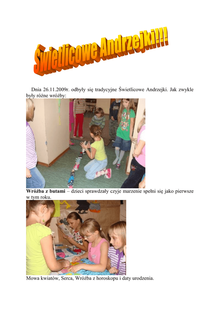 Dnia 26.11.2009r. odbyły się tradycyjne Świetlicowe Andrzejki. Jak zwykle były różne wróżby: Wróżba z butami – dzieci sprawdzały czyje marzenie spełni się jako pierwsze w tym roku. Mowa kwiatów, Serca, Wróżba z horoskopu i daty urodzenia. Odbyły się także liczne konkursy taneczne: - Taniec na gazecie - Taniec z balonem. - Wybieraliśmy najlepiej bawiące się pary. Dzieciaki nie mogły się doczekać na poczęstunek, który stanowiły pieczone na świetlicy pierniczki. Znikały one w błyskawicznym tempie z talerzy, co znaczy, że wszystkim smakowały. Opracowała: Magdalena Płużek