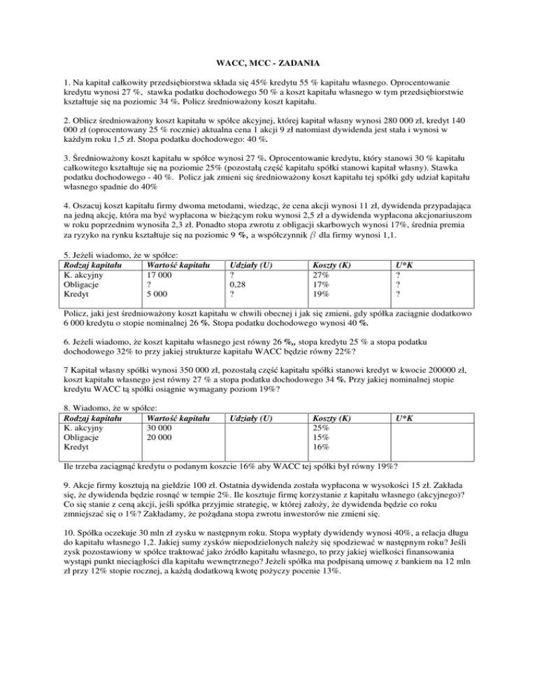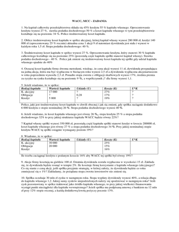 WACC, MCC - ZADANIA 1. Na kapitał całkowity przedsiębiorstwa składa się 45% kredytu 55 % kapitału własnego. Oprocentowanie kredytu wynosi 27 %, stawka podatku dochodowego 50 % a koszt kapitału własnego w tym przedsiębiorstwie kształtuje się na poziomic 34 %. Policz średnioważony koszt kapitału. 2. Oblicz średnioważony koszt kapitału w spółce akcyjnej, której kapitał własny wynosi 280 000 zł, kredyt 140 000 zł (oprocentowany 25 % rocznie) aktualna cena 1 akcji 9 zł natomiast dywidenda jest stała i wynosi w każdym roku 1,5 zł. Stopa podatku dochodowego: 40 %. 3. Średnioważony koszt kapitału w spółce wynosi 27 %. Oprocentowanie kredytu, który stanowi 30 % kapitału całkowitego kształtuje się na poziomie 25% (pozostałą część kapitału spółki stanowi kapitał własny). Stawka podatku dochodowego - 40 %. Policz jak zmieni się średnioważony koszt kapitału tej spółki gdy udział kapitału własnego spadnie do 40% 4. Oszacuj koszt kapitału firmy dwoma metodami, wiedząc, że cena akcji wynosi 11 zł, dywidenda przypadająca na jedną akcję, która ma być wypłacona w bieżącym roku wynosi 2,5 zł a dywidenda wypłacona akcjonariuszom w roku poprzednim wynosiła 2,3 zł. Ponadto stopa zwrotu z obligacji skarbowych wynosi 17%, średnia premia za ryzyko na rynku kształtuje się na poziomic 9 %, a współczynnik b dla firmy wynosi 1,1. 5. Jeżeli wiadomo, że w spółce: Rodzaj kapitału Wartość kapitału K. akcyjny 17 000 Obligacje ? Kredyt 5 000 Udziały (U) ? 0,28 ? Koszty (K) 27% 17% 19% U*K ? ? ? Policz, jaki jest średnioważony koszt kapitału w chwili obecnej i jak się zmieni, gdy spółka zaciągnie dodatkowo 6 000 kredytu o stopie nominalnej 26 %. Stopa podatku dochodowego wynosi 40 %. 6. Jeżeli wiadomo, że koszt kapitału własnego jest równy 26 %„ stopa kredytu 25 % a stopa podatku dochodowego 32% to przy jakiej strukturze kapitału WACC będzie równy 22%? 7 Kapitał własny spółki wynosi 350 000 zł, pozostałą część kapitału spółki stanowi kredyt w kwocie 200000 zł, koszt kapitału własnego jest równy 27 % a stopa podatku dochodowego 34 %. Przy jakiej nominalnej stopie kredytu WACC tą spółki osiągnie wymagany poziom 19%? 8. Wiadomo, że w spółce: Rodzaj kapitału Wartość kapitału K. akcyjny 30 000 Obligacje 20 000 Kredyt Udziały (U) Koszty (K) 25% 15% 16% U*K Ile trzeba zaciągnąć kredytu o podanym koszcie 16% aby WACC tej spółki był równy 19%? 9. Akcje firmy kosztują na giełdzie 100 zł. Ostatnia dywidenda została wypłacona w wysokości 15 zł. Zakłada się, że dywidenda będzie rosnąć w tempie 2%. Ile kosztuje firmę korzystanie z kapitału własnego (akcyjnego)? Co się stanie z ceną akcji, jeśli spółka przyjmie strategię, w której założy, że dywidenda będzie co roku zmniejszać się o 1%? Zakładamy, że pożądana stopa zwrotu inwestorów nie zmieni się. 10. Spółka oczekuje 30 mln zł zysku w następnym roku. Stopa wypłaty dywidendy wynosi 40%, a relacja długu do kapitału własnego 1,2. Jakiej sumy zysków niepodzielonych należy się spodziewać w następnym roku? Jeśli zysk pozostawiony w spółce traktować jako źródło kapitału własnego, to przy jakiej wielkości finansowania wystąpi punkt nieciągłości dla kapitału wewnętrznego? Jeżeli spółka ma podpisaną umowę z bankiem na 12 mln zł przy 12% stopie rocznej, a każdą dodatkową kwotę pożyczy pocenie 13%. 11. Docelowa struktura kapitału firmy jest następująca: 60% kapitał własny, 30% kapitał obcy i 10% kapitał pochodzący z akcji uprzywilejowanych. Stopa podatku dochodowego w tej firmie 40%. Zyski zatrzymane wynoszą 30 000 PLN. Firma zaciągnęła kredyt 18 000 PLN oprocentowany 20% rocznic. Zaciągnięcie wyższego kredytu wiązałoby się ze wzrostem oprocentowania o 5 punktów procentowych. Akcje uprzywilejowane są sprzedawane na rynku po 62,5 PLN, dywidenda roczna dla posiadaczy akcji up. wynosi 10 PLN. Akcje zwykle są sprzedawane po 35 PLN, ostatnio wypłacona dywidenda wyniosła 5 PLN, a tempo jej wzrostu ma wynosić 5% rocznie, koszty związane z emisją nowych akcji wynoszą 5 PLN. Jaki kapitał firma może zgromadzić bez konieczności emisji nowych akcji i bez zaciągania nowego kredytu? Narysuj wykres ukazujący kształtowanie się WACC tej firmy i zaznacz punkty nieciągłości. 12. Firma X, której docelowa struktura kapitału to: 5% akcje up. 55% kapitał własny, 40% kapitał obcy, musi wyznaczyć krańcowy koszt kapitału. Koszt kapitału z akcji up. wynosi 25%, koszt długu 15%,koszt zysków zatrzymanych 30%, koszt nowego kapitału własnego 32%. a) jaki jest WACC tej firmy? b) jeżeli zyski zatrzymane wynoszą 40 000 PLN to ile kapitału po niższym WACC firma może pozyskać? c) jak na WACC firmy wpłynie fakt, że koszt kredytu powyżej 60 000 PLN wzrośnie do 18%? d) narysuj wykres ukazujący kształtowanie się WACC tej firmy i zaznacz punkty nieciągłości. 13 Menedżer finansowy firmy X opracowuje budżet kapitałowy na przyszły rok. Optymalna struktura kapitału firmy to: 60% długi i 40% kapitał własny. Firma może zaciągnąć kredyt, którego oprocentowanie do wysokości 300 000 PLN wynosi 10% a powyżej tej kwoty 15%. Akcje zwykłe są sprzedawane po 40 PLN, ostatnia wypłacona dywidenda wyniosła 4 PLN, a stała roczna stopa wzrostu dywidendy wynosi 5%. Firma może sprzedawać nowe akcje po tej samej cenie, musi jednak ponieść koszty emisji w wysokości 20% aktualnej ceny rynkowej.. Firma dysponuje zyskami zatrzymanymi w wysokości 400 000 PLN. Zidentyfikowano pięć potencjalnych projektów inwestycyjnych: Projekt Nakłady inwestycyjne Okres życia (lat) IRR (%) A 400 000 5 16 B 400 000 10 14 C 300 000 5 13 D 400 000 5 12 E 300 000 4 10 Projekty A i B są wzajemnie wykluczające się. T=40%. Dokonaj wyboru projektów inwestycyjnych kierując się kształtowaniem WACC i MCC. 14. Firma rozważa podjęcie czterech projektów inwestycyjnych A, B, C, D.