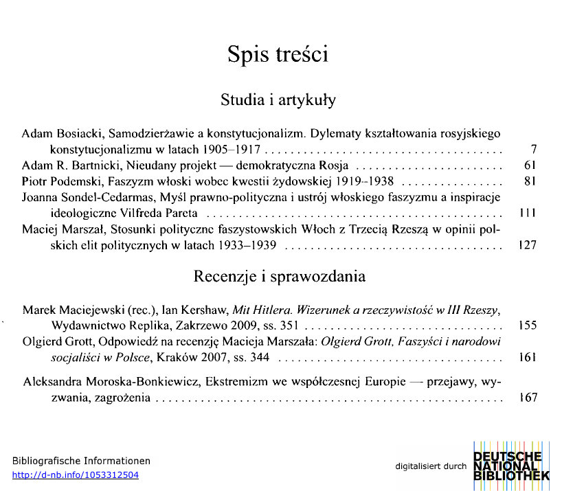 Spis treści Studia i artykuły Adam Bosiacki, Samodzierżawie a konstytucjonalizm. Dylematy kształtowania rosyjskiego konstytucjonalizmu w latach 1905-1917 Adam R. Bartnicki, Nieudany projekt — demokratyczna Rosja Piotr Podemski, Faszyzm włoski wobec kwestii żydowskiej 1919-1938 Joanna Sondel-Cedarmas, Myśl prawno-polityczna i ustrój włoskiego faszyzmu a inspiracje ideologiczne Vilfreda Pareta 7 61 81 111 Maciej Marszał, Stosunki polityczne faszystowskich Włoch z Trzecią Rzeszą w opinii pol skich elit politycznych w latach 1933-1939 127 Recenzje i sprawozdania Marek Maciejewski (rec.), łan Kershaw, Mit Hitlera. Wizerunek a rzeczywistość w III Rzeszy, Wydawnictwo Replika, Zakrzewo 2009, ss. 351 Olgierd Grott, Odpowiedź na recenzję Macieja Marszała: Olgierd Grott, Faszyści i narodowi socjaliści w Polsce, Kraków 2007, ss. 344 Aleksandra Moroska-Bonkiewicz, Ekstremizm we współczesnej Europie — przejawy, wy zwania, zagrożenia http://d-nb.info/1053312504 155 161 167 Contents Articles Adam Bosiacki, Autocracy versus constitutionalism. The dilemmas of shaping the Russian constitutionalism during the years 1905-1917 Adam R. Bartnicki, Failed project — a democratic Russia Piotr Podemski, Italian Fascism on the Jewish question during the 1919-1938 period Joanna Sondel-Cedarmas, Political-and-legal thought and the political system of Italian Fas cism on the background of ideological inspirations by Vilfredo Pareto Maciej Marszał, The relations between the Fascist Italy and the Third Reich in the views of Polish political elites during the 1933-1939 period 7 61 81 111 127 Reviews Marek Maciejewski (rev.), lan Kershaw, Mit Hitlera. Wizerunek a rzeczywistość w III Rzeszy [The „Hitler Myth": Image and Reality in the Third Reich], Wydawnictwo Replika, Zakrzewo 2009, pp. 351 Olgierd Grott, Odpowiedź na recenzję Macieja Marszała: Olgierd Grott, Faszyści i narodowi socjaliści w Polsce [Response to Maciej Marszał's review: Olgierd Grott, Fascists and National Socialists in Poland], Kraków 2007, pp. 344 155 161 Aleksandra Moroska-Bonkiewicz, Ekstremizm we współczesnej Europie — przejawy, wy zwania, zagrożenia [Extremism in Modern Europę — Symptoms, Challenges, Dangers] 167