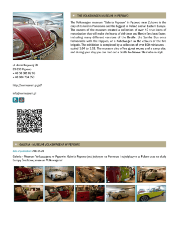 THE VOLKSWAGEN MUSEUM IN PĘPOWO The Volkswagen museum “Galeria Pępowo” in Pępowo near Żukowo is the only of its kind in Pomerania and the biggest in Poland and all Eastern Europe. The owners of the museum created a collection of over 40 true icons of motorization that will make the hearts of old-timer and Beetle fans beat faster, including many different versions of the Beetle, the Samba Bus once fashionable with the Hippies, or a Kübelwagen in the colours of the fire brigade. The exhibition is completed by a collection of over 600 miniatures – scaled 1:64 to 1:18. The museum also offers guest rooms and a camp site, and during your stay you can rent out a Beetle to discover Kashubia in style. ul. Armii Krajowej 50 83-330 Pępowo + 48 58 681 82 05 + 48 604 704 050 http://vwmuseum.pl/pl/ [email protected] GALERIA - MUZEUM VOLKSWAGENA W PĘPOWIE date of publication: 2013-05-28 Galeria - Muzeum Volkswagena w Pępowie. Galeria Pępowo jest jedynym na Pomorzu i największym w Polsce oraz na skalę Europy Środkowej muzeum Volkswagena!
