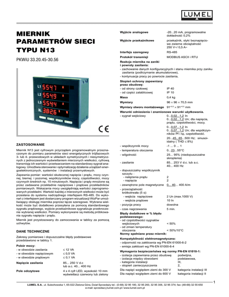 MIERNIK PARAMETRÓW SIECI TYPU N13 PKWiU 33.20.45-30.56 Wyjcie analogowe -20...20 mA, programowalne dok³adnoæ 0,2% Wyjcie przekanikowe przekanik, styki beznapiêciowe zwierne obci¹¿alnoæ 250 V~/ 0,5 A~ Interfejs szeregowy RS-485 Protokó³ transmisji MODBUS ASCII i RTU Reakcja miernika na zaniki i powroty zasilania: - zachowanie danych konfiguracyjnych i stanu miernika przy zaniku zasilania (podtrzymanie akumulatorowe), - kontynuacja pracy po powrocie zasilania, Stopieñ ochrony zapewniany przez obudowê: - od strony czo³owej - od czêci zatablicowej IP 40 IP 10 Masa 0,4 kg Wymiary 96 ´ 96 ´ 70,5 mm Wymiary otworu monta¿owego 91+0,5 ´ 91+0,5 mm Warunki odniesienia i znamionowe warunki u¿ytkowania. - sygna³ wejciowy 0...0,02...1,2 In 0...0,02...1,2 Un; dla napiêcia, pr¹du, czêstotliwoci, mocy. 0...0,07...1,2 In 0...0,07...1,2 Un; dla wspó³czynników Pf i tj, czêstotliwoæ. 20...45...65...500 Hz; sinusoiidalny ( THD £ 8%) ZASTOSOWANIE - wspó³czynnik mocy Miernik N13 jest cyfrowym przyrz¹dem programowalnym przeznaczonym do pomiaru parametrów sieci energetycznych trójfazowych 3- lub 4- przewodowych w uk³adach symetrycznych i niesymetrycznych z jednoczesnym wywietlaniem mierzonych wielkoci, cyfrow¹ transmisjê ich wartoci i przetwarzaniem na standardowy sygna³ analogowy. Umo¿liwia sterowanie i optymalizacjê dzia³ania urz¹dzeñ energoelektronicznych, systemów i instalacji przemys³owych. Zapewnia pomiar: wartoci skutecznej napiêcia i pr¹du, mocy czynnej, biernej i pozornej, wspó³czynników mocy, czêstotliwoci, mocy czynnych rednich np. 15 minutowych. Napiêcia i pr¹dy mno¿one s¹ przez zadawane przek³adnie napiêciowe i pr¹dowe przek³adników pomiarowych. Wskazania mocy uwzglêdniaj¹ wartoci zaprogramowanych przek³adni. Wartoæ ka¿dej z mierzonych wielkoci mo¿e byæ przes³ana do systemu nadrzêdnego interfejsem RS-485. Do wykonañ z interfejsem jest dostarczany program wizualizacji WizPar umo¿liwiaj¹cy obs³ugê miernika poprzez ³¹cze szeregowe. Wybrana wielkoæ mo¿e byæ dodatkowo przesy³ana za pomoc¹ standardowego sygna³u pr¹dowego, wyjcie przekanikowe sygnalizuje przekroczenie wybranej wielkoci. Pomiary wykonywane s¹ metod¹ próbkowania sygna³u napiêcia i pr¹du. Miernik jest przystosowany do zamocowania w tablicy za pomoc¹ uchwytów. DANE TECHNICZNE Zakresy pomiarowe i dopuszczalne b³êdy podstawowe przedstawiono w tablicy 1. Pobór mocy: - w obwodzie zasilania - w obwodzie napiêciowym - w obwodzie pr¹dowym £ 12 VA £ 0,5 VA £ 0,1 VA Napiêcie zasilania 85... 250 V d.c lub a.c. 40... 400 Hz Pole odczytowe 4 x 4 cyfr LED, wysokoæ 10 mm wywietlacz czerwony lub zielony -1 ... 0 ... 1 - temperatura otoczenia 0...23...55°C - wilgotnoæ 25... 95% (niedopuszczalne skroplenia) - zasilanie 85... 253 V d.c. lub a.c. 40... 400 Hz - dopuszczalny wspó³czynnik szczytu : - natê¿enia pr¹du - napiêcia 2 2 - zewnêtrzne pole magnetyczne 0... 40... 400 A/m - przeci¹¿alnoæ krótkotrwa³a (5 s): - wejcia napiêciowe - wejcia pr¹dowe 2 Un (max.1000 V) 10 In - pozycja pracy dowolna - czas nagrzewania 5 min. B³êdy dodatkowe w % b³êdu podstawowego: - od czêstotliwoci sygna³ów wejciowych < 50% - od zmian temperatury otoczenia < 50%/10°C Normy spe³niane przez miernik: Kompatybilnoæ elektromagnetyczna: - odpornoæ na zak³ócenia wg PN-EN 61000-6-2 - emisja zak³óceñ wg PN-EN 61000-6-4 Wymagania bezpieczeñstwa wg normy - izolacja zapewniana przez obudowê - izolacja miêdzy obwodami - kategoria instalacji - stopieñ zanieczyszczenia PN-EN 61010-1: podwójna, podstawowa, III, 2, Dla napiêæ wzglêdem ziemi do 300 V Dla napiêæ wzglêdem ziemi do 600 V kategoria instalacji III kategoria instalacji II LUMEL S.A., ul. Sulechowska 1, 65-022 Zielona Góra, Dzia³ Sprzeda¿y tel.: (0-68) 32 95 180, 32 95 260, 32 95 306, 32 95 374; fax: (48-68) 32 55 650 e-mail: [email protected] / www.lumel.com.pl 1 Tablica 1 Wielkoæ mierzona Zakres B³¹d podstawowy Uwagi 57,7/100 V (Ku = 1) 230/400 V (Ku = 1) 400/690 V (Ku = 1) dla Ku ¹ 1... 1,6 MV ± (0,2% w.m + 0.1% zak.) Ku = 1... 4000 (max 1,6 MV) 1,000 A (Ki = 1) 5,000 A (Ki = 1) dla Ki ¹ 1... 45 kA ± (0,2% w.m + 0.1% zak.) 0,0... 999,9 W dla Ku ¹ 1, Ki ¹ 1 (-) 220 GW ± (0,5% w.m + 0.2% zak.) 0,0... 999,9 VA dla Ku ¹ 1, Ki ¹ 1 220 GVA ± (0,5% w.m + 0.2% zak.) 0,0... 999,9 Var dla Ku ¹ 1, Ki ¹ 1 (-) 220 GVar ± (0,5% w.m + 0.2% zak.) - 1,00... 0.00... 1,00 ± 1% w.m ± 2c Pf = Power factor = P/S Wspó³czynnik tj i (stosunek mocy biernej do czynnej) - 99,9...0... 99,9 ± 1% w.m ± 2c b³¹d w zakresie - 99,9...0...99,9 Czêstotliwoæ f 20,0... 500,0 Hz ± 0,5% w.m Napiêcie U i Pr¹d I i Moc czynna P i Moc czynna rednia PAV Moc pozorna S i Moc bierna Q i Wspó³czynnik mocy czynnej Pf i gdzie: Ku: Ki: w.m: c: Ki = 1... 9000 (max 45 kA) przek³adnia przek³adnika napiêciowego przek³adnia przek³adnika pr¹dowego wartoæ mierzona najmniej znacz¹ca cyfra wywietlacza SCHEMAT POD£¥CZEÑ MIERNIKA (przyk³ad) Zasilanie 85...250 V X X X X X XX X A Wyjœcie analogowe + N13 Pr¹d wejciowy In 1 A (X/1) ............................................................... 1 5 A (X/5) ............................................................... 2 na zamówienie* ................................................... 9 Napiêcie wejciowe fazowe/miêdzyfazowe Un 3 ´ 57.7/100 V ................................................ 1 3 ´ 230/400 V ................................................. 2 3 ´ 400/690 V ............................................................ 3 na zamówienie* .......................................................... 9 Wyjcie analogowe pr¹dowe bez wyjcia analogowego ................................................ 0 z programowalnym wyjciem - 20... + 20 mA ................ 1 Wyjcie cyfrowe bez interfejsu .......................................................................... 0 z interfejsem RS-485 .............................................................. 1 Wywie