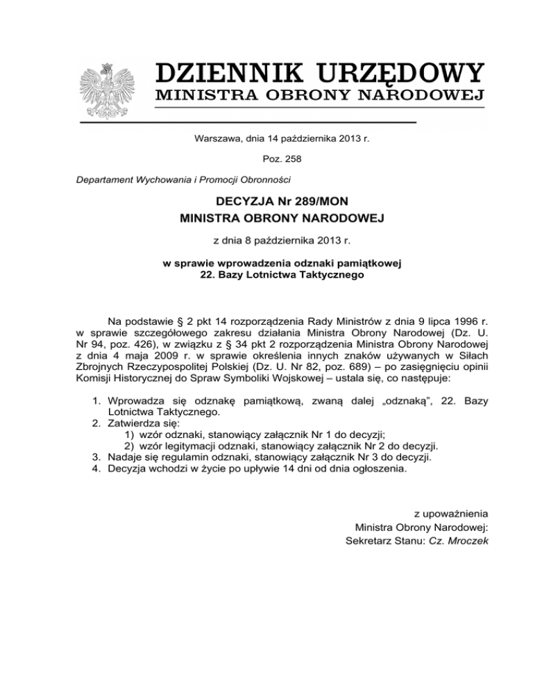 DECYZJA Nr 289/MON MINISTRA OBRONY NARODOWEJ