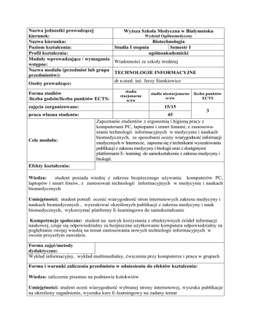Nazwa jednostki prowadzącej Wyższa Szkoła Medyczna w Białymstoku Wydział Ogólnomedyczny kierunek: Nazwa kierunku: Biotechnologia Poziom kształcenia: Studia I stopnia Semestr I Profil kształcenia: ogólnoakademicki Moduły wprowadzające / wymagania Wiadomości ze szkoły średniej wstępne: Nazwa modułu (przedmiot lub grupa TECHNOLOGIE INFORMACYJNE przedmiotów): dr n.med. inż. Jerzy Sienkiewicz Osoby prowadzące: Forma studiów /liczba godzin/liczba punktów ECTS: zajęcia zorganizowane: praca własna studenta: Cele modułu: studia stacjonarne w/ćw studia niestacjonarne w/ćw liczba punktów ECTS 15/15 3 45 Zapoznanie studentów z ergonomią i higieną pracy z komputerami PC, laptopami i smart fonami; z zastosowaniami technologii informacyjnych w medycynie i naukach biomedycznych, ze sposobami oceny wiarygodność informacji medycznych w Internecie, zapozna się z technikami wyszukiwania publikacji z zakresu medycyny i biologii oraz z dostępnymi platformami E- learning do samokształcenie z zakresu medycyny i biologii. Efekty kształcenia: Wiedza: student posiada wiedzę z zakresu bezpiecznego używania komputerów PC, laptopów i smart fonów, z zastosowań technologii informacyjnych w medycynie i naukach biomedycznych Umiejętności: student potrafi ocenić wiarygodność stron internetowych zakresu medycyny i naukach biomedycznych , wyszukiwać określonych publikacji z zakresu medycyny i nauk biomedycznych, wykorzystać platformy E-learningowe do samokształcenie Kompetencje społeczne: student na nawyk korzystania z obiektywnych źródeł informacji naukowej, czuje się odpowiedzialny za bezpieczne użytkowanie komputera odpowiedzialny za pogłębianie swojej wiedzę na temat zastosowania nowych technologii informacyjnych w swoim przyszłym zawodzie. Forma zajęć/metody dydaktyczne: Wykład informacyjny, wykład multimedialny, ćwiczenia przy komputerze i praca w grupach Forma i warunki zaliczenia przedmiotu w odniesieniu do efektów kształcenia: Wiedza: zaliczenie pisemne na podstawie kolokwiów Umiejętności: student oceni wiarygodność wybranej strony internetowej, wyszuka publikacje na określony zagadnienie, wyszuka kurs E-learningowy na zadany temat Kompetencje: student prezentuje swoje nabyte umiejętności ze zwróceniem szczególnej uwagi na kreatywność i komunikację Treści programowe: Wykłady: studia niestacjonarne 1. Ergonomia i higiena pracy z komputerami PC, laptopami i smartfonami – 1h 2. Zastosowania technologii informacyjnych w medycynie i naukach biomedycznych • Komputery w zarządzaniu placówką ochrony zdrowia – 2h • Elektroniczna historia choroby i wizyt – 1h • Analiza sygnałów biomedycznych – 1h • Systemy akwizycji i analizy obrazów – 1h • Systemy wspomagania decyzji – 1h • Telemedycyna i e-zdrowie – 1h • Medyczny internet - 1h • Komputerowe wspomaganie nauczania medycyny – 1h 3. Wiarygodność informacji medycznych w Internecie, certyfikaty medycznych stron WWW – 2h 4. Podlaski system eZdrowie. – 2h 5. Aplikacje z zakresu medycyny i biologii na urządzenia mobilne – 1h Ćwiczenia: studia niestacjonarne 1. Projektowanie baz danych medycznych oraz ich kontrola i przechowywania z użyciem Excela – 3h 2. Przegląd stron internetowych zakresu medycyny i nauk biomedycznych oraz ich ocena pod kątem wiarygodności – 3h 3. Obsługa wybranych medycznych systemów ekspertowych – 3h 4. Wyszukiwanie publikacji z zakresu medycyny i nauk biomedycznych za pomocą Medlaina i Pubmedu – 3h 5. Wykorzystanie dostêpnych bezp³atnych platform E- learningowych do samokszta³cenie z zakresu medycyny i naukach biomedycznych – 3h Literatura podstawowa: 1. Rudowski R., ed.: Informatyka medyczna, Wydawnictwo Naukowe PWN, 2003 r. 2. Roterman-Konieczna I., ed.: Elementy informatyki medycznej , Wyd. UJ, Kraków 2011 Literatura uzupełniająca: