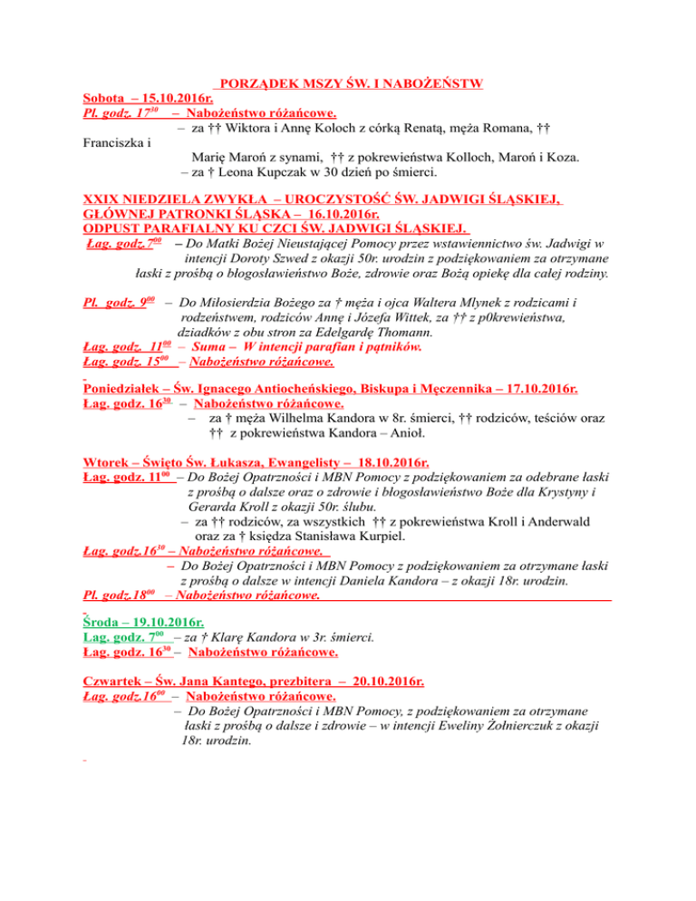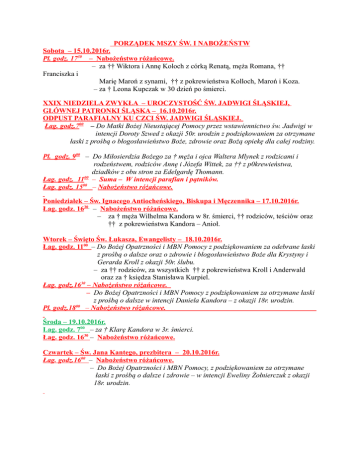 PORZĄDEK MSZY ŚW. I NABOŻEŃSTW Sobota – 15.10.2016r. Pl. godz. 1730 – Nabożeństwo różańcowe. – za †† Wiktora i Annę Koloch z córką Renatą, męża Romana, †† Franciszka i Marię Maroń z synami, †† z pokrewieństwa Kolloch, Maroń i Koza. – za † Leona Kupczak w 30 dzień po śmierci. XXIX NIEDZIELA ZWYKŁA – UROCZYSTOŚĆ ŚW. JADWIGI ŚLĄSKIEJ, GŁÓWNEJ PATRONKI ŚLĄSKA – 16.10.2016r. ODPUST PARAFIALNY KU CZCI ŚW. JADWIGI ŚLĄSKIEJ. Łag. godz.700 – Do Matki Bożej Nieustającej Pomocy przez wstawiennictwo św. Jadwigi w intencji Doroty Szwed z okazji 50r. urodzin z podziękowaniem za otrzymane łaski z prośbą o błogosławieństwo Boże, zdrowie oraz Bożą opiekę dla całej rodziny. Pl. godz. 900 – Do Miłosierdzia Bożego za † męża i ojca Waltera Mlynek z rodzicami i rodzeństwem, rodziców Annę i Józefa Wittek, za †† z p0krewieństwa, dziadków z obu stron za Edelgardę Thomann. Łag. godz. 1100 – Suma – W intencji parafian i pątników. Łag. godz. 1500 – Nabożeństwo różańcowe. Poniedziałek – Św. Ignacego Antiocheńskiego, Biskupa i Męczennika – 17.10.2016r. Łag. godz. 1630 – Nabożeństwo różańcowe. – za † męża Wilhelma Kandora w 8r. śmierci, †† rodziców, teściów oraz †† z pokrewieństwa Kandora – Anioł. Wtorek – Święto Św. Łukasza, Ewangelisty – 18.10.2016r. Łag. godz. 1100 – Do Bożej Opatrzności i MBN Pomocy z podziękowaniem za odebrane łaski z prośbą o dalsze oraz o zdrowie i błogosławieństwo Boże dla Krystyny i Gerarda Kroll z okazji 50r. ślubu. – za †† rodziców, za wszystkich †† z pokrewieństwa Kroll i Anderwald oraz za † księdza Stanisława Kurpiel. Łag. godz.1630 – Nabożeństwo różańcowe. – Do Bożej Opatrzności i MBN Pomocy z podziękowaniem za otrzymane łaski z prośbą o dalsze w intencji Daniela Kandora – z okazji 18r. urodzin. 00 Pl. godz.18 – Nabożeństwo różańcowe. Środa – 19.10.2016r. Lag. godz. 700 – za † Klarę Kandora w 3r. śmierci. Łag. godz. 1630 – Nabożeństwo różańcowe. Czwartek – Św. Jana Kantego, prezbitera – 20.10.2016r. Łag. godz.1600 – Nabożeństwo różańcowe. – Do Bożej Opatrzności i MBN Pomocy, z podziękowaniem za otrzymane łaski z prośbą o dalsze i zdrowie – w intencji Eweliny Żołnierczuk z okazji 18r. urodzin. Pl. godz.1730 – Msza św. Szkolna i Młodzieżowa. – Nabożeństwo różańcowe. – Za wstawiennictwem MBN Pomocy i do Opatrzności Bożej, z podziękowaniem za otrzymane łaski, z prośbą o dalsze zdrowie i błogosławieństwo Boże w rodzinie Jerominek. Piątek – Bł. Jakuba Strzemię, Biskupa – 21.10.2016r. Łag. godz. 1600 – Msza św. Szkolna i Młodzieżowa. – Nabożeństwo różańcowe. – za † Józefa Pawelek z 2 żonami, syna Romana, Pawła i Józefa Froncek, Lotara Werner i zmarłych z rodzin Pawelek, Froncek, Koza i zmarłą Monikę Orłowską. Pl., godz. 1800 – za † Martę Janys ( od mieszkańców Pietraszowa ). Sobota – Św.Juana Pawła II, Papieża – 22.10.2016r. Pl. godz.1400 – Do Bożej Opatrzności i MBN Pomocy, z podziękowaniem za otrzymane łaski z prośbą o dalsze i zdrowie w intencji Elżbiety i Franciszka Korzeniewski w 40r. ślubu i o Boże błogosławieństwo dla rodzin dzieci. Łag. godz. 1500 – Nabożeństwo różańcowe. – Do Bożej Opatrzności i MBN Pomocy, z podziękowaniem za otrzymane łaski z prośbą o dalsze – w intencji Grażyny i Krzysztofa Strzelczyk w 25r. ślubu, a także o zdrowie dla synów. Pl. godz. 1600 – Do Bożej Opatrzności i MBN Pomocy, z podziękowaniem za otrzymane łaski z prośbą o dalsze i zdrowie w intencji Kamila Bryłka w 18r. urodzin. Pl. godz. 1730 – Nabożeństwo różańcowe. – za † męża Tomasza Dykta, jego rodziców, rodzeństwo, za zmarłych rodziców Joannę i Franciszka Gola z synem, córką, zięciem i za zmarłych z rodzin : Dykta, Gola, Spałek, Pankulla. XXX NIEDZIELA ZWYKŁA – 23.10.2016r. Łag. godz.700 – W intencji parafian. Pl. godz. 900 – za † Hildegardę Maciuch w 3r. śmierci. Łag. godz. 1030 – Suma – Roczki : Do Anioła Stróża w intencji rocznego dziecka Wiktorii Bonk, a także za rodziców i chrzestnych. – Do MB Częstochowskiej, Św. Jadwigi, z podziękowaniem za odebrane łaski z prośbą o dalsze i zdrowie z okazji urodzin Elżbiety Zajonc, zmarłego męża i wnuka, zmarłych z pokrewieństwa. Łag. godz. 1500 – Nabożeństwo różańcowe. OGŁOSZENIA PARAFIALNE. Dziś w naszej parafii Odpust ku czci Św. Jadwigi Śląskiej. Sumę odpustową odprawi i kazania wygłosi O. Maksymilian OMI z Lublińca. W dniu dzisiejszym można zyskać odpust zupełny pod zwykłymi warunkami. Dzisiaj procesja z Pluder do Łagiewnik Małych wyruszy o godz. 10 00. W przyszłą niedzielę 23 października przypada Niedziela Misyjna. Kolekta w przyszłą niedzielę na misje. W poniedziałek po nabożeństwie różańcowym i Mszy św. spotkanie kl. II gimnazjalnej przed Bierzmowaniem w salce katechetycznej w Łagiewnikach Małych, a w Pludrach spotkanie klasy II gimnazjalnej w czwartek po Mszy św. Szkolnej i Młodzieżowej. W przyszłą niedzielę w czasie nabożeństwa różańcowego w kościele parafialnym poświęcenie różańców dzieci I komunijnych, a po nabożeństwie spotkanie z rodzicami tychże dzieci.
