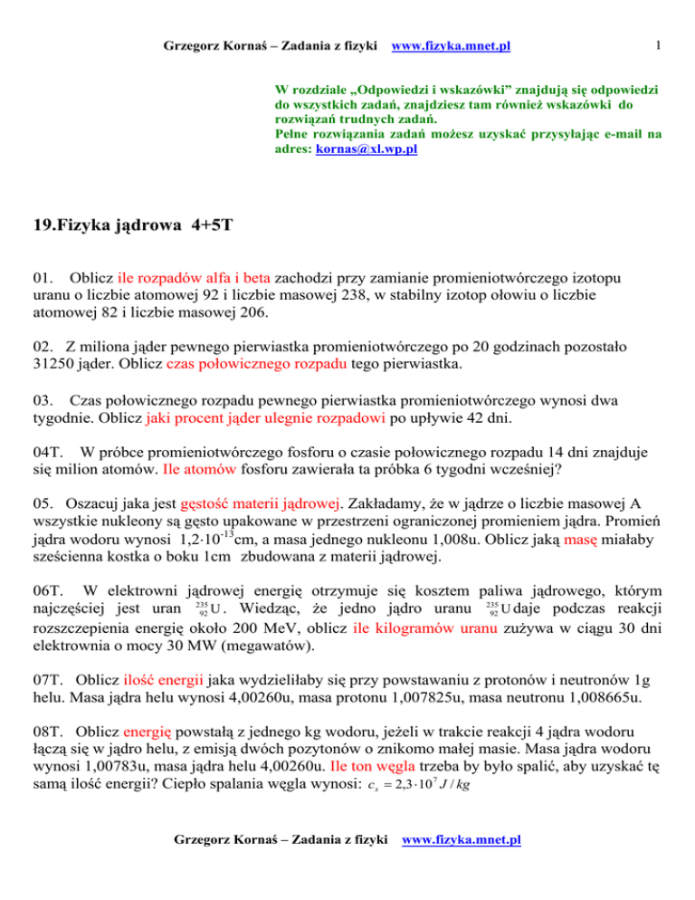 Grzegorz Kornaś – Zadania z fizyki www.fizyka.mnet.pl 1 W rozdziale „Odpowiedzi i wskazówki” znajdują się odpowiedzi do wszystkich zadań, znajdziesz tam również wskazówki do rozwiązań trudnych zadań. Pełne rozwiązania zadań możesz uzyskać przysyłając e-mail na adres: [email protected] 19.Fizyka jądrowa 4+5T 01. Oblicz ile rozpadów alfa i beta zachodzi przy zamianie promieniotwórczego izotopu uranu o liczbie atomowej 92 i liczbie masowej 238, w stabilny izotop ołowiu o liczbie atomowej 82 i liczbie masowej 206. 02. Z miliona jąder pewnego pierwiastka promieniotwórczego po 20 godzinach pozostało 31250 jąder. Oblicz czas połowicznego rozpadu tego pierwiastka. 03. Czas połowicznego rozpadu pewnego pierwiastka promieniotwórczego wynosi dwa tygodnie. Oblicz jaki procent jąder ulegnie rozpadowi po upływie 42 dni. 04T. W próbce promieniotwórczego fosforu o czasie połowicznego rozpadu 14 dni znajduje się milion atomów. Ile atomów fosforu zawierała ta próbka 6 tygodni wcześniej? 05. Oszacuj jaka jest gęstość materii jądrowej. Zakładamy, że w jądrze o liczbie masowej A wszystkie nukleony są gęsto upakowane w przestrzeni ograniczonej promieniem jądra. Promień jądra wodoru wynosi 1,2⋅10-13cm, a masa jednego nukleonu 1,008u. Oblicz jaką masę miałaby sześcienna kostka o boku 1cm zbudowana z materii jądrowej. 06T. W elektrowni jądrowej energię otrzymuje się kosztem paliwa jądrowego, którym najczęściej jest uran 235 Wiedząc, że jedno jądro uranu 235 podczas reakcji 92 U . 92 U daje rozszczepienia energię około 200 MeV, oblicz ile kilogramów uranu zużywa w ciągu 30 dni elektrownia o mocy 30 MW (megawatów). 07T. Oblicz ilość energii jaka wydzieliłaby się przy powstawaniu z protonów i neutronów 1g helu. Masa jądra helu wynosi 4,00260u, masa protonu 1,007825u, masa neutronu 1,008665u. 08T. Oblicz energię powstałą z jednego kg wodoru, jeżeli w trakcie reakcji 4 jądra wodoru łączą się w jądro helu, z emisją dwóch pozytonów o znikomo małej masie. Masa jądra wodoru wynosi 1,00783u, masa jądra helu 4,00260u. Ile ton węgla trzeba by było spalić, aby uzyskać tę samą ilość energii? Ciepło spalania węgla wynosi: c s = 2,3 ⋅ 10 7 J / kg Grzegorz Kornaś – Zadania z fizyki www.fizyka.mnet.pl Grzegorz Kornaś – Zadania z fizyki www.fizyka.mnet.pl 2 09TT. Słońce wypromieniowuje energię z szybkością P = 3,86⋅10²ºMJ/s (megadżuli na sekundę). Energia słoneczna powstaje podczas syntezy wodoru w hel. Przyjmując, że w trakcie tej reakcji 4 jądra wodoru łączą się w jądro helu oblicz, ile wodoru ubywa w każdej sekundzie. Masa jądra wodoru wynosi 1,00783u, masa jądra helu 4,00260u. Oszacuj masę wodoru, która uległa zamianie na hel w ciągu 4 miliardów lat istnienia Słońca i porównaj ją z obecną masą Słońca (MSłońca = 1,983⋅10³ºkg). W rozdziale „Odpowiedzi i wskazówki” znajdują się odpowiedzi do wszystkich zadań, znajdziesz tam również wskazówki do rozwiązań trudnych zadań. Pełne rozwiązania zadań możesz uzyskać przysyłając e-mail na adres: [email protected] Grzegorz Kornaś – Zadania z fizyki www.fizyka.mnet.pl