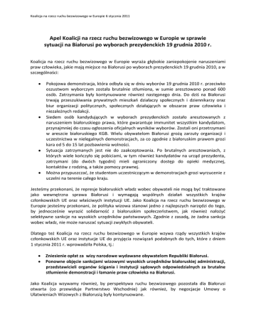 Koalicja na rzecz ruchu bezwizowego w Europie 6 stycznia 2011 Apel Koalicji na rzecz ruchu bezwizowego w Europie w sprawie sytuacji na Białorusi po wyborach prezydenckich 19 grudnia 2010 r. Koalicja na rzecz ruchu bezwizowego w Europie wyraża głębokie zaniepokojenie naruszeniami praw człowieka, jakie mają miejsce na Białorusi po wyborach prezydenckich 19 grudnia 2010, a w szczególności: Pokojowa demonstracja, która odbyła się w dniu wyborów 19 grudnia 2010 r. przeciwko oszustwom wyborczym została brutalnie stłumiona, w sumie aresztowano ponad 600 osób. Zatrzymania były kontynuowane również następnego dnia. Do dziś na Białorusi trwają przeszukiwania prywatnych mieszkao działaczy społecznych i dziennikarzy oraz biur organizacji politycznych, społecznych działających w obszarze praw człowieka i niezależnych redakcji. Siedem osób kandydujących w wyborach prezydenckich zostało aresztowanych z naruszeniem białoruskiego prawa, które gwarantuje immunitet wszystkim kandydatom, przynajmniej do czasu ogłoszenia oficjalnych wyników wyborów. Zostali oni przetrzymani w areszcie białoruskiego KGB. Wielu obywatelom Białorusi grożą zarzuty organizacji i uczestnictwa w nielegalnych demonstracjach, za co zgodnie z białoruskim prawem grozi kara od 5 do 15 lat pozbawienia wolności. Sytuacja zatrzymanych jest nie do zaakceptowania. Po brutalnych aresztowaniach, z których wiele kooczyło się pobiciami, w tym również kandydatów na urząd prezydenta, zatrzymani (do dwóch tygodni) mieli ograniczony dostęp do opieki medycznej, kontaktów z rodziną, a także pomocy prawnej. Można przypuszczad, że studentom uczestniczącym w demonstracjach grozi wyrzucenie z uczelni na terenie całego kraju. Jesteśmy przekonani, że represje białoruskich władz wobec obywateli nie mogą byd traktowane jako wewnętrzna sprawa Białorusi i wymagają wspólnych działao wszystkich krajów członkowskich UE oraz właściwych instytucji UE. Jako Koalicja na rzecz ruchu bezwizowego w Europie jesteśmy przekonani, że polityka wizowa stanowi jedno z najlepszych narzędzi do tego, by jednocześnie wyrazid solidarnośd z białoruskim społeczeostwem, jak również nałożyd selektywne sankcje na wysokich urzędników paostwowych. Zgodnie z zasadą, że żadna sankcja wobec władz, nie może naruszad sytuacji zwykłych obywateli. Dlatego też Koalicja na rzecz ruchu bezwizowego w Europie wzywa rządy wszystkich krajów członkowskich UE oraz instytucje UE do przyjęcia rozwiązao podobnych do tych, które z dniem 1 stycznia 2011 r. wprowadziła Polska, tj.: Zniesienie opłat za wizy narodowe wydawane obywatelom Republiki Białorusi. Ponowne objęcie sankcjami wizowymi wysokich urzędników białoruskiej administracji, przedstawicieli organów ścigania i instytucji sądowych odpowiedzialnych za brutalne stłumienie demonstracji i łamanie praw człowieka na Białorusi. Jako Koalicja wzywamy również, by perspektywa ruchu bezwizowego pozostała dla Białorusi otwarta (co przewiduje Partnerstwo Wschodnie) jak również, by negocjacje Umowy o Ułatwieniach Wizowych z Białorusią były kontynuowane. Koalicja na rzecz ruchu bezwizowego w Europie 6 stycznia 2011 CZŁONKOWIE i ORGANIZACJE PARTNERSKIE Koalicji Analytical Center on Globalization and Regional Cooperation, Armenia Association for International Affairs (AMO), Czechy Belarus Watch, Litwa Center for Social Innovations, Białoruś Centrum Stosunków Międzynarodowych, Polska Civic Belarus, Czechy Eastern Europe Studies Centre, Litwa ECAS, Bruksela Europe without Barriers, Ukraina EUROBELARUS Fundacja Edukacja dla Demokracji, Polska Fundacja im. Stefana Batorego, Polska Georgian Foundation for Strategic and International Studies, Gruzja Hungarian Europe Society, Węgry Inicjatywa Wolna Białoruś, Polska Institute for Euro-Atlantic Cooperation, Ukraina Institute for Public Policy, Mołdawia Instytut Spraw Publicznych, Polska Office for Democratic Belarus, Białoruś/Bruksela Open Estonia Foundation, Estonia Open Society Institute, Bruksela Open Society Institute Sofia, Bułgaria Östgruppen - Swedish Initiative for Democracy and Human Rights, Szwecja Public Movement “Multinational Georgia” (PMMG), Gruzja Research Center of the Slovak Foreign Policy Association, Słowacja Soros Foundation, Łotwa