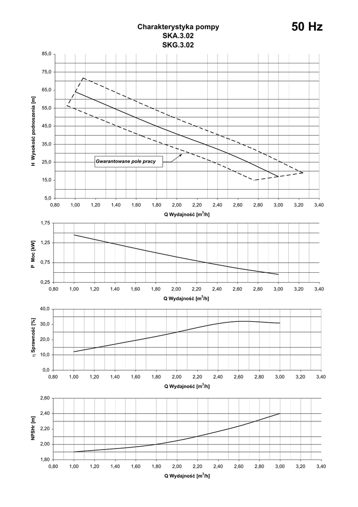 50 Hz Charakterystyka pompy SKA.3.02 SKG.3.02 85,0 75,0 H Wysokość podnoszenia [m] 65,0 55,0 45,0 35,0 Gwarantowane pole pracy 25,0 15,0 5,0 0,80 1,00 1,20 1,40 1,60 1,80 2,00 2,20 2,40 2,60 2,80 3,00 3,20 3,40 2,40 2,60 2,80 3,00 3,20 3,40 2,40 2,60 2,80 3,00 3,20 3,40 2,40 2,60 2,80 3,00 3,20 3,40 3 Q Wydajność [m /h] P Moc [kW] 1,75 1,25 0,75 0,25 0,80 1,00 1,20 1,40 1,60 1,80 2,00 2,20 3 Q Wydajność [m /h] η Sprawność [%] 40,0 30,0 20,0 10,0 0,0 0,80 1,00 1,20 1,40 1,60 1,80 2,00 2,20 3 Q Wydajność [m /h] 2,60 NPSHr [m] 2,40 2,20 2,00 1,80 0,80 1,00 1,20 1,40 1,60 1,80 2,00 2,20 3 Q Wydajność [m /h]