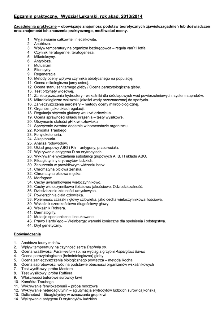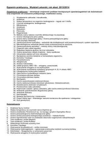 Egzamin praktyczny, Wydział Lekarski, rok akad. 2013/2014 Zagadnienia praktyczne – obowiązuje znajomość podstaw teoretycznych zjawisk/zagadnień lub doświadczeń oraz znajomość ich znaczenia praktycznego, możliwości oceny. 1. 2. 3. 4. 5. 6. 7. 8. 9. 10. 11. 12. 13. 14. 15. 16. 17. 18. 19. 20. 21. 22. 23. 24. 25. 26. 27. 28. 29. 30. 31. 32. 33. 34. 35. 36. 37. 38. 39. 40. 41. 42. 43. 44. Wyjaławianie całkowite i niecałkowite. Anabioza. Wpływ temperatury na organizm bezkręgowca – reguła van`t Hoffa. Czynniki teratogenne, teratogeneza. Mikotoksyny. Antybioza. Mutualizm. Fitoncydy. Regeneracja. Metody oceny wpływu czynnika abiotycznego na populację. Ocena mikologiczna jamy ustnej. Ocena stanu sanitarnego gleby / Ocena parazytologiczna gleby. Test przynęty włosowej. Zanieczyszczenia hydrosfery - wskaźniki dla śródlądowych wód powierzchniowych, system saprobów. Mikrobiologiczne wskaźniki jakości wody przeznaczonej do spożycia. Zanieczyszczenia aerosfery – metody oceny mikrobiologicznej. Organizm jako układ regulacji. Regulacja stężenia glukozy we krwi człowieka. Ocena sprawności układu krążenia – testy wysiłkowe. Utrzymanie stałości pH krwi człowieka Sprzężenie zwrotne dodatnie w homeostazie organizmu. Komórka Traubego Fenyloketonuria. Alkaptonuria. Analiza rodowodów. Układ grupowy ABO i Rh – antygeny, przeciwciała. Wykrywanie antygenu D na erytrocytach. Wykrywanie wydzielania substancji grupowych A, B, H układu ABO. Fitoaglutyniny erytrocytów ludzkich. Zaburzenia w prawidłowym widzeniu barw. Chromatyna płciowa żeńska. Chromatyna płciowa męska. Morfogram. Cechy uwarunkowane wieloczynnikowo. Cechy wieloczynnikowe ilościowe/ jakościowe. Odziedziczalność. Dziedziczenie zdolności umysłowych. Powierzchnia ciała człowieka. Pojemność czaszki / głowy człowieka, jako cecha wieloczynnikowa ilościowa. Wskaźnik szerokościowo-długościowy głowy. Wskaźnik Rohrera. Dermatoglify. Mutacje spontaniczne i indukowane. Prawo Hardy`ego – Weinberga: warunki konieczne dla spełnienia i odstępstwa. Dryf genetyczny. Doświadczenia 1. 2. 3. 4. 5. 6. 7. 8. 9. 10. 11. 12. 13. 14. Anabioza fauny mchów Wpływ temperatury na czynność serca Daphnia sp. Ocena wrażliwości Paramecium sp. na wyciąg z grzybni Aspergillus flavus Ocena parazytologiczna (helmintologiczna) gleby Ocena zanieczyszczenia biologicznego powietrza – metoda Kocha Ocena saprobowości wód na podstawie obecności organizmów wskaźnikowych Test wysiłkowy: próba Mastera Test wysiłkowy: próba Ruffiera Właściwości buforowe surowicy krwi Komórka Traubego Wykrywanie fenyloketonurii – próba moczowa Wykrywanie heteroaglutynin – aglutynacja erytrocytów ludzkich surowicą końską Dolichotest – fitoaglutyniny w oznaczaniu grup krwi Wykrywanie antygenu D erytrocytów ludzkich 15. 16. 17. 18. 19. 20. 21. 22. 23. 24. 25. 26. Wykrywanie obecności substancji grupowych układu ABO w ślinie Wykrywanie „pałeczki dobosza” Doświadczenie Lederbergów Wykonanie własnego morfogramu Ocena pojemności głowy/czaszki metodą Lee Pearsona Ocena pojemności czaszki metodą Broc’a Obliczanie wskaźnika szerokościowo-długościowego głowy/czaszki Obliczanie powierzchni własnego ciała Obliczanie wskaźnika Rohrera Rozkład cechy wieloczynnikowej w populacji – analiza na modelu; krzywa rozkładu kulek w aparacie Galtona Ocena własnych dermatoglifów Dryf genetyczny – analiza na modelu Preparaty makroskopowe 1. 2. 3. 4. 5. 6. 7. 8. 9. 10. 11. 12. 13. 14. 15. 16. 17. 18. 19. 20. 21. 22. 23. 24. 25. 26. 27. 28. 29. 30. 31. 32. 33. 34. 35. 36. 37. Gallus sp. – wady rozwojowe Płuco człowieka z pylicą węglową Płuco człowieka zdrowego Penicillium sp. – plecha Aspergillus niger – plecha Aspergillus flavus – plecha Trichophyton sp. – plecha Mucor sp – plecha Rhizopus sp. – plecha Candida sp. – plecha Geotrichum candidum – plecha Cryptococcus neoformans – plecha Rhodotorula rubra – plecha Phytophtora infestans na ziemniaku Solanum tuberosum Cetraria islandica – plecha Korzeń Lupinus sp. z brodawkami Orzeszki archaidowe Arachis hypogaea porażone Aspergillus flavus Hirudo medicinalis – osobnik dojrzały Bufo bufo – osobnik dojrzały Atropa belladonna – owoc Datura stramonium – torebka nasienna Digitalis puruprea – kwiatostan Secale cornutum – ergot Paxillus inovolutus – owocnik Amanita phalloides – owocnik Agaricus campestris – owocnik Vespa crabro – imago Apis mellifera – imago Vespula vulgaris – imago Leiurus sp. – osobnik dojrzały Sarcophaga haemorrhoidalis – imago Lucilia sericata – imago Musca domestica – imago, bobówka Ixodes ricinus – osobnik dojrzały Ricinus communis – nasiona Dreissena sp.i Unio sp. – osobniki dojrzałe Diphyllobothrium latum – strobila Preparaty mikroskopowe 1. 2. 3. 4. 5. 6. 7. 8. 9. 10. Lilium sp – pyłek Entomophtora muscae – zarodniki na skrzydle muchy Cetraria islandica – fragment plechy Streptomyces sp. – fragment plechy Candida sp. – fragment plechy, blastospory, pseudostrzępki Geotrichum candidum – fragment plechy, artrospory, strzępki Anopheles maculipennis – imago, narządy gębowe, larwa Culex pipiens – imago, narządy gębowe, larwa Apis mellifera – żądło Vespula vulgaris – żądło 11. 12. 13. 14. 15. 16. 17. 18. 19. 20. 21. 22. 23. 24. 25. 26. 27. 28. 29. 30. 31. 32. Płuco człowieka z pylicą węglową Płuco człowieka zdrowego Cryptococcus neoformans – preparat w tuszu Trypanosoma gambiense – postaci trypomastigota w krwi Ixodes ricinus – osobnik dojrzały Musca domestica – larwa, jaja Loa loa – mikrofilarie Schistosoma mansoni – osobniki dojrzałe Trichuris trichiura – jaja Perforacja włosa przez dermatofity Pediculus humanus – imago, gnida Pthirus pubis – imago, gnida Pulex irritans – imago Enterobius vermicularis – osobnik dojrzały, jaja Fasciola hepatica – osobnik dojrzały, jaja, metacerkaria Diphyllob