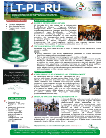 Wydanie 7 | 04-02-2015 Życzenia Noworoczne 5 Konferencja Roczna Przypomnienie – raport końcowy 5 ROCZNA KONFERENCJA PROGRAMU 25 listopada 2014 roku odbyła się w Kaliningradzie 5 Konferencja Roczna Programu Współpracy Transgranicznej EISP Litwa-Polska-Rosja 2007-2013. Podsumowano realizację Programu oraz efekty projektów realizowanych przez Beneficjentów i Partnerów, przedstawiono perspektywy współpracy trzech krajów w 2015 oraz przyszłość Programu. Po części oficjalnej uczestnicy mieli niepowtarzalną okazję zapoznać się z efektami projektu pn. „Muzea ponad granicami” realizowanego w ramach Programu Współpracy Transgranicznej EISP Litwa-Polska-Rosja 2007-2013 oraz odwiedzić Muzeum Brama Frydlandzka w Kaliningradzie. W wydarzeniu wzięło udział ponad 120 osób. PRZYPOMNIENIE! RAPORT KOŃCOWY Beneficjent musi złożyć raport końcowy w ciągu 3 miesięcy od daty zakończenia okresu wdrażania projektu. Ważne: Należy raportować tylko koszty kwalifikowalne poniesione w okresie raportowym (poniesione po poprzednim raporcie okresowym); Należy ująć wszystkie poniesione koszty (np. koszt audytu, ewaluacji); W sytuacji, gdy kosz audytu został poniesiony po zakończeniu okresu wdrażania projektu Beneficjent powinien złożyć raport końcowy do weryfikacji audytorowi z ujętym wydatkiem, bez numeru faktury, daty wystawienia dokumentu oraz daty płatności. Raport powinien zostać uzupełniony o brakujące informacje po weryfikacji przez audytora. Dopiero po uzupełnieniu raportu powinien on zostać podpisany przez audytora. Koszt audytu opłacony po okresie zakończenia realizacji projektu nie wpływa na kurs po jakim przelicza się wydatki w okresie raportowym. W OLECKU ODBYŁO SIĘ SEMINARIUM „JAK OSZCZĘDZAĆ WODĘ” Na zakończenie realizacji projektu pn. „Partnerstwo na rzecz ochrony wód obszaru transgranicznego Litwy Polski i Rosji” odbędą się 3 seminaria eksperckie „Jak oszczędzać wodę”. Celem seminarium było określenie najważniejszych wyzwań związanych z oszczędzaniem wody na terenie poszczególnych krajów uczestniczących w projekcie oraz zidentyfikowanie wyzwań związanych z osiągnięciem dobrego stanu wód w odniesieniu do jakości, ilości oraz ich wykorzystania we wszystkich dorzeczach, a także wskazanie następnych działań z zakresu jakości wód dotyczących oszczędnego gospodarowania zasobami wody. OFICJALNE OTWARCIE DROGI WOJEWÓDZKIEJ NR 591 Europejski Dzień Współpracy – 3 kwartał 2015 Konferencja Kończąca – 4 kwartał 2015 Działania promujące projekty realizowane w ramach Programu Współpracy Transgranicznej EISP Litwa-Polska-Rosja 2007-2013 13 listopada 2014 był ważnym dniem dla mieszkańców Kętrzyna i Mrągowa, ponieważ oficjalnie otworzono zmodernizowaną drogę wojewódzką nr 591. W uroczystości wzięli udział przedstawiciele władz regionalnych i lokalnych jak również mieszkańcy oraz dzieci ze szkoły w Wilkowie. W ramach modernizacji drogi wzmocniono jej podłoże, położono nową nawierzchnię bitumiczną, poszerzono i wzmocniono pobocze jak również wycięto zakrzewienia. Modernizacja 22,4 km drogi była możliwa dzięki wsparciu Unii Europejskiej w ramach projektu pn. „Poprawa połączenia trans granicznego miedzy Polską a Rosją poprzez przebudowę drogi wojewódzkiej nr. 591 Granica państwa– Barciany – Kętrzyn – Mrągowo; etap I: wzmocnienie nawierzchni drogi nr. 591 na odcinku Kętrzyn – Mrągowo”.