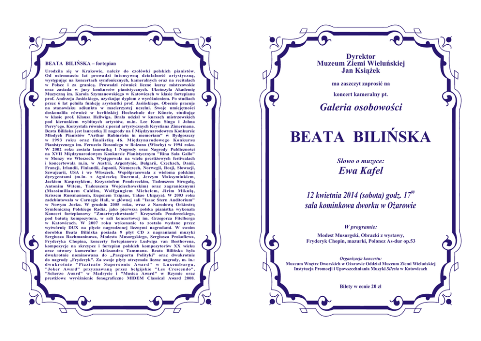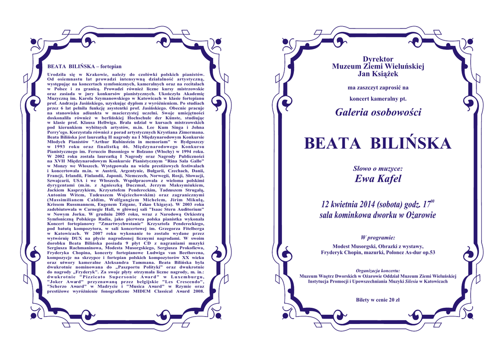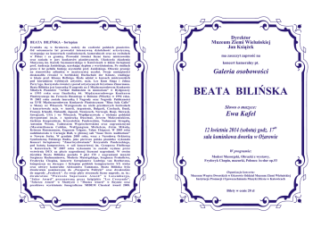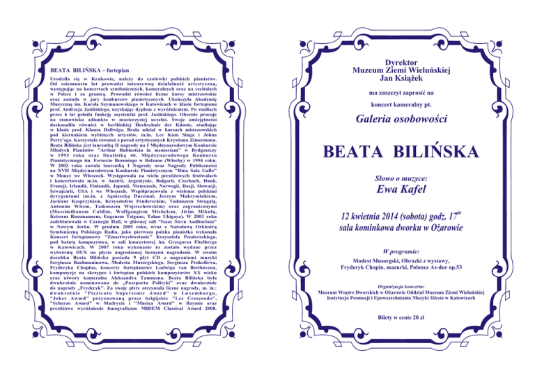 BEATA BILIÑSKA – fortepian Urodzi³a siê w Krakowie, nale¿y do czo³ówki polskich pianistów. Od osiemnastu lat prowadzi intensywn¹ dzia³alnoœæ artystyczn¹, wystêpuj¹c na koncertach symfonicznych, kameralnych oraz na recitalach w Polsce i za granic¹. Prowadzi równie¿ liczne kursy mistrzowskie oraz zasiada w jury konkursów pianistycznych. Ukoñczy³a Akademiê Muzyczn¹ im. Karola Szymanowskiego w Katowicach w klasie fortepianu prof. Andrzeja Jasiñskiego, uzyskuj¹c dyplom z wyró¿nieniem. Po studiach przez 6 lat pe³ni³a funkcjê asystentki prof. Jasiñskiego. Obecnie pracuje na stanowisku adiunkta w macierzystej uczelni. Swoje umiejêtnoœci doskonali³a równie¿ w berliñskiej Hochschule der Künste, studiuj¹c w klasie prof. Klausa Hellwiga. Bra³a udzia³ w kursach mistrzowskich pod kierunkiem wybitnych artystów, m.in. Lee Kum Singa i Johna Perry'ego. Korzysta³a równie¿ z porad artystycznych Krystiana Zimermana. Beata Biliñska jest laureatk¹ II nagrody na I Miêdzynarodowym Konkursie M³odych Pianistów "Arthur Rubinstein in memoriam" w Bydgoszczy w 1993 roku oraz finalistk¹ 46. Miêdzynarodowego Konkursu Pianistycznego im. Feruccio Busoniego w Bolzano (W³ochy) w 1994 roku. W 2002 roku zosta³a laureatk¹ I Nagrody oraz Nagrody Publicznoœci na XVII Miêdzynarodowym Konkursie Pianistycznym "Rina Sala Gallo" w Monzy we W³oszech. Wystêpowa³a na wielu presti¿owych festiwalach i koncertowa³a m.in. w Austrii, Argentynie, Bu³garii, Czechach, Danii, Francji, Irlandii, Finlandii, Japonii, Niemczech, Norwegii, Rosji, S³owacji, Szwajcarii, USA i we W³oszech. Wspó³pracowa³a z wieloma polskimi dyrygentami (m.in. z Agnieszk¹ Duczmal, Jerzym Maksymiukiem, Jackiem Kasprzykiem, Krzysztofem Pendereckim, Tadeuszem Struga³¹, Antonim Witem, Tadeuszem Wojciechowskim) oraz zagranicznymi (Massimilianem Caldim, Wolfgangiem Michelem, Jirim Mikul¹, Krissem Russmannem, Eugenem Tzigane, Takao Ukigaya). W 2003 roku zadebiutowa³a w Carnegie Hall, w g³ównej sali "Isaac Stern Auditorium" w Nowym Jorku. W grudniu 2005 roku, wraz z Narodow¹ Orkiestr¹ Symfoniczn¹ Polskiego Radia, jako pierwsza polska pianistka wykona³a Koncert fortepianowy "Zmartwychwstanie" Krzysztofa Pendereckiego, pod batut¹ kompozytora, w sali koncertowej im. Grzegorza Fitelberga w Katowicach. W 2007 roku wykonanie to zosta³o wydane przez wytwórniê DUX na p³ycie nagrodzonej licznymi nagrodami. W swoim dorobku Beata Biliñska posiada 9 p³yt CD z nagraniami muzyki Sergiusza Rachmaninowa, Modesta Musorgskiego, Sergiusza Prokofiewa, Fryderyka Chopina, koncerty fortepianowe Ludwiga van Beethovena, kompozycje na skrzypce i fortepian polskich kompozytorów XX wieku oraz utwory kameralne Aleksandra Tansmana. Beata Biliñska by³a dwukrotnie nominowana do „Paszportu Polityki” oraz dwukrotnie do nagrody „Fryderyk". Za swoje p³yty otrzyma³a liczne nagrody, m. in.: d w u k ro t n i e " P i z z i c a t o S u p e r s o n i c A wa r d " w L u x e m b u r g u , "Joker Award" przyznawan¹ przez belgijskie "Les Crescendo", "Scherzo Award" w Madrycie i "Musica Award" w Rzymie oraz presti¿owe wyró¿nienie fonograficzne MIDEM Classical Award 2008. Dyrektor Muzeum Ziemi Wieluñskiej Jan Ksi¹¿ek ma zaszczyt zaprosiæ na koncert kameralny pt. Galeria osobowoœci BEATA BILIÑSKA S³owo o muzyce: Ewa Kafel 12 kwietnia 2014 (sobota) godz. 1700 sala kominkowa dworku w O¿arowie W programie: Modest Musorgski, Obrazki z wystawy, Fryderyk Chopin, mazurki, Polonez As-dur op.53 Organizacja koncertu: Muzeum Wnêtrz Dworskich w O¿arowie Oddzia³ Muzeum Ziemi Wieluñskiej Instytucja Promocji i Upowszechniania Muzyki Silesia w Katowicach Bilety w cenie 20 z³