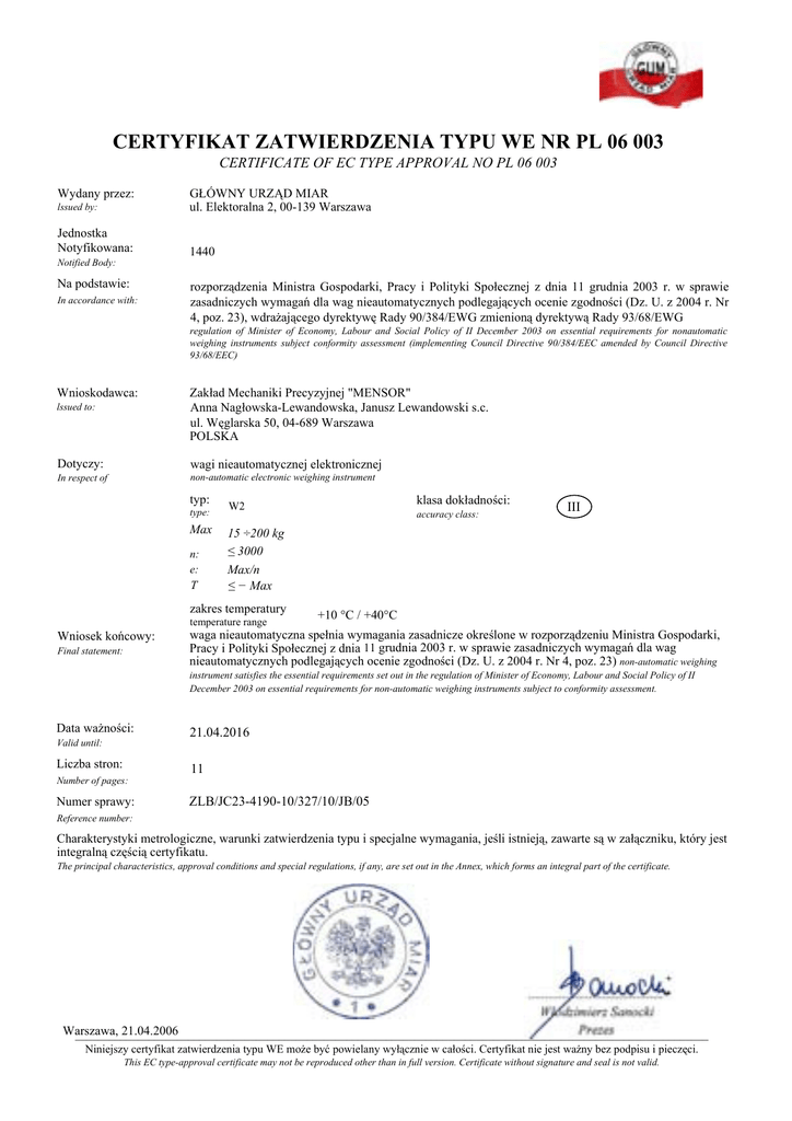 CERTYFIKAT ZATWIERDZENIA TYPU WE NR PL 06 003 CERTIFICATE OF EC TYPE APPROVAL NO PL 06 003 lssued by: GŁÓWNY URZĄD MIAR ul. Elektoralna 2, 00-139 Warszawa Jednostka Notyfikowana: 1440 Wydany przez: Notified Body: Na podstawie: In accordance with: rozporządzenia Ministra Gospodarki, Pracy i Polityki Społecznej z dnia 11 grudnia 2003 r. w sprawie zasadniczych wymagań dla wag nieautomatycznych podlegających ocenie zgodności (Dz. U. z 2004 r. Nr 4, poz. 23), wdrażającego dyrektywę Rady 90/384/EWG zmienioną dyrektywą Rady 93/68/EWG regulation of Minister of Economy, Labour and Social Policy of II December 2003 on essential requirements for nonautomatic weighing instruments subject conformity assessment (implementing Council Directive 90/384/EEC amended by Council Directive 93/68/EEC) Wnioskodawca: lssued to: Zakład Mechaniki Precyzyjnej "MENSOR" Anna Nagłowska-Lewandowska, Janusz Lewandowski s.c. ul. Węglarska 50, 04-689 Warszawa POLSKA Dotyczy: wagi nieautomatycznej elektronicznej In respect of non-automatic electronic weighing instrument typ: type: Max n: e: T temperature range Final statement: accuracy class: III 15 ÷200 kg ≤ 3000 Max/n ≤ − Max zakres temperatury Wniosek końcowy: klasa dokładności: W2 +10 °C / +40°C waga nieautomatyczna spełnia wymagania zasadnicze określone w rozporządzeniu Ministra Gospodarki, Pracy i Polityki Społecznej z dnia 11 grudnia 2003 r. w sprawie zasadniczych wymagań dla wag nieautomatycznych podlegających ocenie zgodności (Dz. U. z 2004 r. Nr 4, poz. 23) non-automatic weighing instrument satisfies the essential requirements set out in the regulation of Minister of Economy, Labour and Social Policy of II December 2003 on essential requirements for non-automatic weighing instruments subject to conformity assessment. Data ważności: Valid until: Liczba stron: 21.04.2016 11 Number of pages: Numer sprawy: ZLB/JC23-4190-10/327/10/JB/05 Reference number: Charakterystyki metrologiczne, warunki zatwierdzenia typu i specjalne wymagania, jeśli istnieją, zawarte są w załączniku, który jest integralną częścią certyfikatu. The principal characteristics, approval conditions and special regulations, if any, are set out in the Annex, which forms an integral part of the certificate. Warszawa, 21.04.2006 ________________________________________________________________________________________________________________ Niniejszy certyfikat zatwierdzenia typu WE może być powielany wyłącznie w całości. Certyfikat nie jest ważny bez podpisu i pieczęci. This EC type-approval certificate may not be reproduced other than in full version. Certificate without signature and seal is not valid. GŁÓWNY URZĄD MIAR Strona 2 z 11 Page 2 of 11 pages ZAŁĄCZNIK DO CERTYFIKATU ZATWIERDZENIA TYPU WE NR PL 06 003 z dnia 21.04.2006 r. DESCRIPTIVE ANNEX TO CERTIFICATE OF EC TYPE APPROVAL NO PL 06 003 dated 21.04.2006 1 NAZWA I TYP PRZYRZĄDU POMIAROWEGO Typoszereg wag nieautomatycznych elektronicznych W2. Typoszereg ten obejmuje wagi elektroniczne ogólnego przeznaczenia i wagi elektroniczne medyczne: - wagi elektroniczne ogólnego przeznaczenia: WM15P, WM30P, WM60P, WM150P - wagi elektroniczne medyczne: WM15 (do ważenia niemowląt), WE20 (do ważenia niemowląt), WM150P(K) (do ważenia pacjentów w pozycji siedzącej), WE150M (osobowa z mechanicznym pomiarem wzrostu), WE150W (osobowa z elektronicznym pomiarem wzrostu) WE200M (osobowa z mechanicznym pomiarem wzrostu). Każda z wag reprezentujących typoszereg może występować w kilku odmianach różniących się usytuowaniem wyświetlacza, rozmiarem nośni ładunku oraz liczbą wyświetlaczy (jeden lub dwa). Ponadto wagi elektroniczne ogólnego przeznaczenia mogą występować w wersjach przewidzianych do stosowania przy sprzedaży konsumenckiej lub w wersjach, które nie są przewidziane do tego rodzaju zastosowania. Poszczególne odmiany wag mogą być identyfikowane oznaczeniami cyfrowymi występującymi na końcu, po symbolu wagi. Przykłady wag typoszeregu W2 pokazano na rysunkach 1 ÷ 8. 2 OPIS BUDOWY I DZIAŁANIA 2.1 Urządzenia i funkcje W wagach typoszeregu W2 występują następujące urządzenia (odniesienie do odpowiednich punktów normy PN-EN 45501:1999 podano w nawiasie): - urządzenie podtrzymujące zero (T.2.7.3), - urządzenie zerujące inicjujące (T.2.7.2.4), - urządzenie tarujące półautomatyczne odejmujące (T.2.7.4). 2.2 Budowa 2.2.1 Układ mechaniczny Układ mechaniczny wagi składa się z: - nośni ładunku, - przetwornika pomiarowego, - wspornika wykonanego w formie płyty lub ramy pośredniczącej, przenoszącego obciążenie z nośni ładunku do przetwornika pomiarowego, - podstawy wagi z wspornikami poziomującymi i poziomnicą. W wagach elektronicznych ogólnego przeznaczenia nośnia ładunku wykonana jest w formie platformy płaskiej. W wagach elektronicznych medycznych nośnia ładunku ma postać platformy płaskiej (wagi osobowe), uformowanej w kształcie kołyski (wagi niemowlęce) lub fotela inwalidzkiego (wagi do ważenia pacjentów w pozycji siedzącej). We wszystkich wagach typoszeregu nośnia ładunku podparta jest na jednym przetworniku pomiarowym. W wagach magazynowych przewiduje się stosowanie nośni ładunku o wymiarach 300x400 mm, 400x500 mm i 500x900 mm. ________________________________________________________________________________________________________________ Niniejszy certyfikat zatwierdzenia typu WE może być powielany wyłącznie w całości. Certyfikat nie jest ważny bez podpisu i pieczęci. This EC type-approval certificate may not be reproduced other than in full version. Certificate without signature and seal is not valid. GŁÓWNY URZĄD MIAR Page 3 of 11 pages ZAŁĄCZNIK DO CERTYFIKATU ZATWIERDZENIA TYPU WE NR PL 06 003 z dnia 21.04.2006 r. DESCRIPTIVE ANNEX TO CERTIFICATE OF EC TYPE APPROVAL NO PL 06 003 dated 21.04.2006 Zespół odczytowy może być w różny sposób usytuowany względem nośni ładunku. Przewiduje się następ