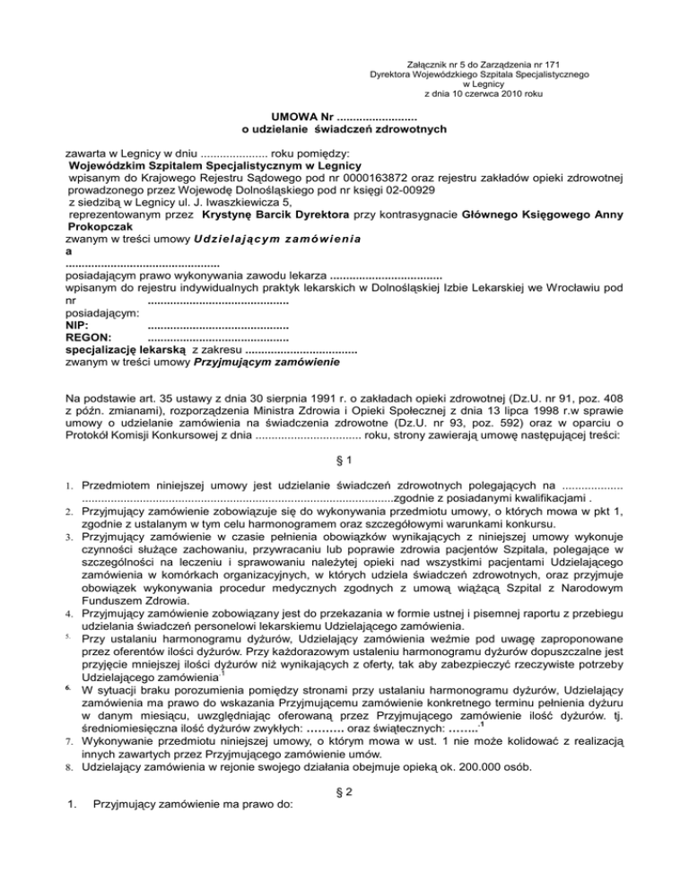 Załącznik nr 5 do Zarządzenia nr 171 Dyrektora Wojewódzkiego Szpitala Specjalistycznego w Legnicy z dnia 10 czerwca 2010 roku UMOWA Nr ......................... o udzielanie świadczeń zdrowotnych zawarta w Legnicy w dniu ..................... roku pomiędzy: Wojewódzkim Szpitalem Specjalistycznym w Legnicy wpisanym do Krajowego Rejestru Sądowego pod nr 0000163872 oraz rejestru zakładów opieki zdrowotnej prowadzonego przez Wojewodę Dolnośląskiego pod nr księgi 02-00929 z siedzibą w Legnicy ul. J. Iwaszkiewicza 5, reprezentowanym przez Krystynę Barcik Dyrektora przy kontrasygnacie Głównego Księgowego Anny Prokopczak zwanym w treści umowy U d z ie l aj ąc y m z amó w i e n ia a ................................................ posiadającym prawo wykonywania zawodu lekarza ................................... wpisanym do rejestru indywidualnych praktyk lekarskich w Dolnośląskiej Izbie Lekarskiej we Wrocławiu pod nr ............................................ posiadającym: NIP: ............................................ REGON: ............................................ specjalizację lekarską z zakresu ................................... zwanym w treści umowy Przyjmującym zamówienie Na podstawie art. 35 ustawy z dnia 30 sierpnia 1991 r. o zakładach opieki zdrowotnej (Dz.U. nr 91, poz. 408 z późn. zmianami), rozporządzenia Ministra Zdrowia i Opieki Społecznej z dnia 13 lipca 1998 r.w sprawie umowy o udzielanie zamówienia na świadczenia zdrowotne (Dz.U. nr 93, poz. 592) oraz w oparciu o Protokół Komisji Konkursowej z dnia ................................. roku, strony zawierają umowę następującej treści: §1 1. Przedmiotem niniejszej umowy jest udzielanie świadczeń zdrowotnych polegających na ................... .................................................................................................zgodnie z posiadanymi kwalifikacjami . 2. Przyjmujący zamówienie zobowiązuje się do wykonywania przedmiotu umowy, o których mowa w pkt 1, zgodnie z ustalanym w tym celu harmonogramem oraz szczegółowymi warunkami konkursu. 3. Przyjmujący zamówienie w czasie pełnienia obowiązków wynikających z niniejszej umowy wykonuje czynności słuŜące zachowaniu, przywracaniu lub poprawie zdrowia pacjentów Szpitala, polegające w szczególności na leczeniu i sprawowaniu naleŜytej opieki nad wszystkimi pacjentami Udzielającego zamówienia w komórkach organizacyjnych, w których udziela świadczeń zdrowotnych, oraz przyjmuje obowiązek wykonywania procedur medycznych zgodnych z umową wiąŜącą Szpital z Narodowym Funduszem Zdrowia. 4. Przyjmujący zamówienie zobowiązany jest do przekazania w formie ustnej i pisemnej raportu z przebiegu udzielania świadczeń personelowi lekarskiemu Udzielającego zamówienia. 5. Przy ustalaniu harmonogramu dyŜurów, Udzielający zamówienia weźmie pod uwagę zaproponowane przez oferentów ilości dyŜurów. Przy kaŜdorazowym ustaleniu harmonogramu dyŜurów dopuszczalne jest przyjęcie mniejszej ilości dyŜurów niŜ wynikających z oferty, tak aby zabezpieczyć rzeczywiste potrzeby .1 Udzielającego zamówienia 6. W sytuacji braku porozumienia pomiędzy stronami przy ustalaniu harmonogramu dyŜurów, Udzielający zamówienia ma prawo do wskazania Przyjmującemu zamówienie konkretnego terminu pełnienia dyŜuru w danym miesiącu, uwzględniając oferowaną przez Przyjmującego zamówienie ilość dyŜurów. tj. .1 średniomiesięczna ilość dyŜurów zwykłych: ………. oraz świątecznych: …….. 7. Wykonywanie przedmiotu niniejszej umowy, o którym mowa w ust. 1 nie moŜe kolidować z realizacją innych zawartych przez Przyjmującego zamówienie umów. 8. Udzielający zamówienia w rejonie swojego działania obejmuje opieką ok. 200.000 osób. §2 1. Przyjmujący zamówienie ma prawo do: a) kierowania pacjentów na badania diagnostyczne, konsultacje i zabiegi rehabilitacyjne oraz do innych oddziałów szpitalnych Udzielającego Zamówienia, b) wzywania na konsultacje innych lekarzy Udzielającego zamówienia, 2. Udzielający zamówienia upowaŜnia Przyjmującego zamówienie do kierowania pacjentów na dalsze leczenie do innych jednostek opieki zdrowotnej w razie takiej konieczności. 3. Przyjmujący zamówienie ponosi odpowiedzialność za osobiste ordynowanie leków, materiałów medycznych, środków leczniczych i pomocniczych, wykonywane zabiegi oraz za swoje działania lub zaniechania. § 3* 1. Przyjmujący zamówienie oświadcza, iŜ przedmiotowe świadczenia wykonywane będą przez osoby posiadające fachowe kwalifikacje wymagane odrębnymi przepisami, w liczbie niezbędnej do kompleksowego zabezpieczenia wykonania tych świadczeń, zgodnie z aktualnym stanem wiedzy medycznej, ogólnie przyjętymi zasadami etyki lekarskiej i naleŜytą starannością. 2. Udzielający zamówienia zastrzega sobie prawo nie wyraŜenia zgody – w uzasadnionych przypadkach – na wykonanie świadczeń przez konkretną osobę Przyjmującego zamówienie, wskazaną w grafiku tj. w sytuacji powtarzających się, uzasadnionych skarg pacjentów, personelu Udzielającego zamówienia, naruszania obowiązków, zasad etycznych. 3. Wykaz ilościowy osób wraz z określeniem ich uprawnień i kwalifikacji stanowi załącznik nr 2 do niniejszej umowy. § 3* 1. Dokumenty lub ich kserokopie, potwierdzające uprawnienia Przyjmującego zamówienie do udzielania świadczeń zdrowotnych stanowią integralną część umowy. 2. Przyjmujący zamówienie zobowiązuje się do udzielania świadczeń zdrowotnych zgodnie z aktualnym stanem wiedzy medycznej, ogólnie przyjętymi zasadami etyki medycznej i naleŜytą starannością. 3. Przyjmujący zamówienie oświadcza, Ŝe posiada zezwolenie na wykonywanie indywidualnej praktyki lekarskiej/grupowej praktyki lekarskiej oraz legitymuje się fachowymi kwalifikacjami do udzielania świadczeń zdrowotnych w zakresie, o którym mowa w § 1. §4 Udzielający zamówienia zobowiązuje s