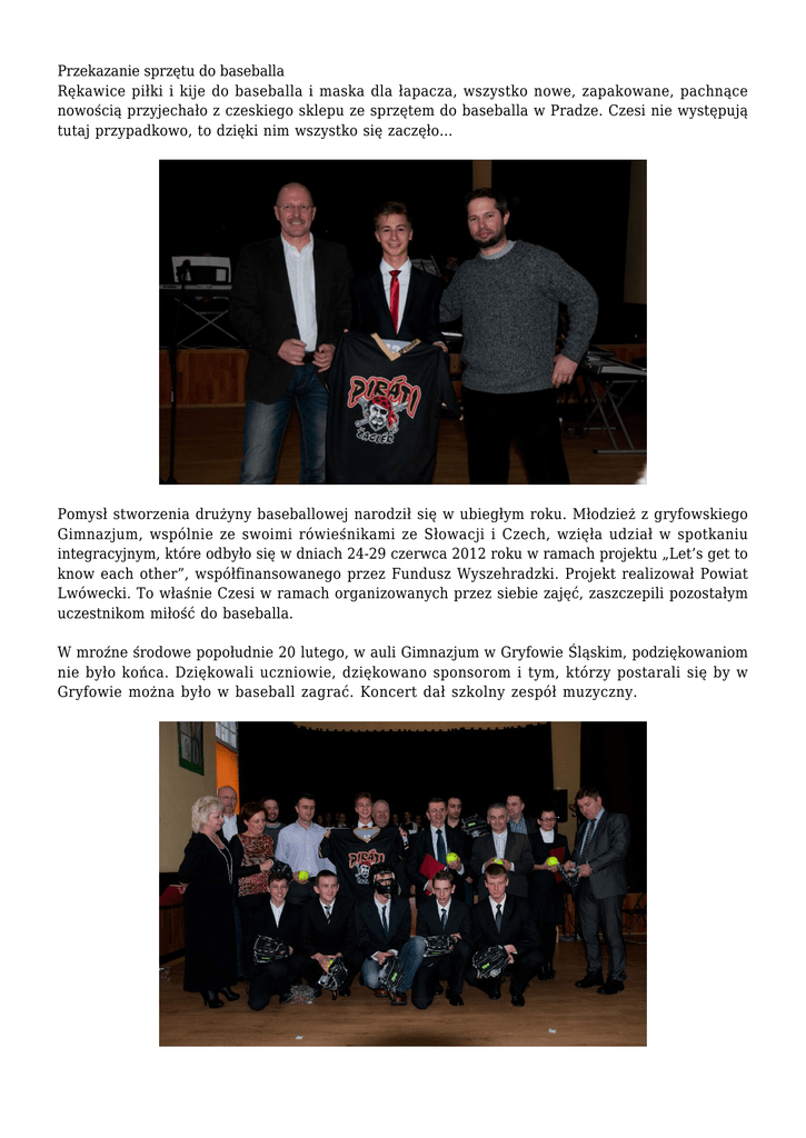 Przekazanie sprzętu do baseballa Rękawice piłki i kije do baseballa i maska dla łapacza, wszystko nowe, zapakowane, pachnące nowością przyjechało z czeskiego sklepu ze sprzętem do baseballa w Pradze. Czesi nie występują tutaj przypadkowo, to dzięki nim wszystko się zaczęło… Pomysł stworzenia drużyny baseballowej narodził się w ubiegłym roku. Młodzież z gryfowskiego Gimnazjum, wspólnie ze swoimi rówieśnikami ze Słowacji i Czech, wzięła udział w spotkaniu integracyjnym, które odbyło się w dniach 24-29 czerwca 2012 roku w ramach projektu „Let’s get to know each other”, współfinansowanego przez Fundusz Wyszehradzki. Projekt realizował Powiat Lwówecki. To właśnie Czesi w ramach organizowanych przez siebie zajęć, zaszczepili pozostałym uczestnikom miłość do baseballa. W mroźne środowe popołudnie 20 lutego, w auli Gimnazjum w Gryfowie Śląskim, podziękowaniom nie było końca. Dziękowali uczniowie, dziękowano sponsorom i tym, którzy postarali się by w Gryfowie można było w baseball zagrać. Koncert dał szkolny zespół muzyczny. Aż szkoda, że pogoda nie pozwoliła wypróbować zakupionego sprzętu… Dzięki zaangażowaniu Małgorzaty Szczepańskiej, Daniela Koko i Arkadiusza Cichonia udało zebrać się potrzebne pieniądze od sponsorów i z pomocą czeskich przyjaciół zakupić sprzęt. Teraz nie pozostaje nic więcej jak poczekać na wiosnę i zacząć trenować…, a nie będzie łatwo, bo Czesi grają w baseball od wielu lat i są jednymi z najlepszych w Europie. Pierwszy polsko –czeski mecz odbędzie się prawdopodobnie w maju br. Lista sponsorów wygląda następująco: ● ● ● ● ● ● ● ● ● ● ● Państwo Teresa i Tadeusz Matusewiczowie - Budowa Maszyn Sp.j. z Gryfowa Śląskiego; Państwo Sylwia i Ireneusz Krasuccy - Zakład Piekarniczo – Cukierniczy "KRASUCKI" Sp. z o.o. z Gryfowa Śląskiego; Państwo Anna i Dominik Korpysowie - Jantur Gryfex Sp. z o.o. z Gryfowa Śląskiego; Państwo Mirosława i Jerzy Horbaczowie - Piekarnia Cukiernia M & J Horbacz Jerzy Horbacz z Gryfowa Śląskiego; Pan Stanisław Sawczak - Hurtownia Spożywczo-Monopolowa w Gryfowie Śląskim; Pani Jolanta Dudzik; Pani Iwona Wasilewska; Pani Małgorzata Szczepańska; Pan Daniel Koko; Pani Barbara Rosochacka – Horanin; Pan Arkadiusz Cichoń; Jeszcze raz w imieniu uczniów i nauczycieli Gimnazjum w Gryfowie Śląskim serdecznie dziękujemy. Gospodarzem uroczystości była Alicja Kownacka – dyrektor szkoły. W spotkaniu udział wzięli uczniowie Gimnazjum, sponsorzy, nauczyciele, przedstawiciele władz samorządu gminnego i powiatowego w osobach starosty lwóweckiego – Józefa Mrówki i burmistrza Gryfowa – Olgierda Poniźnika. Nie zabrakło gości z czeskiego Zaclerza, których reprezentował burmistrz Miroslav Vlasak oraz Filip Prochazka – miłośnik baseballa i zarazem opiekun czeskiej grupy biorącej udział w spotkaniu młodzieży. Po części oficjalnej długo jeszcze rozmawiano o planach na przyszłość związanych z baseballem. Galeria zdjęć FOT. Paweł Rubaj